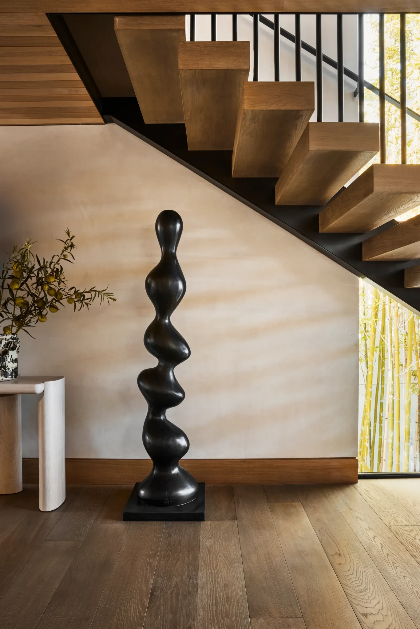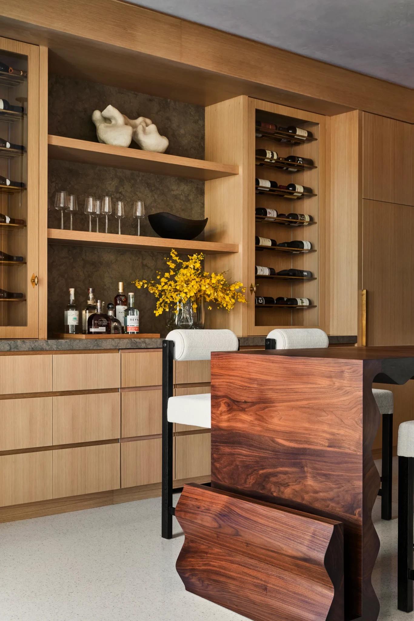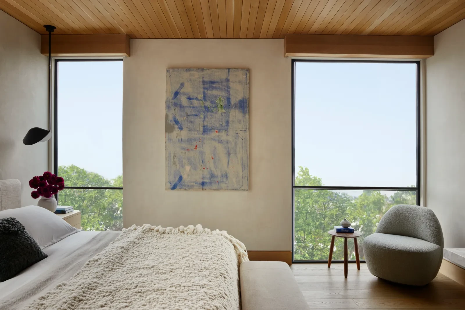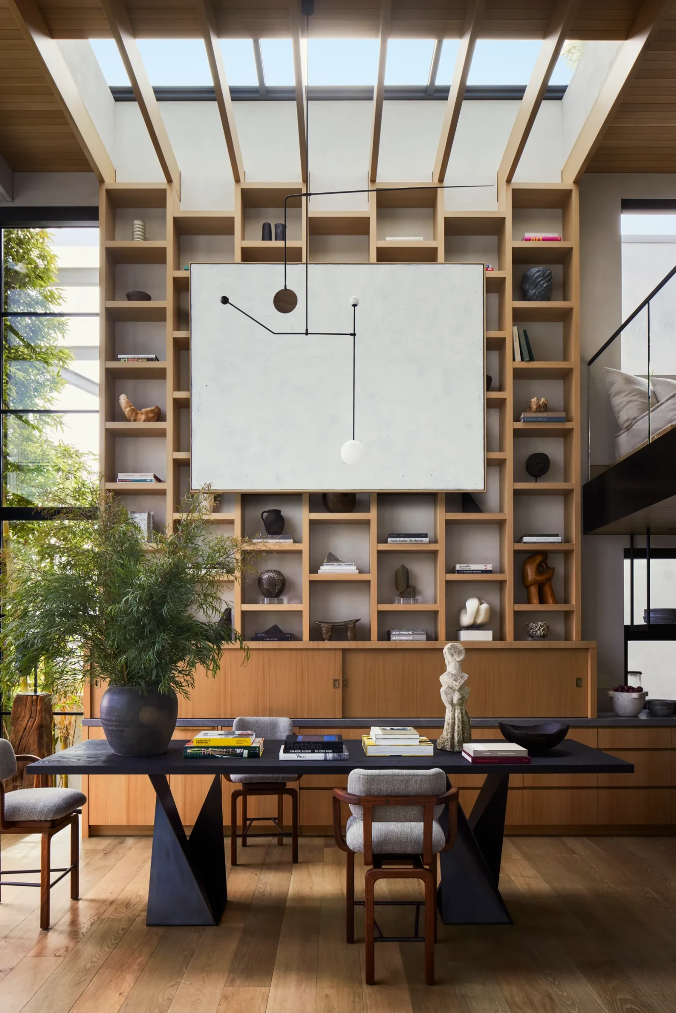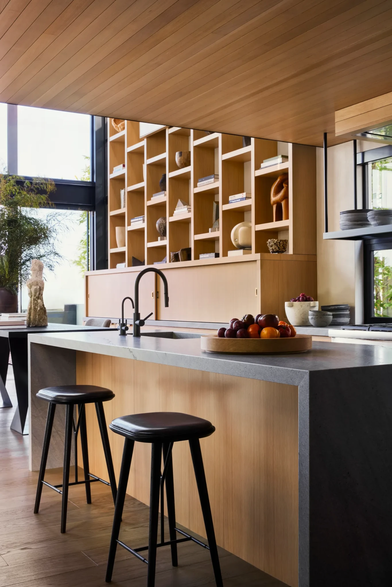 Η συνεργασία με τον αρχιτέκτονα Anders Lasater υπήρξε καθοριστική. Μαζί επαναπροσδιόρισαν τα δομικά στοιχεία, ισορροπώντας τις αναλογίες και χαρίζοντας στην κατοικία μια αίσθηση ισορροπημένης συμμετρίας. Εμβληματικό στοιχείο αποτελεί η μεγάλη ξύλινη επένδυση που λειτουργεί ταυτόχρονα ως γκαλερί τέχνης, coffee bar και χώρος αποθήκευσης, μια σύνθεση που συνδυάζει πρακτικότητα, λειτουργία και αισθητική ευαισθησία σε ένα ενιαίο σύνολο.