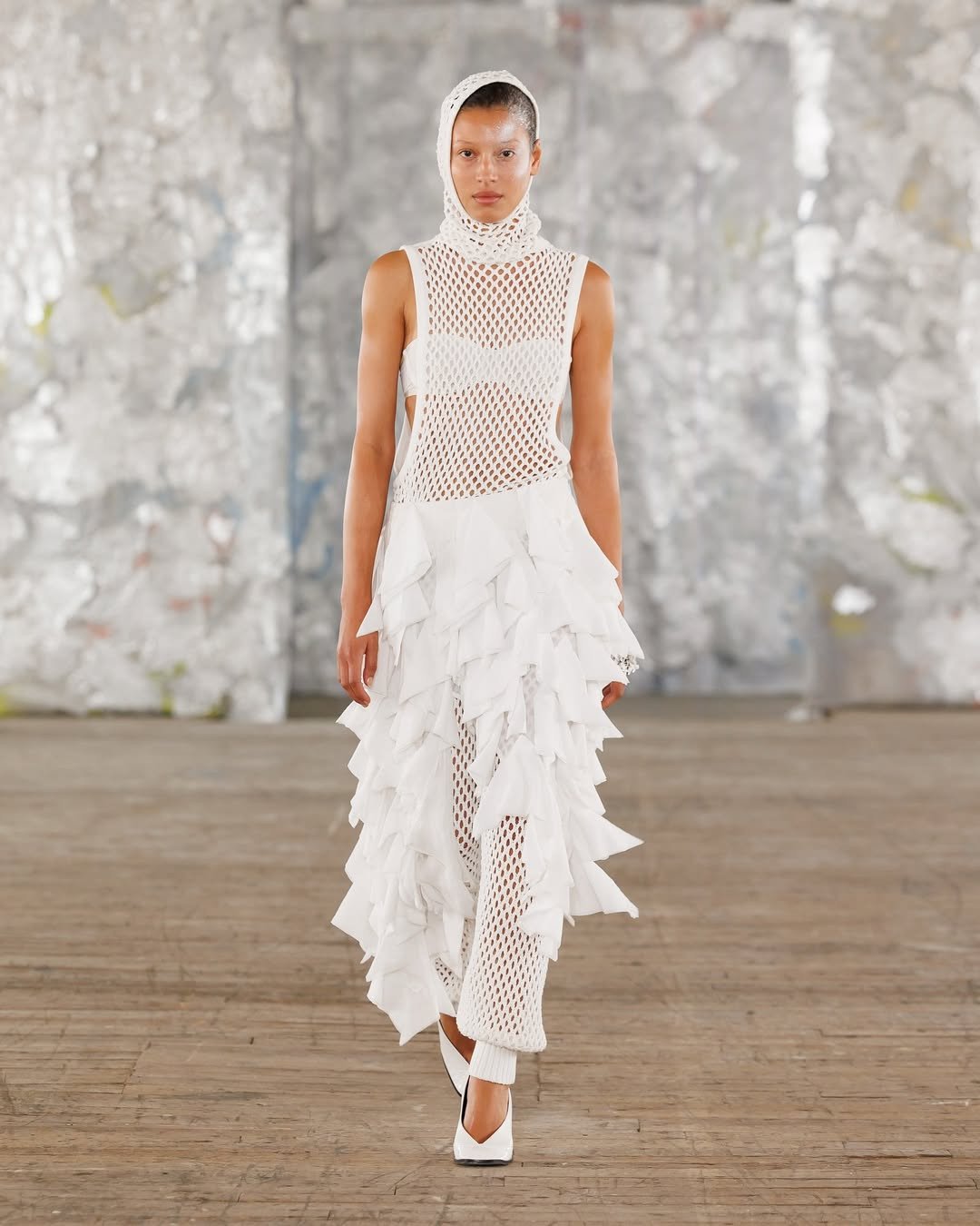 Μία από τις πιο ενδιαφέρουσες φετινές παρουσίες στη London Fashion Week 2025. Η Grete Henriette, στη συλλογή της “Elysium”, παρουσίασε ένα σύμπαν σχεδίων γεμάτο μυθολογικά στοιχεία, θεϊκή θηλυκότητα και natural αισθητική. Στην πασαρέλα είδαμε figure hugging crochet, beading και draping, με τα κομμάτια να μοιάζουν με «κοσμικές πανοπλίες» - ένα μείγμα αρρενωπού και θηλυκού, με έμφαση στο χειροποίητο στοιχείο.