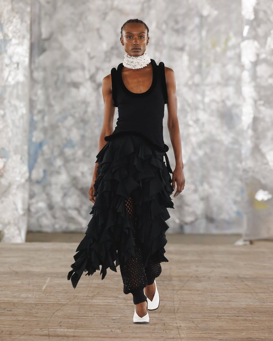 Ένας νεότερος σχεδιαστής με έδρα το Λονδίνο, που σταδιακά διαμορφώνει το δικό του στίγμα. Τα σχέδιά του συχνά αντλούν έμπνευση από τη μουσική σκηνή και την ατμόσφαιρα της λάμψης των ’70s και των ’90s, με στοιχεία όπως κρόσσια, studs, έντονες λεπτομέρειες στα παντελόνια και υφές που παίζουν με την αντίθεση. Στην πασαρέλα της S/S 2025 season, η συλλογή του Antonio Vattev ξεχώρισε για την ικανότητά της να γεφυρώνει το glam-rock με το avant-garde tailoring, δημιουργώντας κομμάτια που είτε επιλέγουμε να τα φορέσουμε είτε θαυμάζονται ως τέχνη.