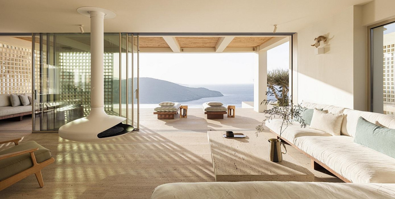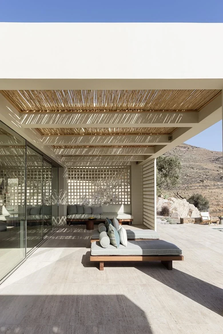 Η σύγχρονη εξοχική κατοικία στην Τήνο δημιουργήθηκε από το Studio Kontodimas και βρίσκεται στη δυτική πλευρά του νησιού της. Διακριτικά φωλιασμένη στην πλαγιά ενός λόφου, η βίλα 250 τετραγωνικών μέτρων είναι προσανατολισμένη προς τη θέα στον όρμο του Αγίου Πέτρου και την όμορφη παραλία του και αντλεί έμπνευση από τη γήινη φύση της τοπικής αρχιτεκτονικής. Η εκπληκτική θέα στο Αιγαίο Πέλαγος φιλτράρεται μέσα από σίτες, που παρέχουν προστασία από την ηλιακή ακτινοβολία, καθώς και φυσικό αερισμό.