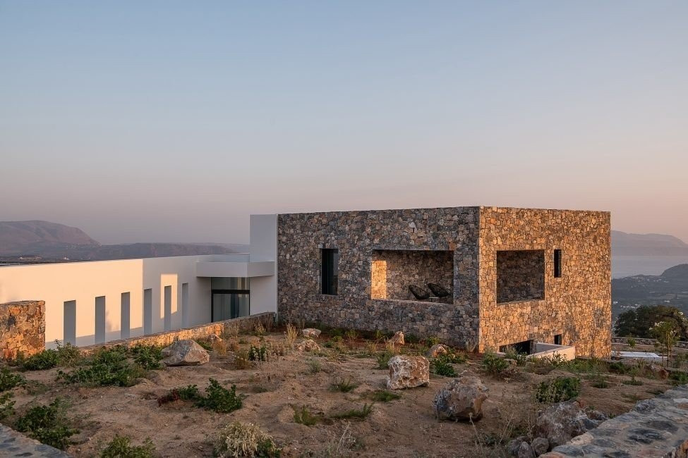Σε ένα επικλινές οικόπεδο στα Χανιά, με θέα τη θάλασσα και τα «Λευκά Όρη», σχεδιάστηκε και κατασκευάστηκε μια βίλα υψηλών λειτουργικών και αισθητικών προδιαγραφών. Κύριο χαρακτηριστικό της είναι οι καθαρές φόρμες, που ξεχωρίζουν από τη λεπτομέρεια στον σχεδιασμό και την υλοποίηση. Η πρόσβαση από το νότιο και ψηλότερο σημείο του οικοπέδου, αποκαλύπτει μόνο ένα μικρό μέρος του κτιρίου. Η πέτρα του οικοπέδου ντύνει τους μονολιθικούς όγκους που στέκονται κόντρα στην πλαγιά και ανοίγονται στη θέα. Ταυτόχρονα, εξασφαλίζουν ιδιωτικότητα για τον επισκέπτη και αρμονική ένταξη στο τοπίο.