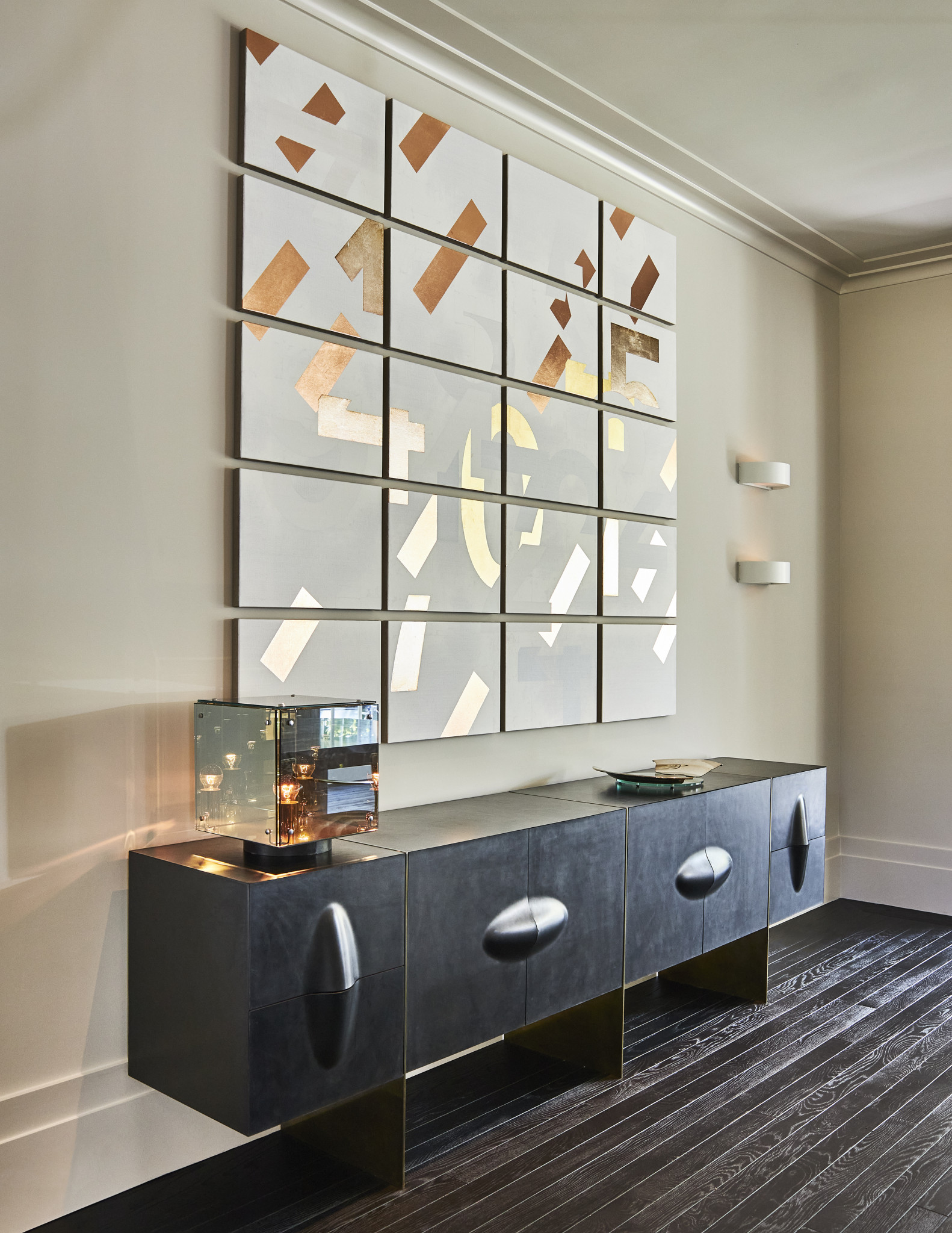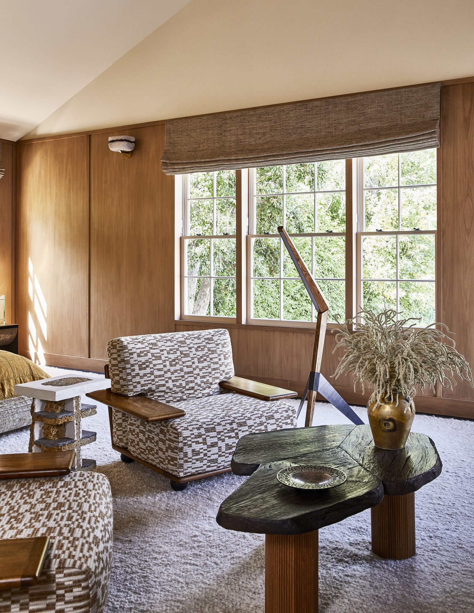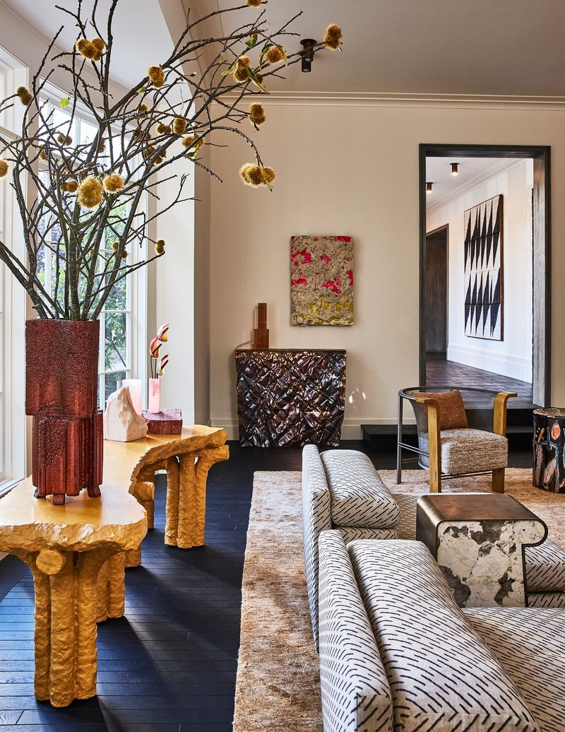 Η αγάπη της interior designer για τα υλικά και τις αντιθέσεις τους αποτυπώνεται σε κάθε λεπτομέρεια μέσα σε αυτό το σπίτι. Ξεκινώντας από το καθιστικό, εκεί η συνάντηση διαφορετικών εποχών και υφών στα υφάσματα συνθέτει μια cozy ατμόσφαιρα, με μια glam πινελιά που δεν περνά απαρατήρητη. Το δρύινο πάτωμα, το χαλί από μετάξι στο χρώμα του κεχριμπαριού και τα αντικείμενα σε τόνους του χαλκού συνδυάζονται αρμονικά και συνθέτουν έναν ενδιαφέροντα διάλογο ανάμεσα στο φως και στην ύλη. Γλυπτικά έπιπλα, επιλεγμένα artworks και redesigned vintage κομμάτια ενώνουν το παλιό με το νέο, χωρίς τίποτα να φαντάζει επιτηδευμένο. Ο χώρος αποτελεί ένα σκηνικό που ισορροπεί ανάμεσα στη νοσταλγία και το σύγχρονο σχεδιαστικό ύφος. Η Kelly Wearstler, άλλωστε, έχει τη μοναδική ικανότητα να κάνει το vintage να δείχνει μοντέρνο, προσδίδοντάς του χαρακτήρα.