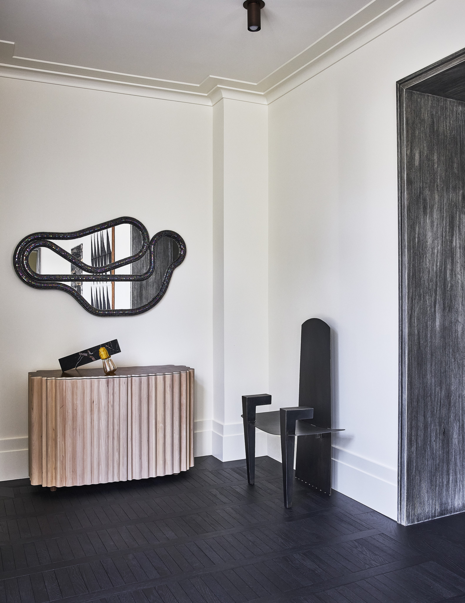 Το vibe, όμως, αλλάζει στο Game Room το οποίο διαφέρει από το υπόλοιπο σπίτι. Εκεί, η σχεδιάστρια επέλεξε μια πιο σκοτεινή χρωματική παλέτα, παραμένοντας ωστόσο προσηλωμένη στα luxurious υλικά. Ο καναπές “Le Bambole” από τη δεκαετία του ’70 -ένα iconic κομμάτι του οίκου B&B Italia- δημιουργεί ένα σκηνικό ήσυχης πολυτέλειας, ενώ το παιχνίδι ανάμεσα στο φως και στις σκιές που αυτό δημιουργεί δίνει στον χώρο μια κινηματογραφική, rock chic ατμόσφαιρα. Στην τραπεζαρία, τώρα, το εντυπωσιακό “rubber sideboard” -με την υπογραφή του Brian Thoreen- χαρίζει το απαραίτητο cool touch που η Wearstler πάντα ενσωματώνει στα έργα της. Πάνω από αυτό το έπιπλο, ένα gallery wall τραβάει τα βλέμματα και γίνεται ο πρωταγωνιστής του χώρου.