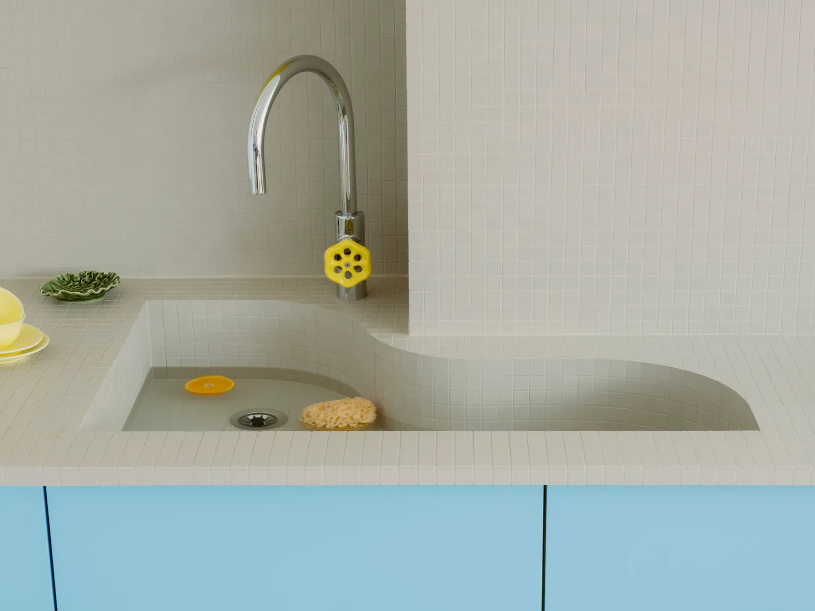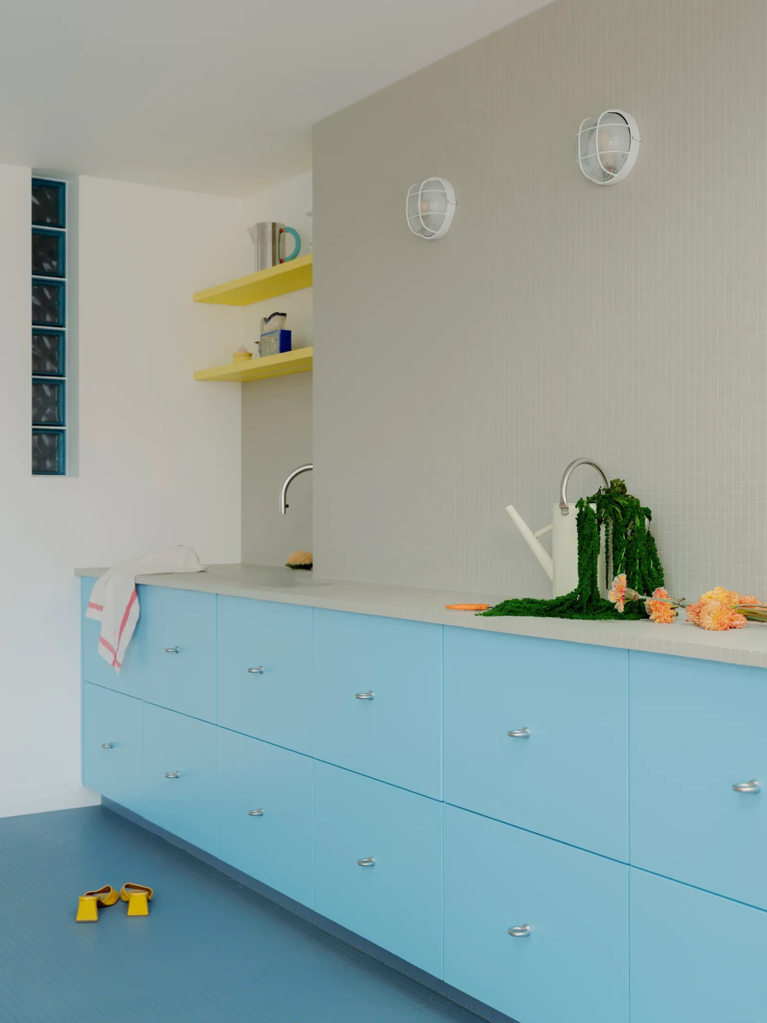Η κουζίνα, σχεδιασμένη σαν διάδρομος κολύμβησης, ενσωματώνει το παιχνίδι των χρωμάτων και των υλικών. Τα μπλε μωσαϊκά παραπέμπουν σε νερά πισίνας, ενώ ο διάδρομος σε κίτρινες αποχρώσεις δημιουργεί μια διακριτική σύνδεση με τα πρωταρχικά χρώματα των μοντερνιστών, επεξεργασμένα όμως με ζεστή, vanilla απόχρωση.