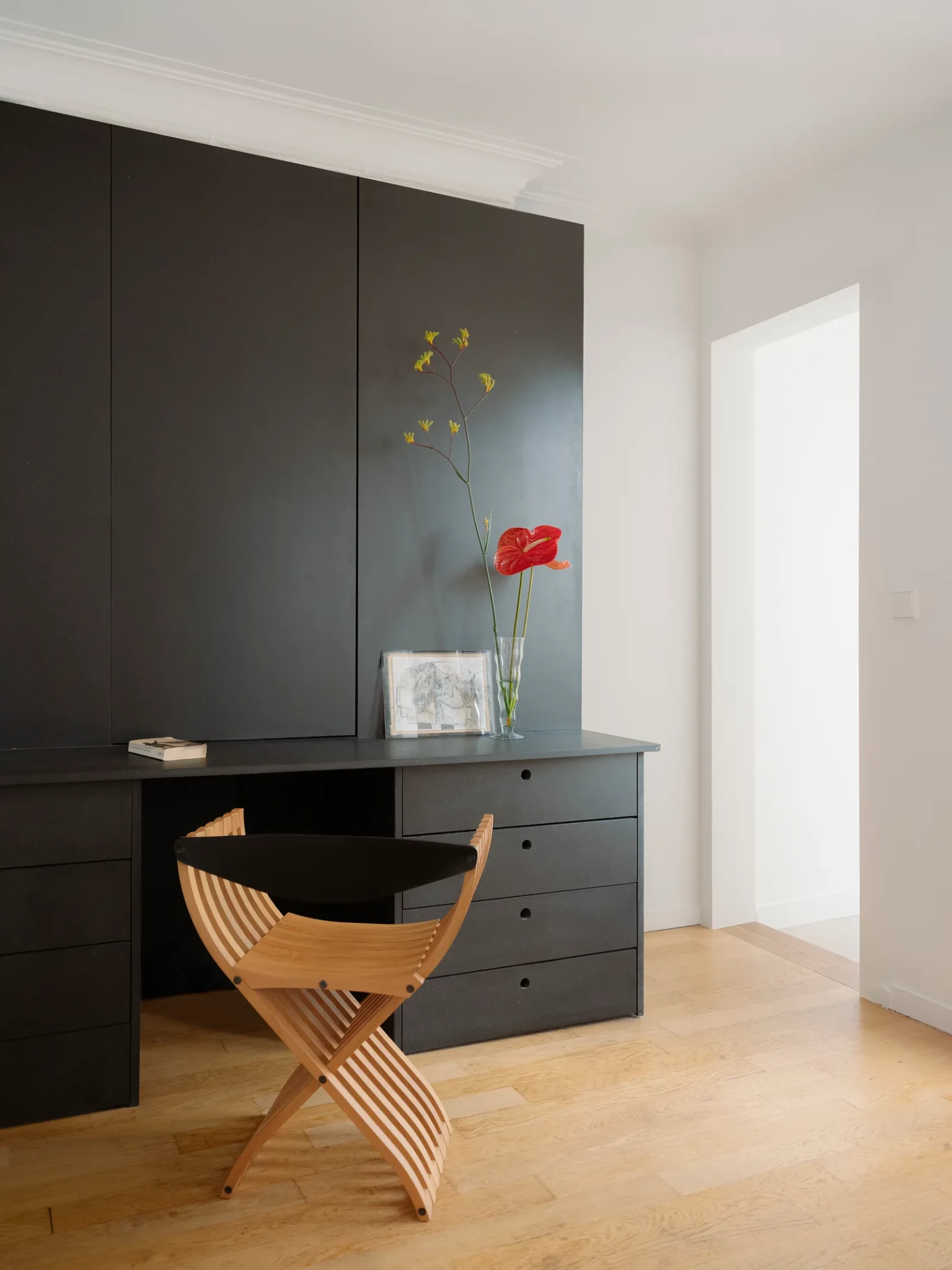 Η μεταβατική αυτή εμπειρία συνεχίζεται μέχρι την κρεβατοκάμαρα, όπου τα σκούρα επίπεδα χρωμάτων απορροφούν το έντονο φυσικό φως, προσδίδοντας μια αίσθηση ηρεμίας και συγκέντρωσης.
