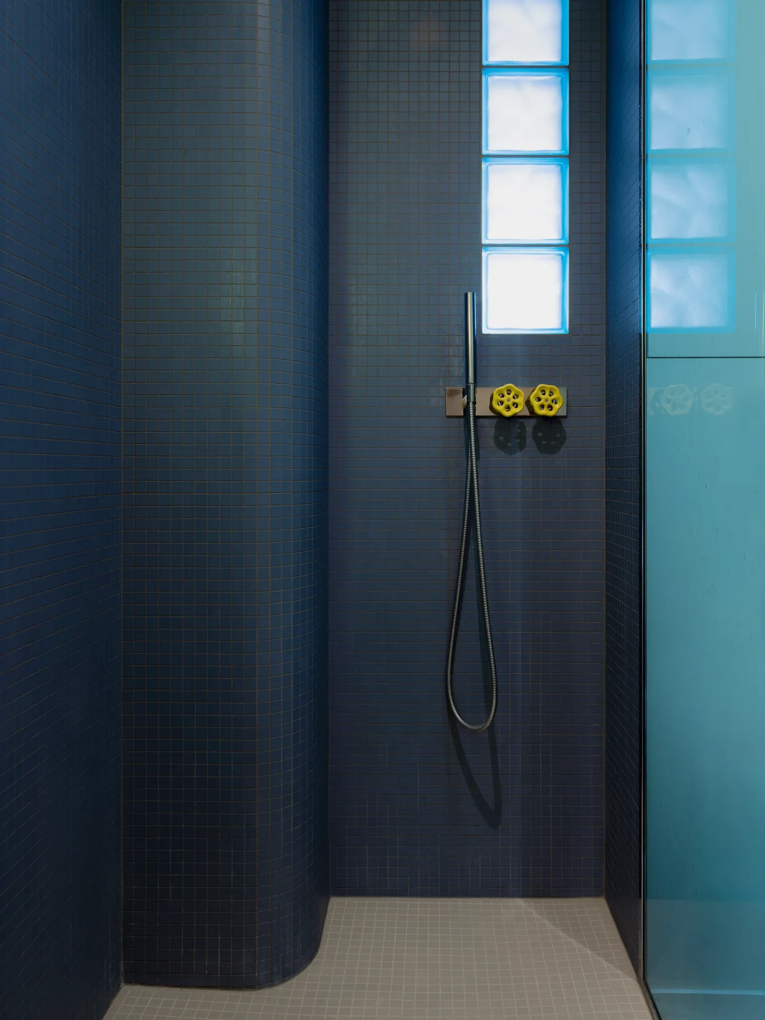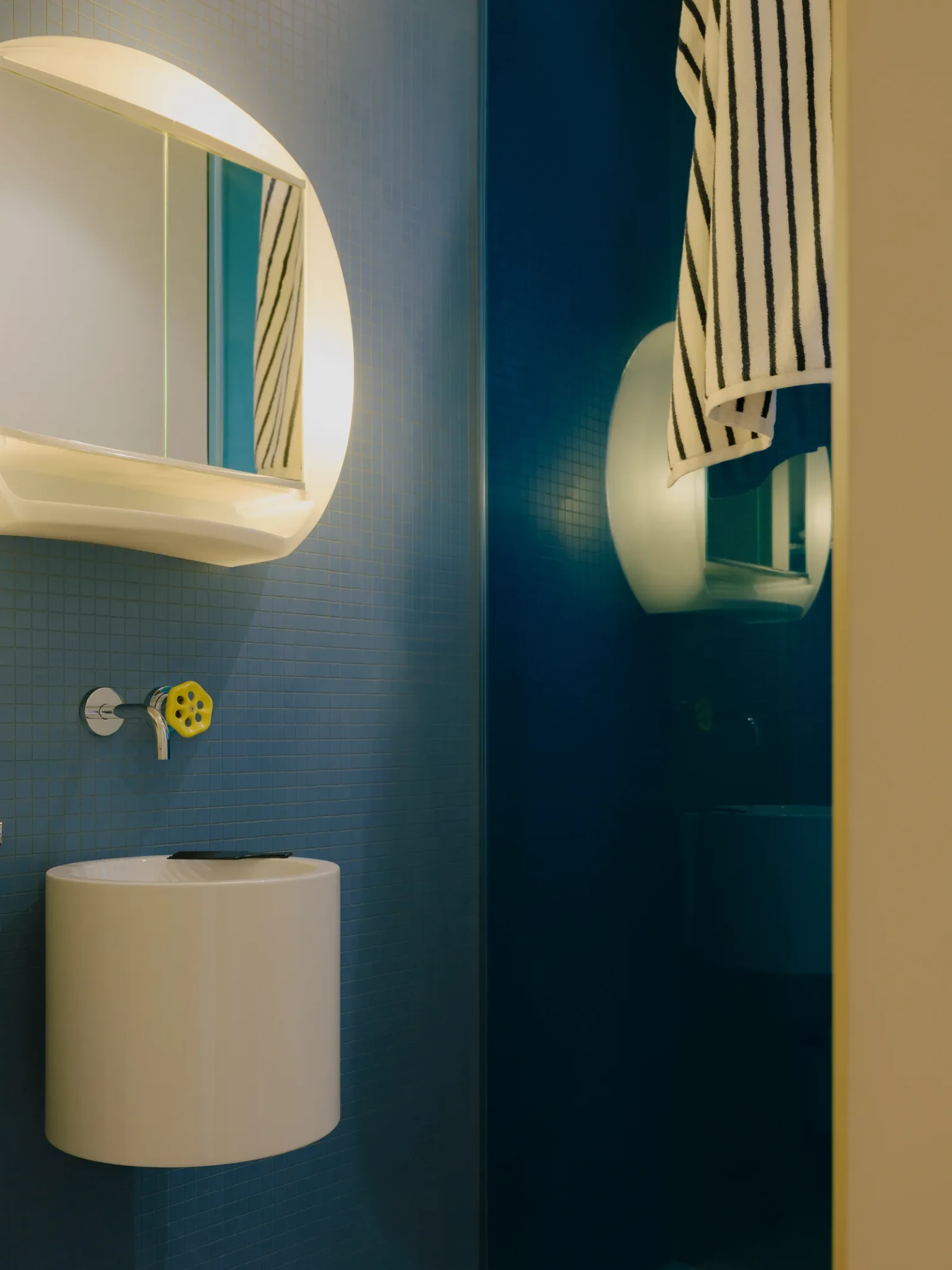 Το μπάνιο διατηρεί τη λογική της κουζίνας με μωσαϊκά σε μπλε πισίνας και γυάλινα διαχωριστικά που αντανακλούν το φως σε τόνους μπλε-αζούρ, φέρνοντας μεσογειακή ζεστασιά. Οι κίτρινες κεραμικές βρύσες λειτουργούν περισσότερο ως αισθητικά αντικείμενα, σε συνδυασμό με vintage καθρέφτες Pierre Paulin. Το δάπεδο σε γκρι μωσαϊκά και οι τοίχοι δημιουργούν μια ισορροπία με την υπόλοιπη χρωματική παλέτα του χώρου: μπλε, ροζ, κίτρινο και γκρι. Η είσοδος με εντοιχισμένες ντουλάπες και δρύινο δάπεδο δημιουργεί προοπτική και αίσθηση επέκτασης, ενώ η συνολική χρωματική και υλική σύνθεση συνδυάζει την παιχνιδιάρικη τόλμη με την αρμονία.
