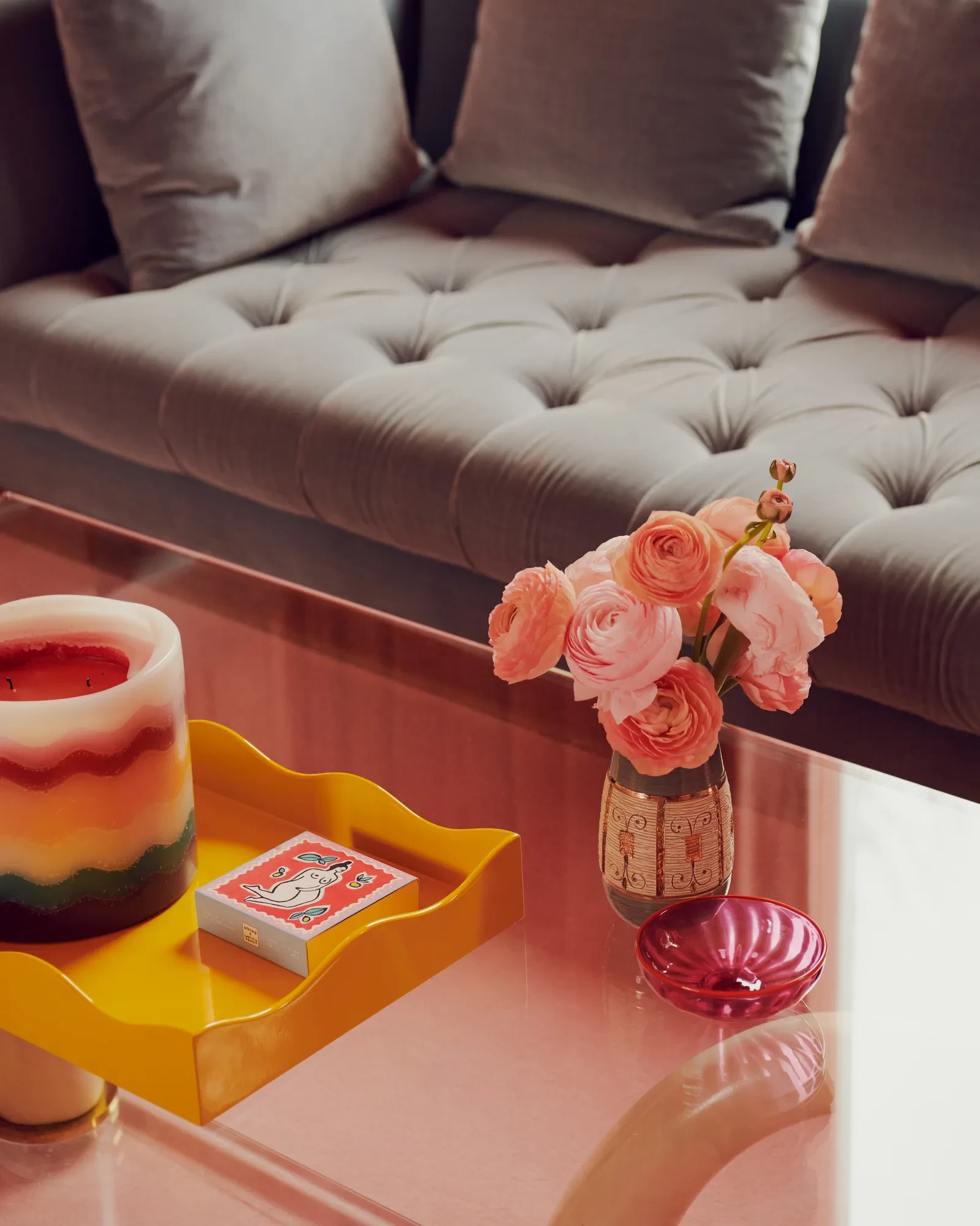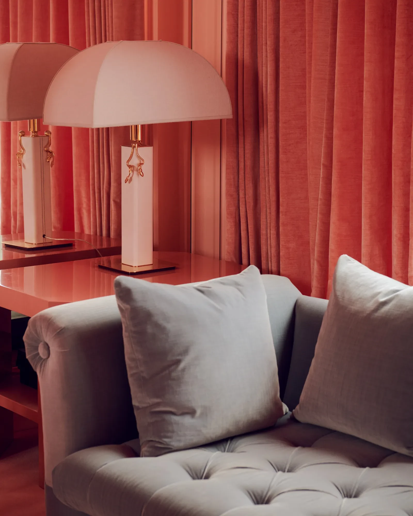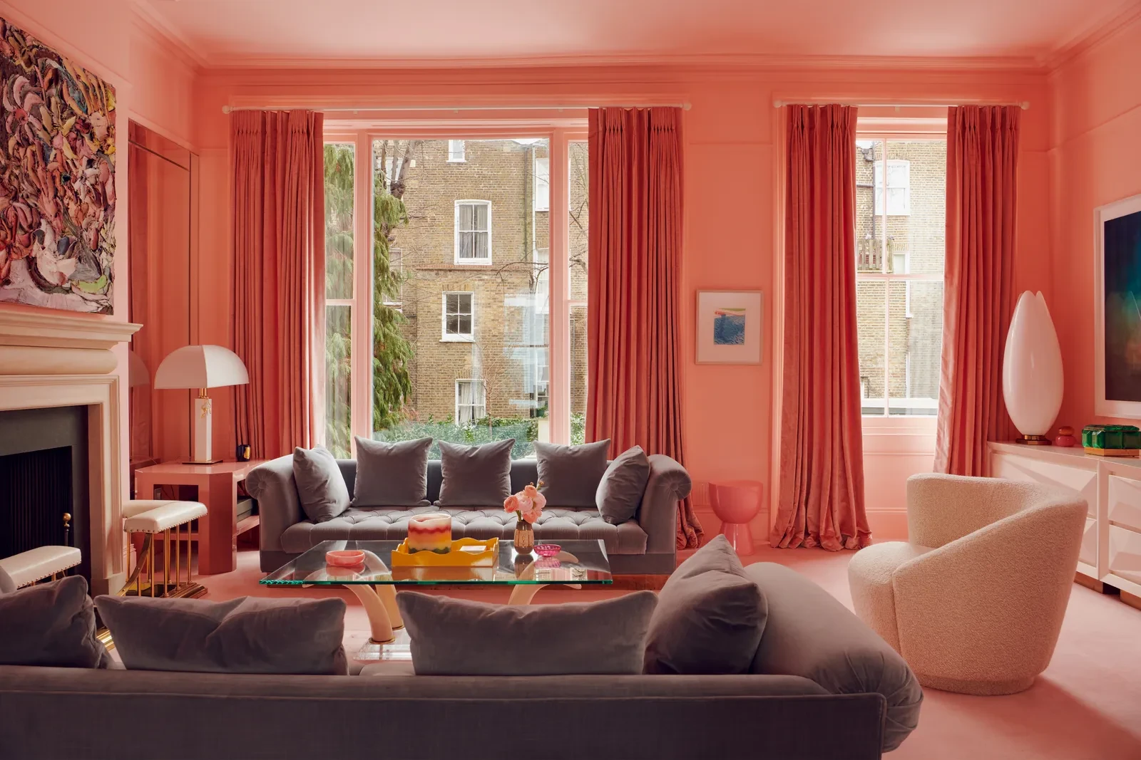 Το καθιστικό αποτελεί σημείο-κλειδί στη χρωματική ταυτότητα του σπιτιού. Η έμπνευση γεννήθηκε από δύο λακαρισμένα τραπέζια της δεκαετίας του 1980, τα οποία καθόρισαν τη διάθεση για έναν χώρο που τιμά τη νοσταλγία με σύγχρονη φινέτσα. Η Von Halle ήθελε να αποδώσει φόρο τιμής στη γιαγιά του συζύγου της, που διατηρούσε ένα ολορόδινο σαλόνι στα ’80s, γεμάτο θηλυκότητα και ροζ αποχρώσεις. Εδώ, οι σχεδιάστριες πειραματίστηκαν με ροζ, ροδακινί, πράσινα και απαλά κίτρινα, συνδυάζοντάς τα με έπιπλα-αντίκες από τη συλλογή του φημισμένου Ken Bolan. Οι καθρέφτες που πλαισιώνουν το τζάκι πολλαπλασιάζουν το φως, εντείνοντας τη θεατρικότητα και τη λάμψη του χώρου.