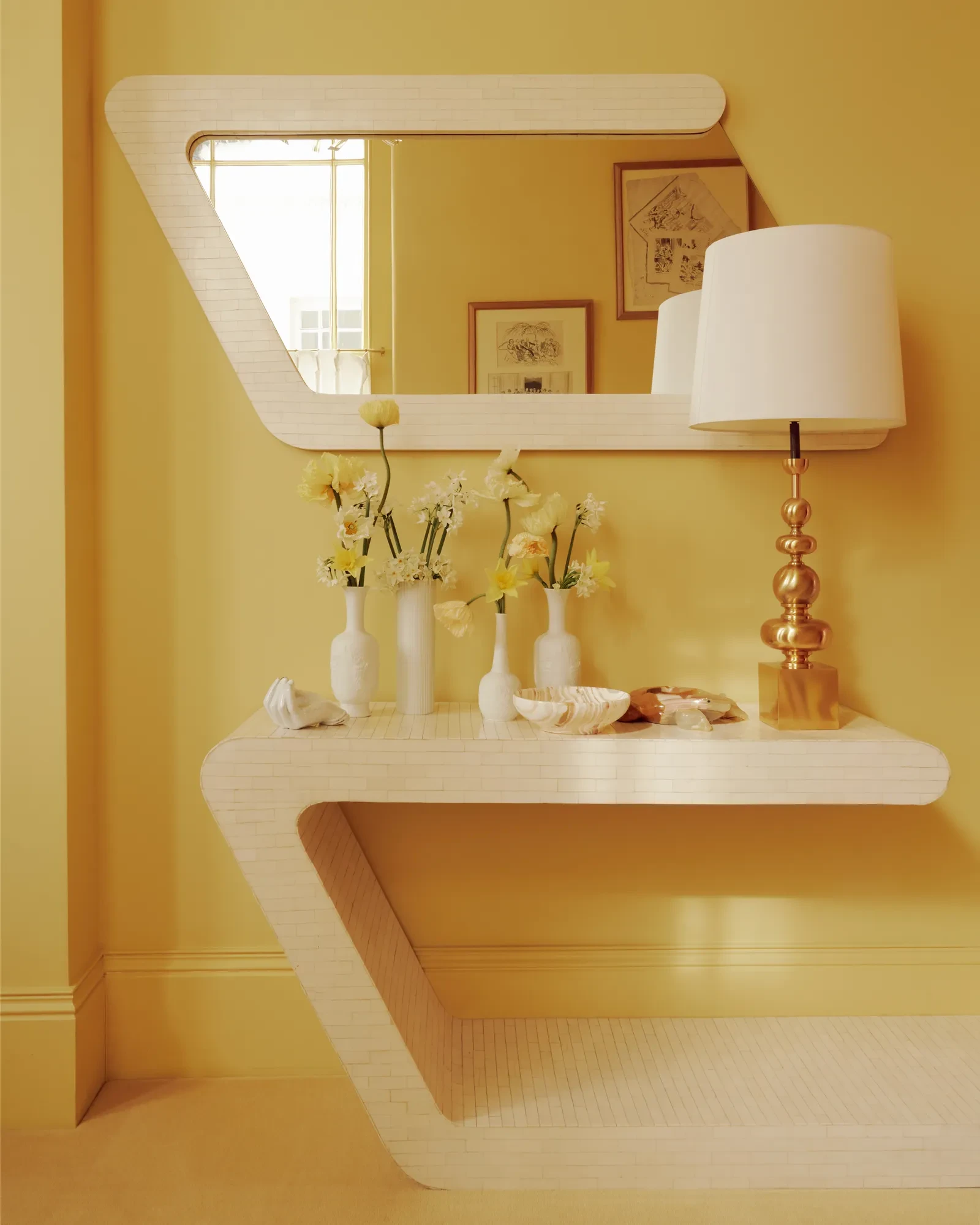 Το σπίτι της Olivia Von Halle στο Βόρειο Λονδίνο είναι μια ωδή στη δύναμη του χρώματος. Από την είσοδο κιόλας, ο επισκέπτης βυθίζεται σε μια πλημμύρα φωτεινών αποχρώσεων. Oι τοίχοι, οι σκάλες, τα δάπεδα και ακόμη και τα έπιπλα είναι καλυμμένα με ζωηρά κίτρινα, θυμίζοντας το λαμπερό φως του ήλιου. Το αποτέλεσμα είναι μια ατμόσφαιρα σχεδόν κινηματογραφική, όπου το έντονο φως και η χαρούμενη ενέργεια δίνουν την αίσθηση πως ο χώρος ζει και αναπνέει. Αντί για τον αναμενόμενο μινιμαλισμό, η Von Halle προτιμά ένα περιβάλλον πληθωρικό, κομψό και αισθητικά τολμηρό, όπου το χρώμα αναδεικνύεται σε πρωταγωνιστή και καθορίζει τη διάθεση του σπιτιού.