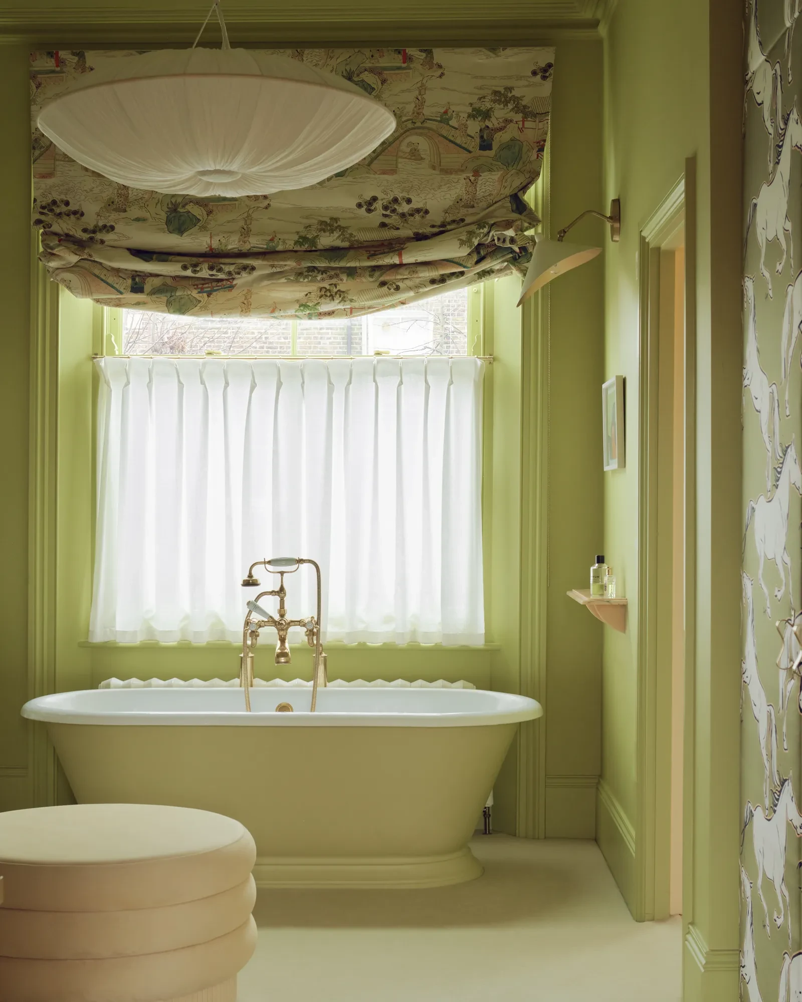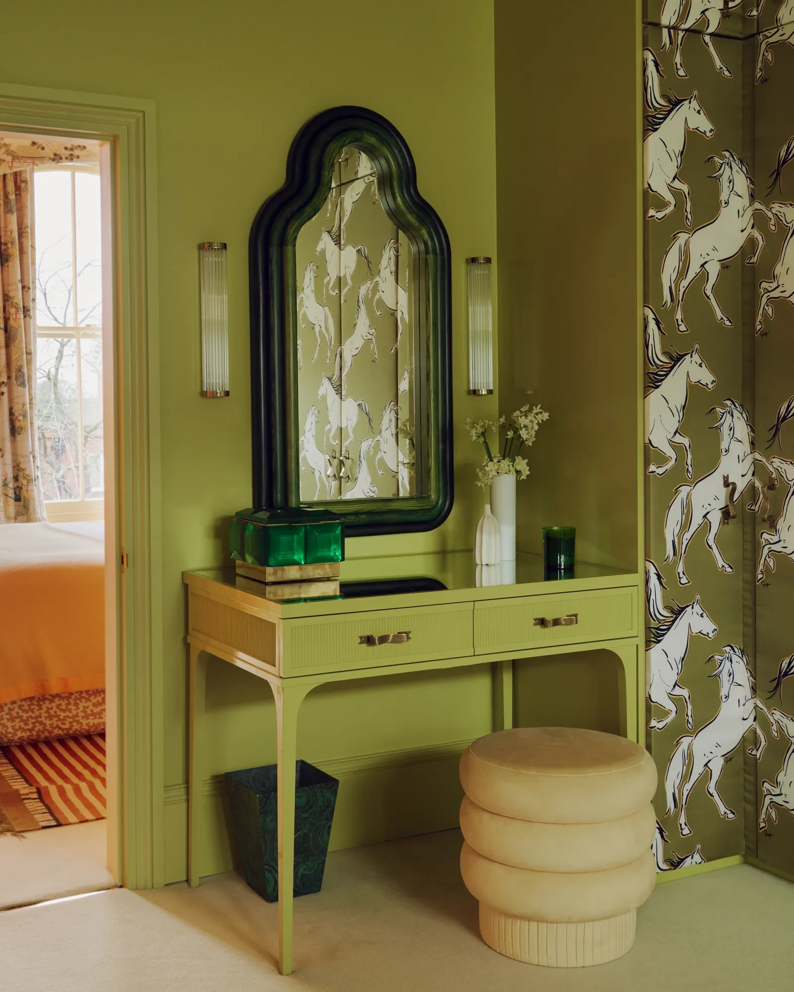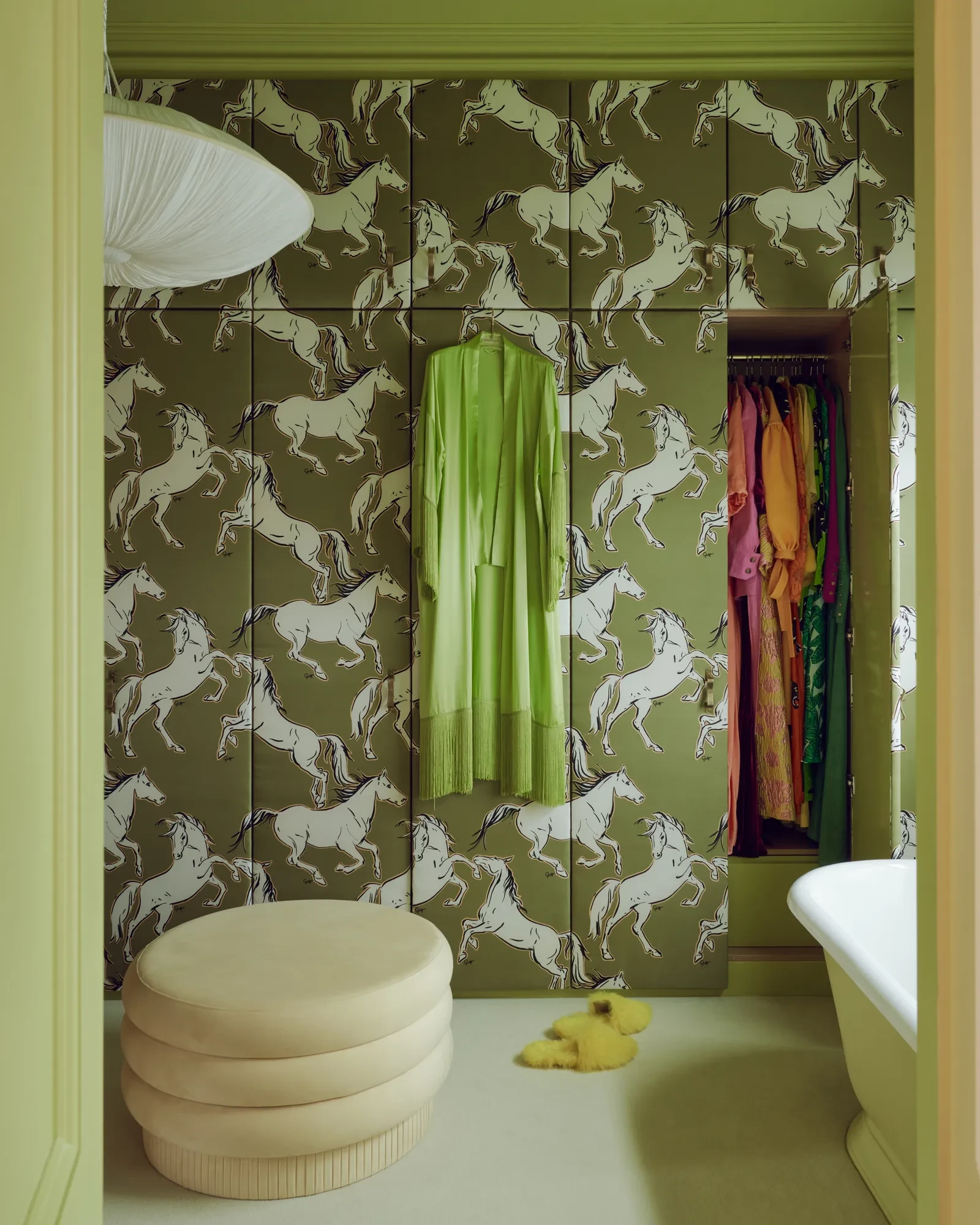 Στο δικό της dressing room, η δημιουργός απελευθερώνει το πάθος της για το χρώμα και τη λεπτομέρεια. Οι εντοιχισμένες ντουλάπες επενδύονται με ύφασμα μεταξωτό από τη συλλογή της, διακοσμημένο με λευκά άλογα που καλπάζουν, εμπνευσμένα από τον αγαπημένο της ίππο, Herman. Ένα φυστικί χαλί και μια απαλή πράσινη μπανιέρα ολοκληρώνουν την εικόνα, ενώ η ατμόσφαιρα ισορροπεί ανάμεσα στη φαντασία και την ηρεμία. Πρόκειται για έναν χώρο που αντικατοπτρίζει απόλυτα την ταυτότητά της· έναν προσωπικό μικρόκοσμο κομψότητας, όπου κάθε λεπτομέρεια έχει συναισθηματικό νόημα.
