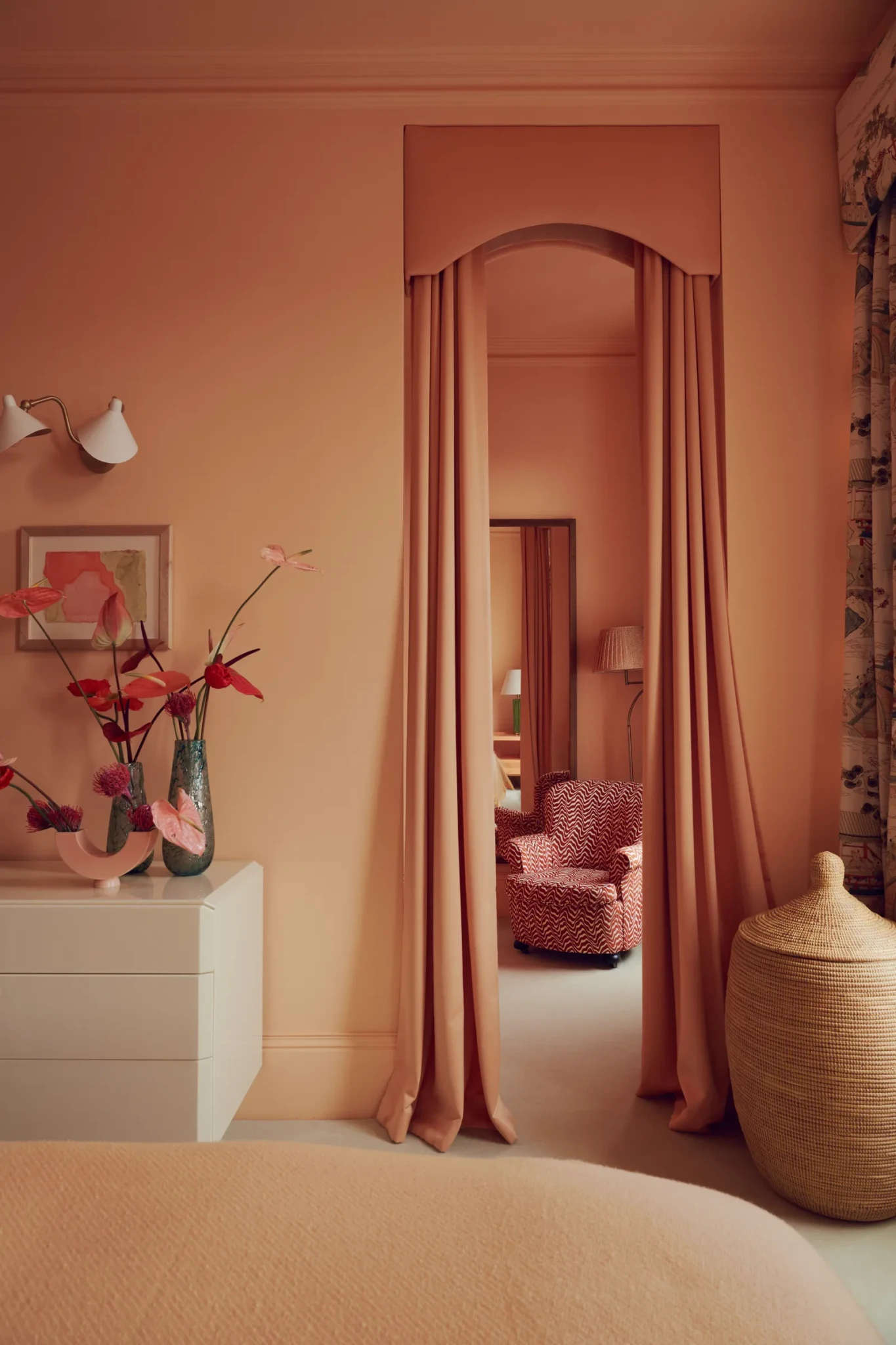 Το υπνοδωμάτιο της Von Halle είναι ένα σκηνικό ρομαντισμού και ζεστής πολυτέλειας. Οι αποχρώσεις του ροδακινί κυριαρχούν στο βελούδινο κεφαλάρι, συνδυασμένες με πράσινα κεραμικά φωτιστικά και λεπτομέρειες από ροζ μάρμαρο. Ο χώρος διαχωρίζεται από το δωμάτιο του συζύγου μέσω βαριών κουρτινών, που θυμίζουν σκηνικό θεάτρου και προσδίδουν μια αίσθηση οικειότητας αλλά και παιχνιδιάρικης μυστικότητας. Η Von Halle επιδιώκει να συνδυάσει την άνεση με τη φαντασία, δημιουργώντας ένα υπνοδωμάτιο που εκπέμπει γαλήνη και δημιουργική διάθεση.