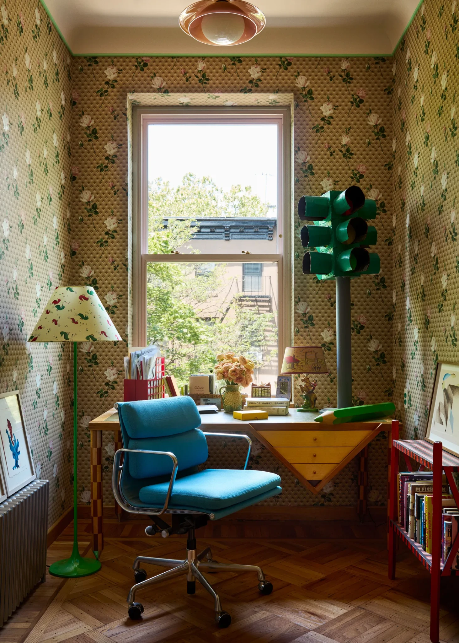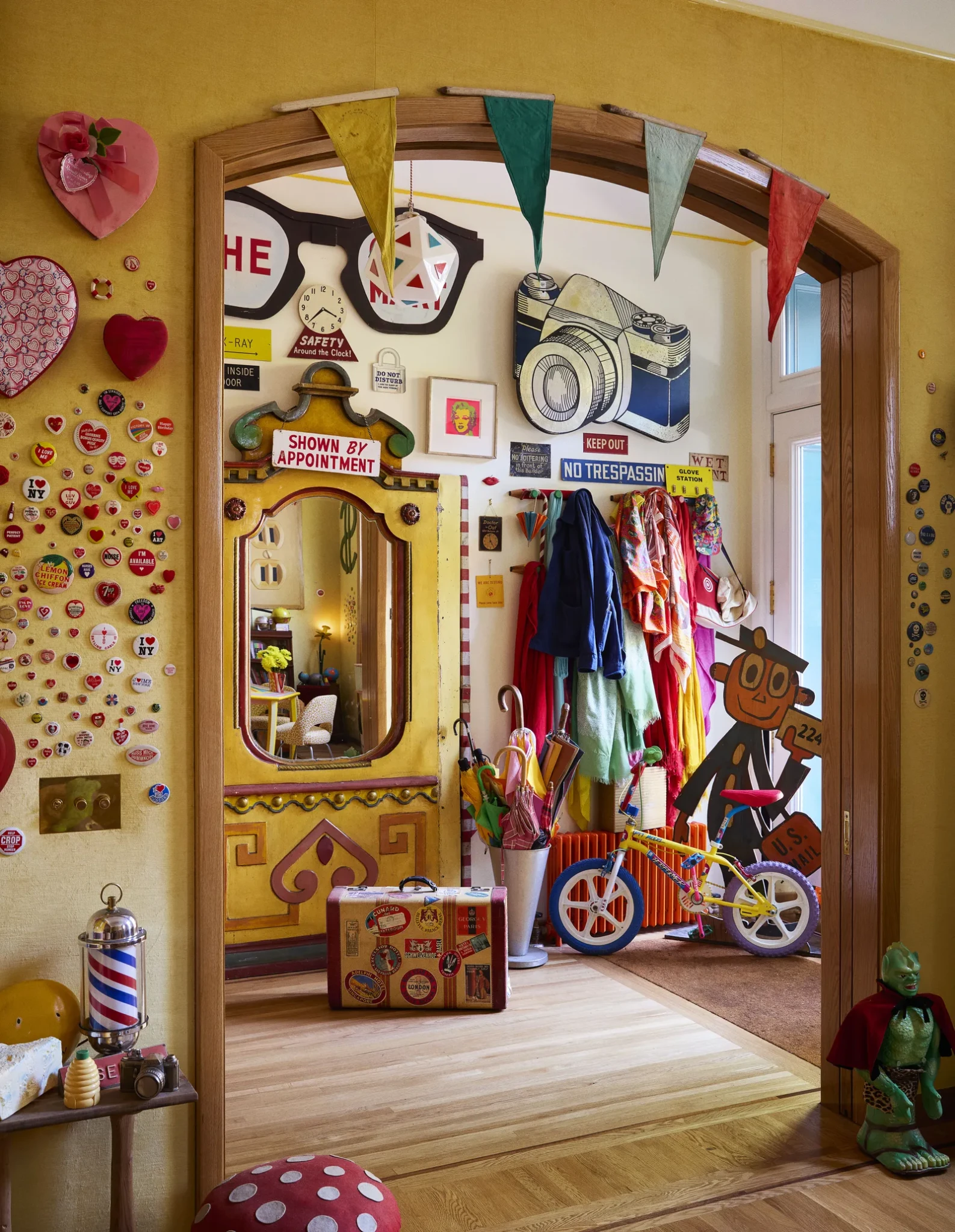 Στην καρδιά του Brooklyn, μια ιστορική κατοικία του 19ου αιώνα ξεχωρίζει για την εκκεντρική και παιχνιδιάρικη προσωπικότητά της. Το πρώτο στοιχείο που τραβάει το βλέμμα είναι η είσοδος. Ένα ειδικά σχεδιασμένο χερούλι από μπρούντζο, που θυμίζει τον Globey από την Pee-wee’s Playhouse, προαναγγέλλοντας την παράξενη και σουρεαλιστική ατμόσφαιρα που ακολουθεί μέσα στο σπίτι. Το πολύχρωμο πάνελ από παλιά καρουζέλ, οι διαφημιστικές πινακίδες και η παρουσία του Mr. ZIP, του καρτούν χαρακτήρα που δημιουργήθηκε τη δεκαετία του ’60 για να προωθήσει το ταχυδρομικό κώδικα, δίνουν τον τόνο ενός σπιτιού όπου η φαντασία και η δημιουργικότητα κυριαρχούν από την πρώτη στιγμή.