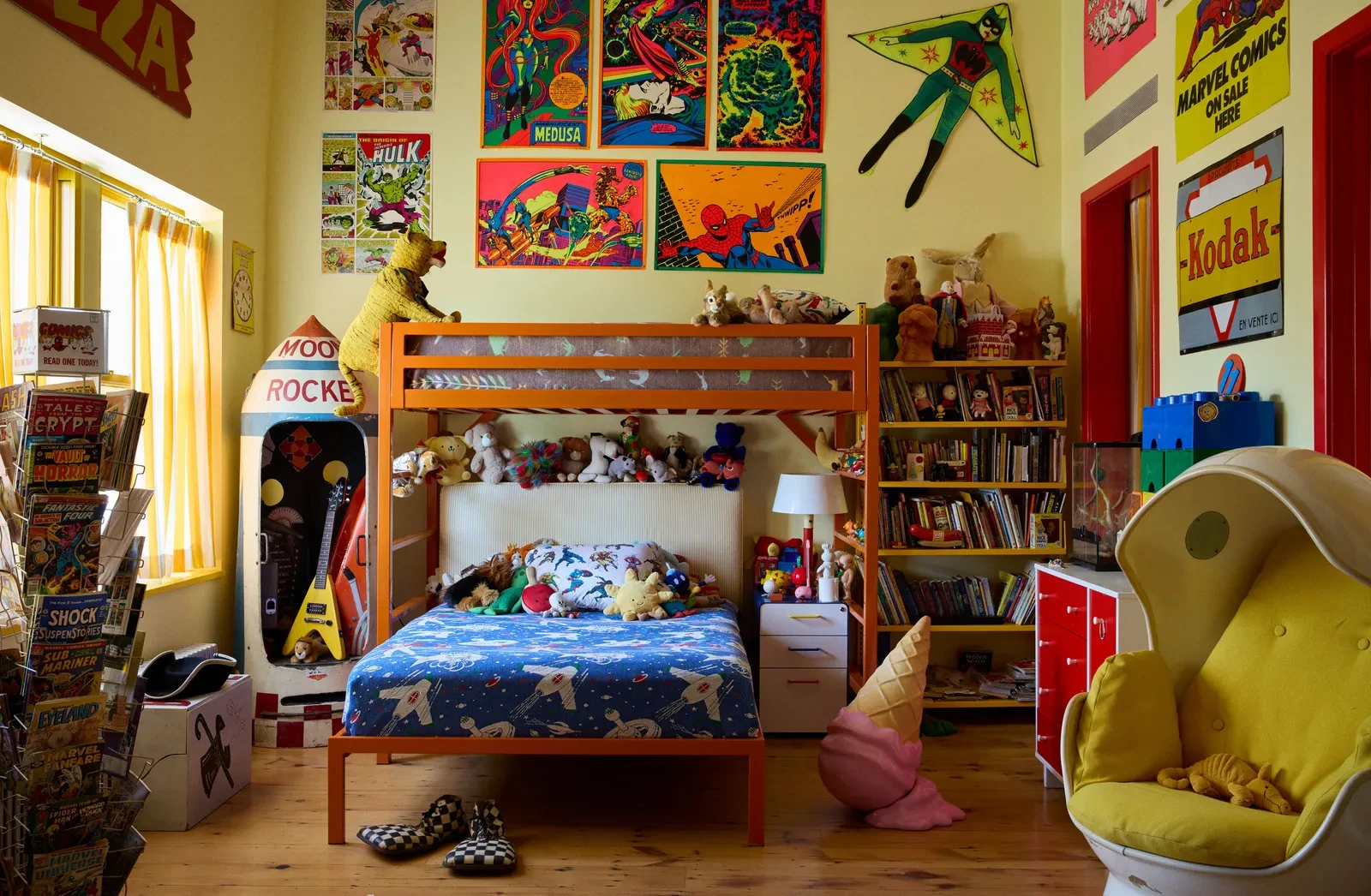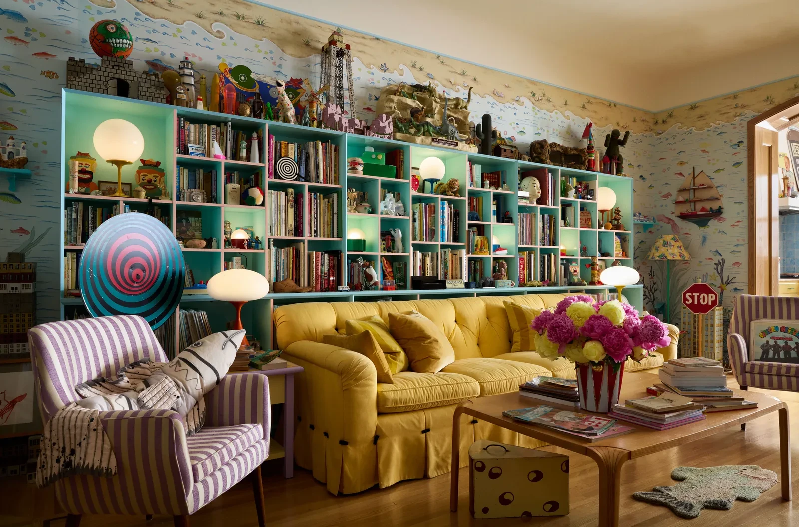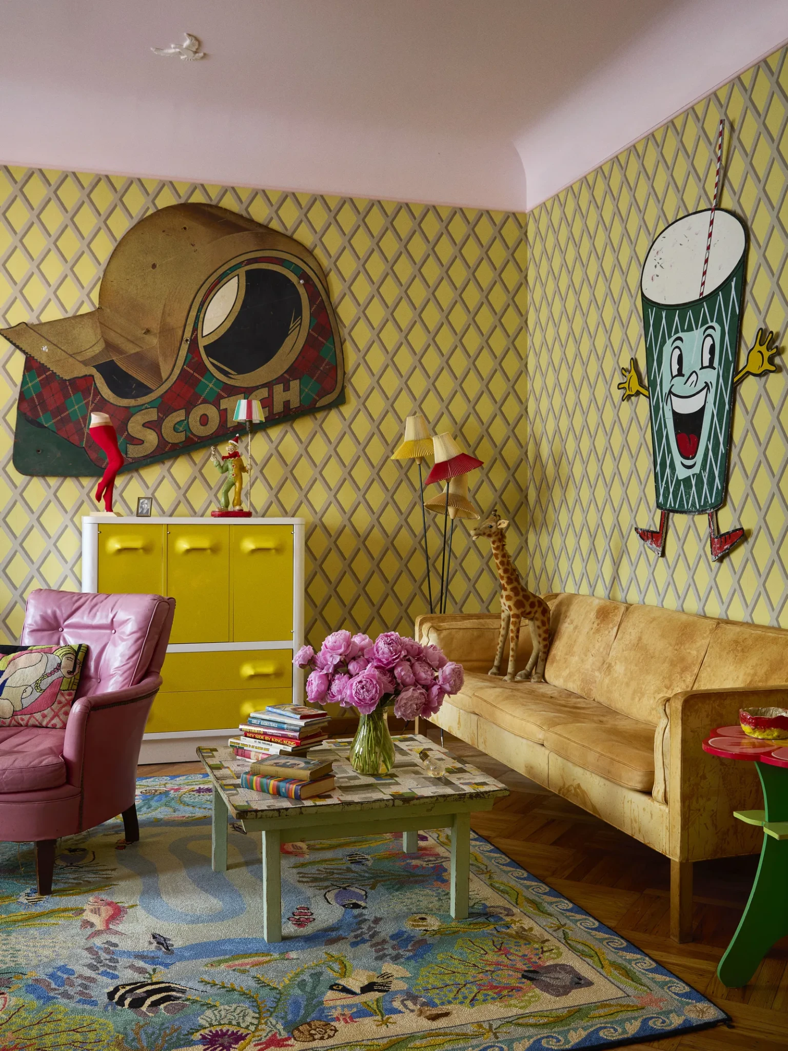 Το σπίτι θυμίζει έναν ψυχεδελικό κόσμο γεμάτο εκπλήξεις. Μία φωτεινή κίτρινη τσουλήθρα συνδέει την κουζίνα με τον κήπο, δημιουργώντας μια αίσθηση παιχνιδιού που υπερβαίνει τα όρια του κλασικού σπιτιού. Η τραπεζαρία καλύπτεται από βελούδινο κίτρινο ύφασμα και κοσμείται με συλλογή παλιών κουμπιών, ενώ ένας μυστικός διάδρομος οδηγεί από την αποθήκη στην είσοδο και κρύβει μια καμπίνα για DJ. Οι τοίχοι του σαλονιού ντύνονται με μεταξωτές ταπετσαρίες που απεικονίζουν θαλασσινά τοπία, προσδίδοντας πολυτέλεια και παραμυθένια διάθεση. Στην ημικυκλική ντουλάπα, ο Mr. Peanut παρατηρεί διακριτικά, ενώ μια διπλή σειρά vintage ρούχων σχηματίζει ένα εντυπωσιακό ουράνιο τόξο, μετατρέποντας τον χώρο σε ένα ζωντανό θέαμα.