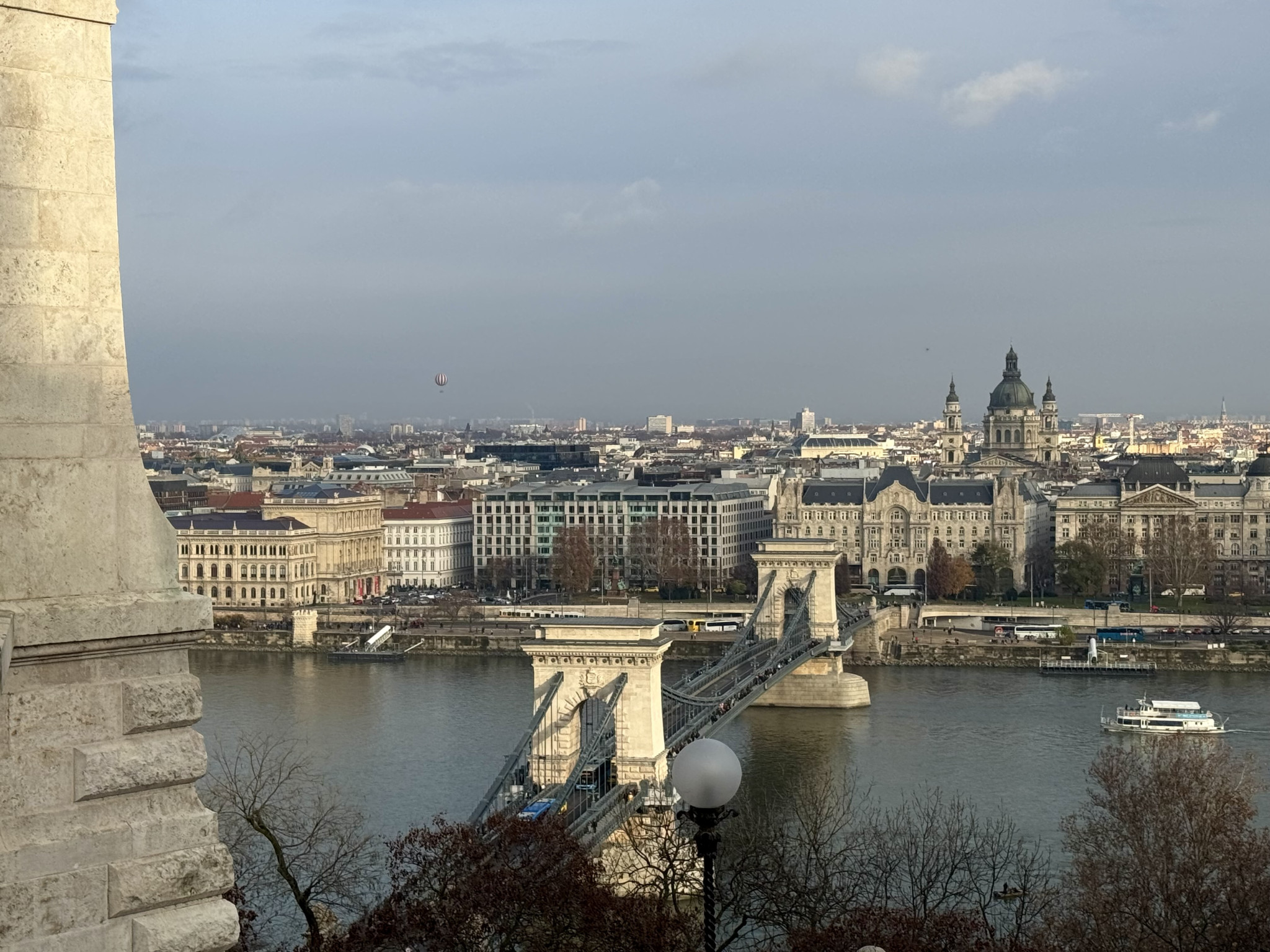 Πάντα αισθανόμαστε μια ιδιαίτερη έλξη για τα σημεία που προσφέρουν πανοραμική θέα, εκεί όπου ολόκληρη η πόλη απλώνεται μπροστά μας και αποκαλύπτει κάθε της γωνιά. Είτε ταξιδεύουμε στο εξωτερικό είτε στην Ελλάδα, αναζητούμε πάντα το μέρος που μπορεί να μας χαρίσει αυτή τη μαγεία. Έτσι, η τρίτη ημέρα μάς βρήκε στην απέναντι πλευρά της πόλης, στη Βούδα, με στόχο να ανακαλύψουμε το πασίγνωστο Fisherman’s Bastion. Για να φτάσουμε εκεί, διασχίσαμε με τα πόδια τη συγκλονιστική αλυσίδωτη γέφυρα, ένα από τα πιο αναγνωρίσιμα σύμβολα της Βουδαπέστης, και συνεχίσαμε μια διαδρομή που μύριζε φθινόπωρο-χειμώνας. Δέντρα που έσταζαν υγρασία, βρεγμένα μονοπάτια στο πάρκο, και καθαρός, αναζωογονητικός αέρας. Η ανάβαση προς το αξιοθέατο αποζημιώνει κάθε βήμα.