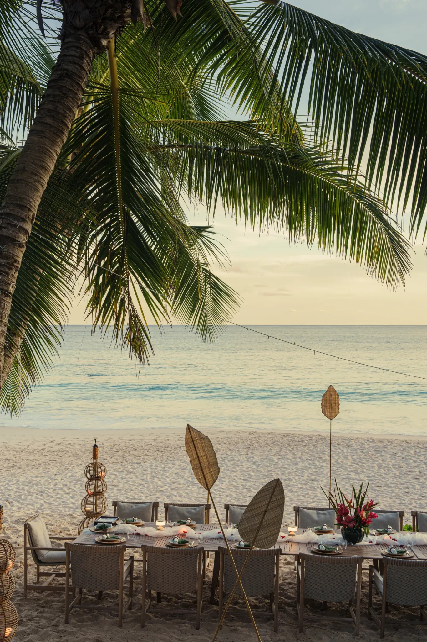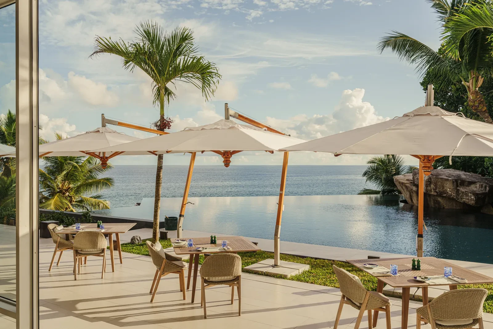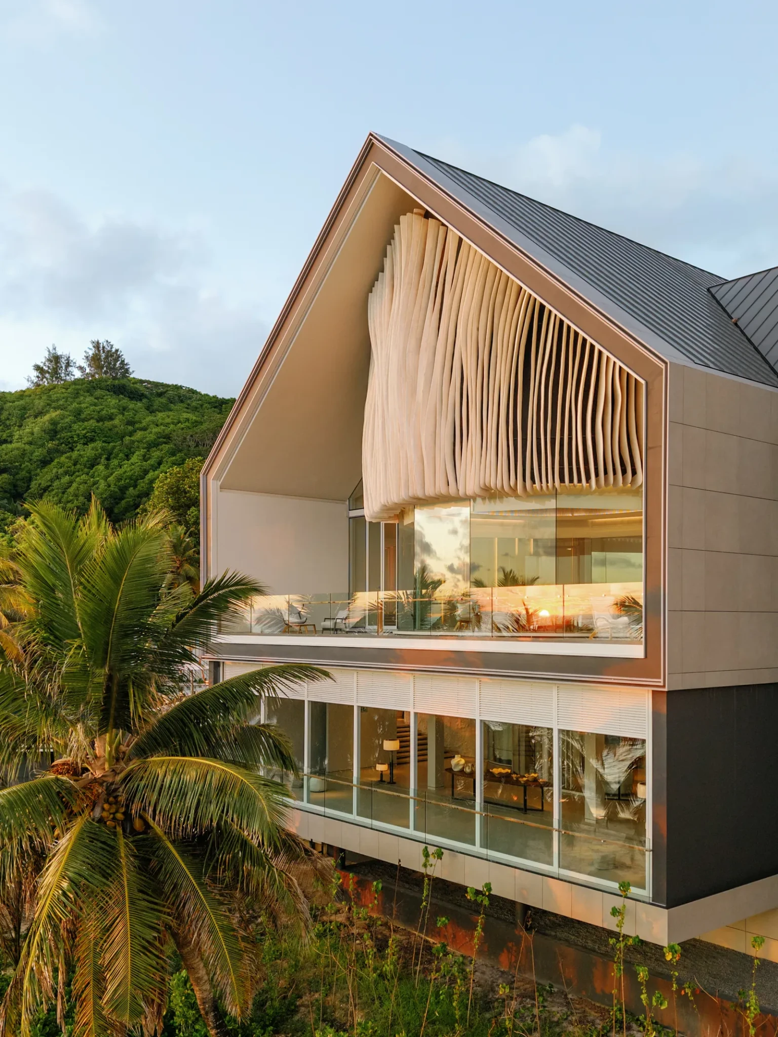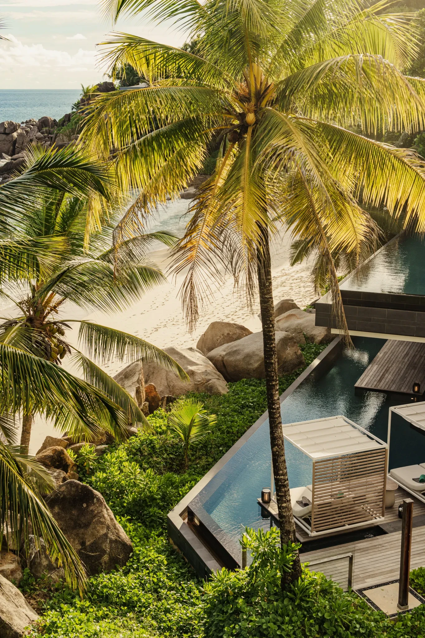 Οι χώροι διακοσμούνται σε παλέτα λευκού και γκριζογάλαζου - χρώματα που αρμονίζουν με τα φυσικά στοιχεία. Το ξύλο, η ρατάν και η mother‑of‑pearl υιοθετούνται με διακριτική πολυτέλεια, αντανακλώντας την υφή του τοπίου. Ορισμένα έπιπλα είναι custom, εμπνευσμένα από τις λείες γραμμές ή την χαρακτηριστική καρυδιά coco‑de‑mer, και αντικατοπτρίζουν μια διακοσμητική προσέγγιση “του τόπου”