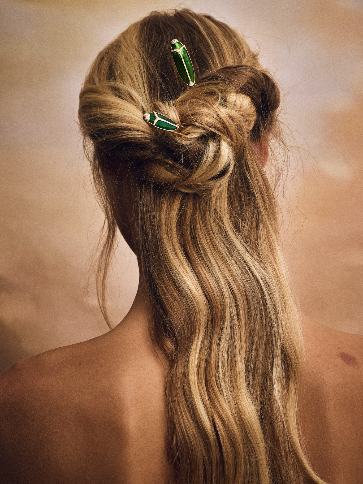Οι ιριδισμοί του εντόμου, άλλοτε πράσινοι, άλλοτε χρυσαφένιοι ή μπλε, συνομιλούν με το φως του χρυσού 18 καρατίων, τα διαμάντια και τους επιλεγμένους πολύτιμους λίθους. Το αποτέλεσμα είναι μια σειρά κοσμημάτων που μοιάζουν να πάλλονται από ζωή: σκουλαρίκια, δαχτυλίδια, βραχιόλια, ένα choker, μία καρφίτσα και μία tiara, σχεδιασμένα ώστε να φοριούνται απευθείας πάνω στο γυμνό δέρμα, σαν μυστικοί φύλακες, σαν προσωπικά φυλαχτά.