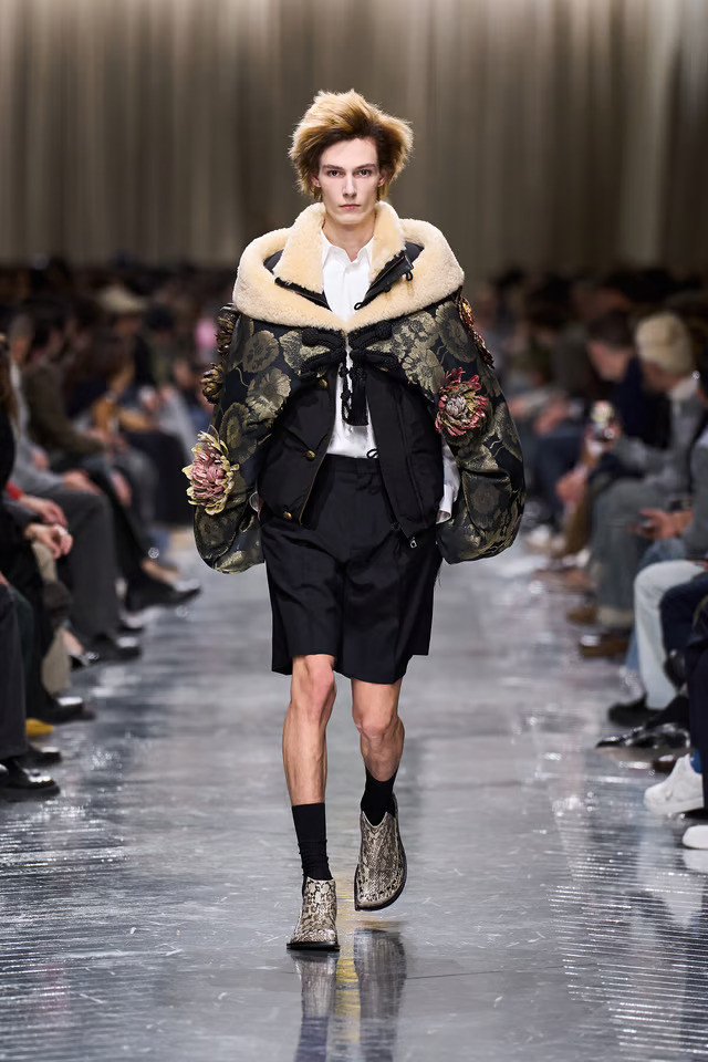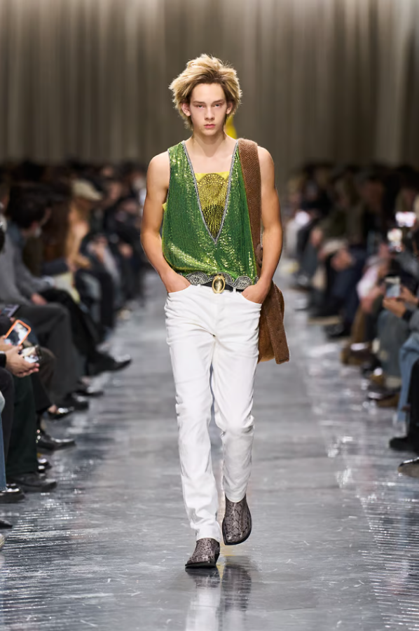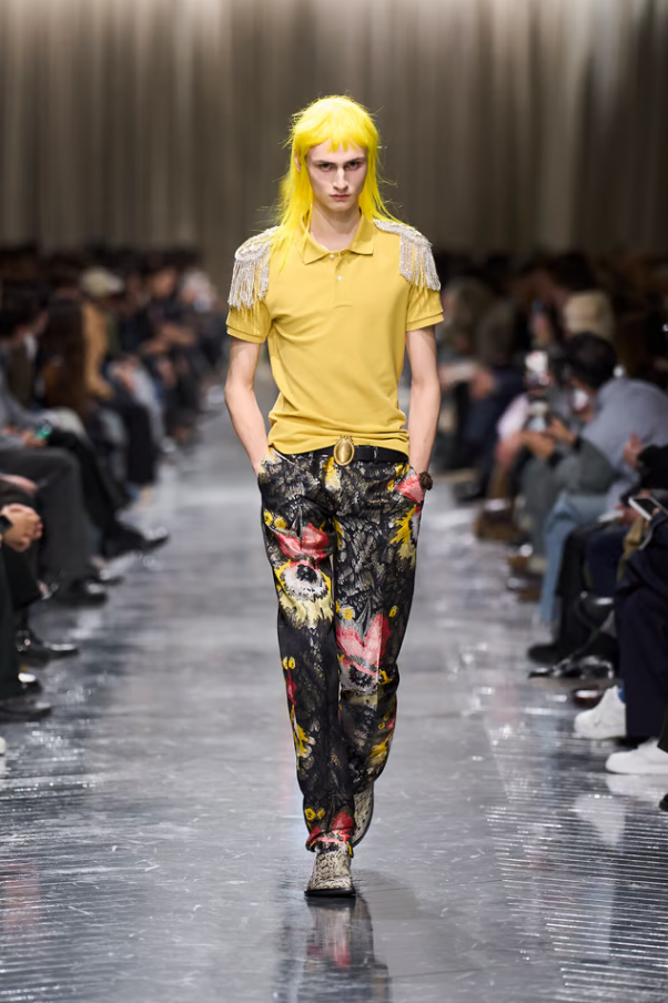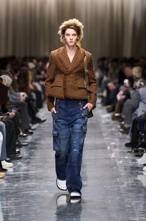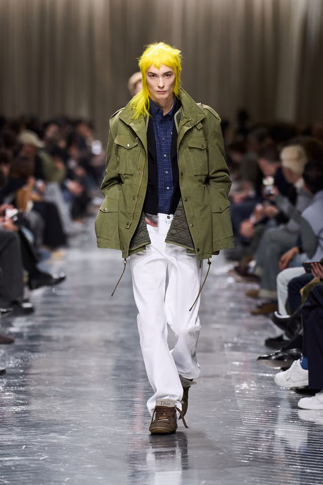 Λαμπερές λεπτομέρειες πάνω σε σιλουέτες που θυμίζουν στρατιωτικό εξοπλισμό, κομψά jackets συνδυασμένα με cargo παντελόνια, στοιχεία couture πλαισιωμένα από αναφορές στη street κουλτούρα. Τίποτα δεν είναι «σωστό» με την παραδοσιακή έννοια, κι όμως, όλα λειτουργούν. Και το πιο σημαντικό; Δεν υπάρχει ακριβής αναφορά για το αν αυτά τα κομμάτια προορίζονται για άνδρες ή για γυναίκες, γιατί αυτή είναι η μόδα σήμερα και δεν κοιτάζει φύλο.