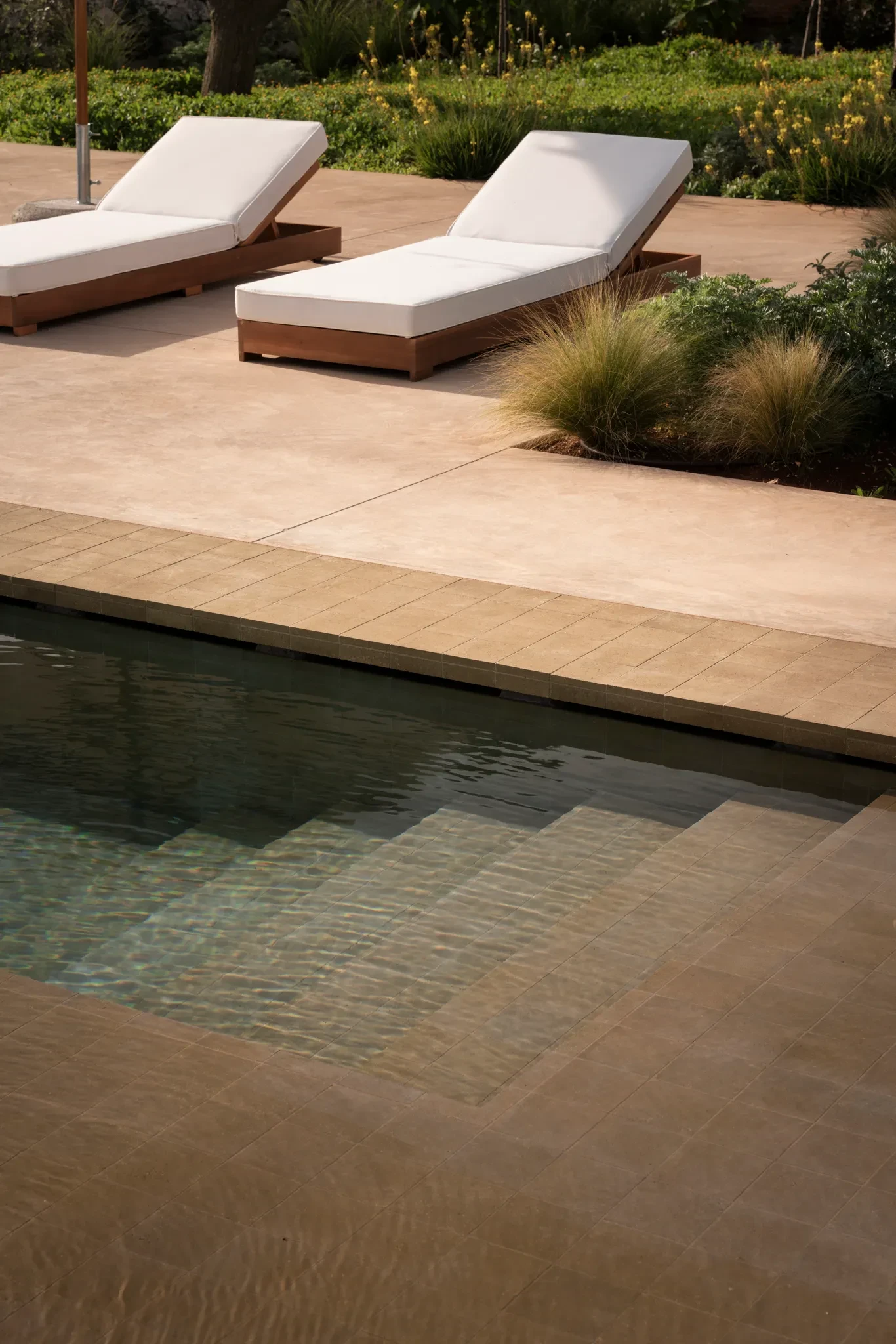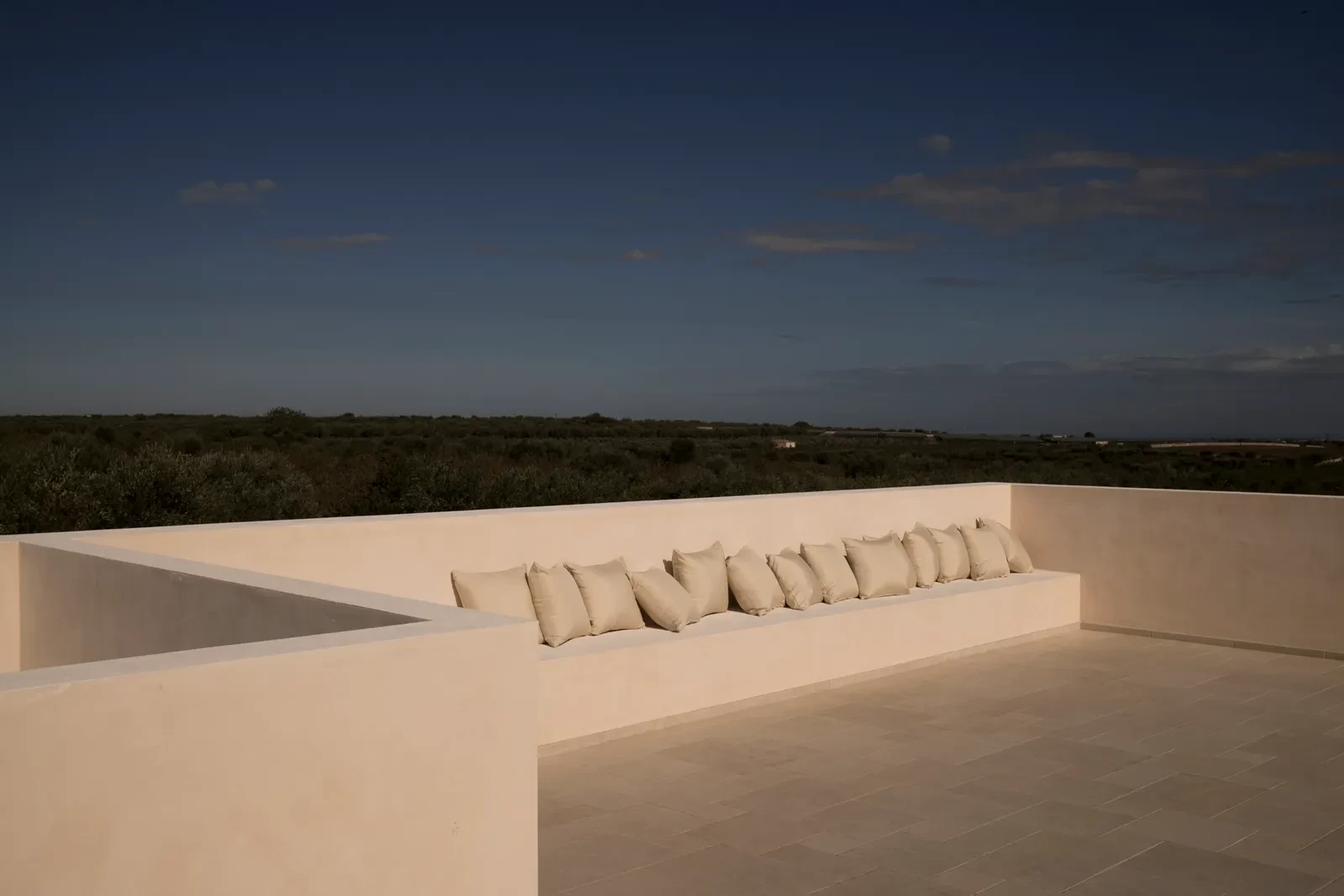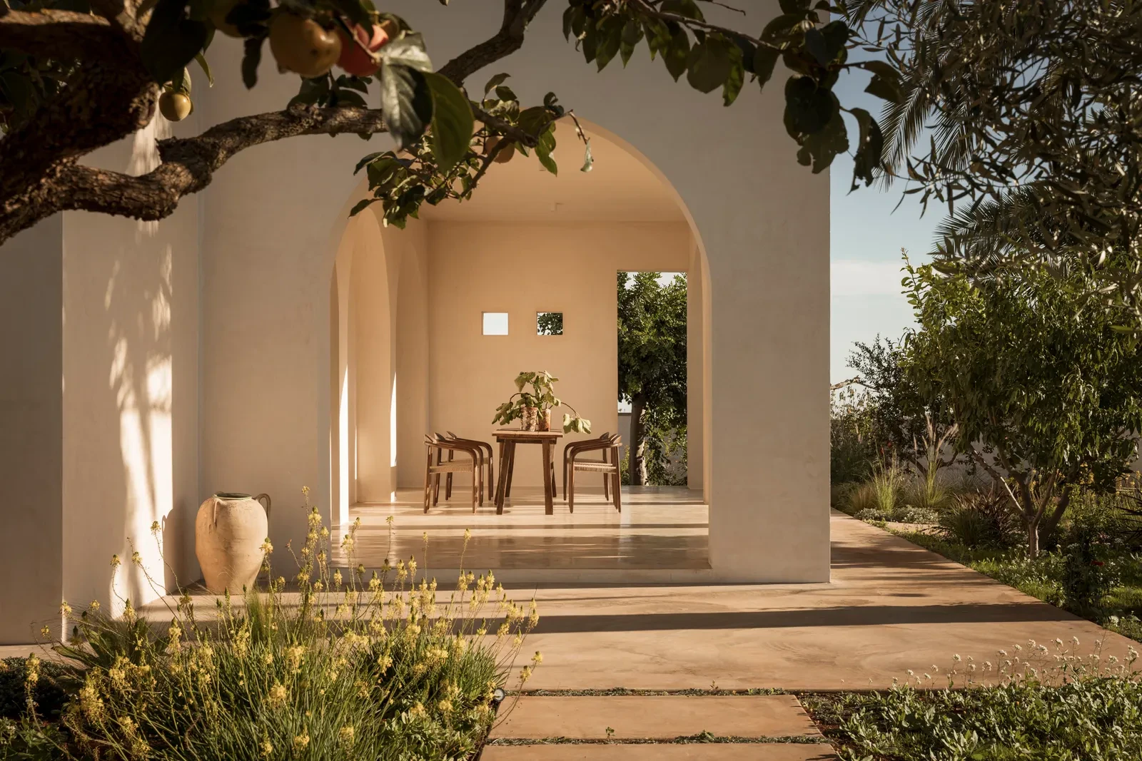 Η εξωτερική διαμόρφωση, επιμελημένη από το Studio Paz, εντάσσει ομαλά την κατοικία στο τοπίο χωρίς να την κυριαρχεί. Κάθε φυτό και κάθε μονοπάτι επιλέχθηκαν με γνώμονα την εποχική εναλλαγή και την τοπική βιοποικιλότητα. Αρωματικά βότανα, θάμνοι της μεσογειακής χλωρίδας, φοινικόδεντρα και αιωνόβιοι ελαιώνες συνθέτουν έναν πολύχρωμο και δυναμικό καμβά. Η υπαίθρια κουζίνα ενισχύει τη βιωματική εμπειρία των επισκεπτών, ενώ η συνεργασία με την Osteria Caroseno στην πόλη Castellana Grotte προσφέρει αυθεντικές γαστρονομικές απολαύσεις.