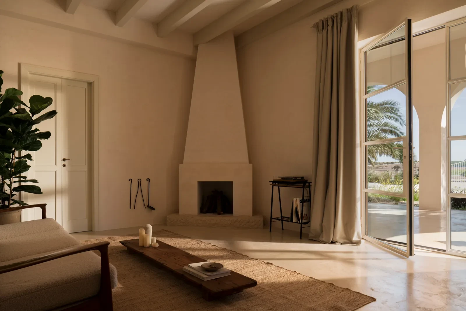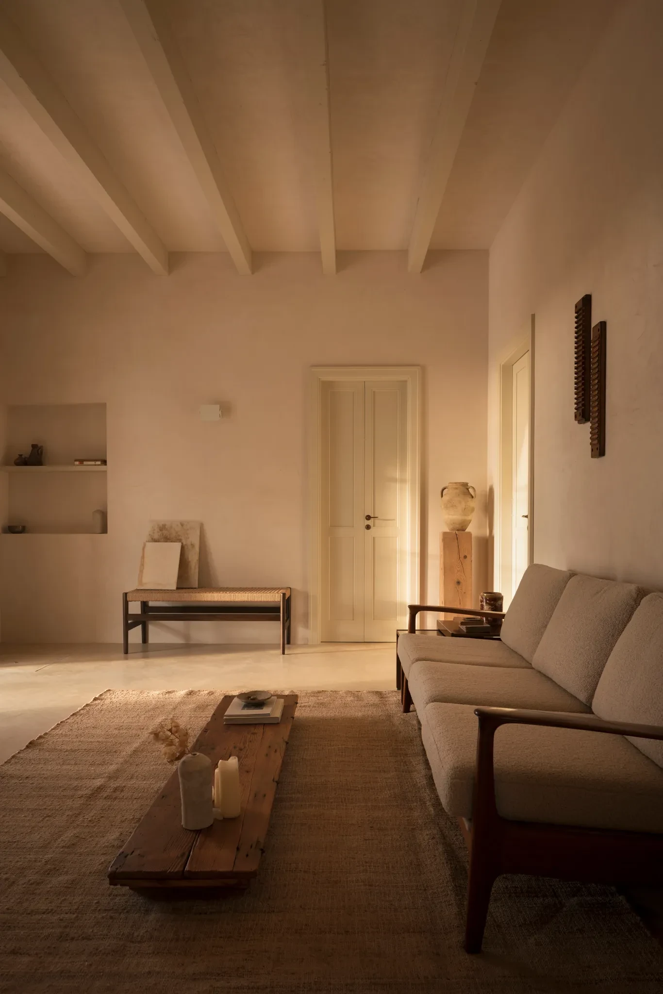Οι εσωτερικοί χώροι διακρίνονται για την αυθεντικότητα και τη διακριτική τους κομψότητα. Τοποθετημένα με φροντίδα, τα vintage έπιπλα της δεκαετίας του ’50 προσδίδουν βάθος και ιστορικότητα στο περιβάλλον. Ανάμεσά τους ξεχωρίζουν ένα τραπέζι του Gianfranco Frattini για τη Bernini, σχεδιαστικά κομμάτια των Afra και Tobia Scarpa, καθώς και σκανδιναβικές δημιουργίες της ίδιας εποχής. Η αρχιτεκτονική καθαρότητα των εσωτερικών ενισχύεται από τα σταθερά στοιχεία σε χτιστή μορφή, όπως η κουζίνα και τα λουτρά, τα οποία παραμένουν σε απόλυτη ισορροπία με τα λεπτεπίλεπτα ξύλινα έπιπλα και τον φωτισμό.