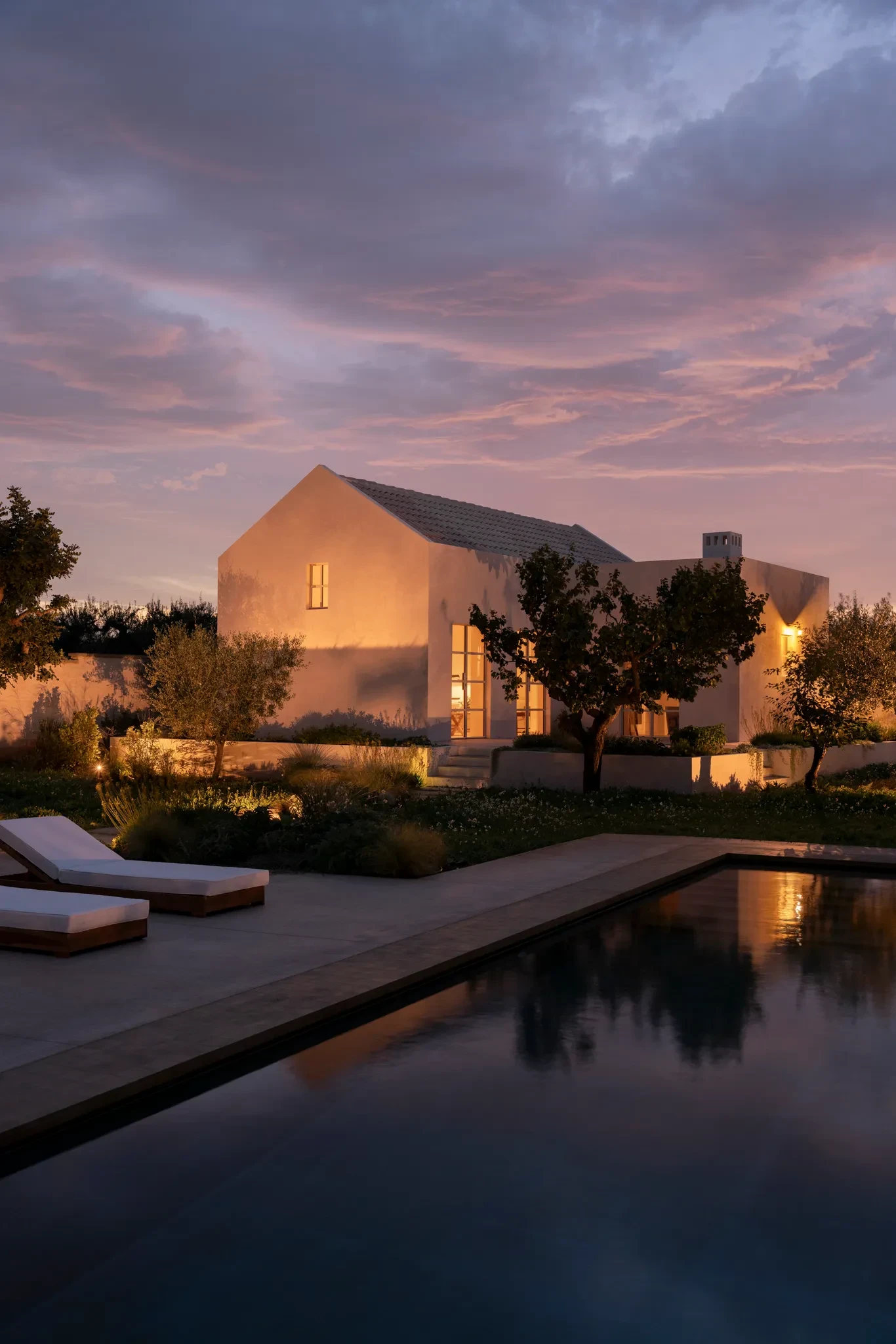 Το βράδυ, το σκηνικό αλλάζει. Ο φωτισμός αναδεικνύει τις φόρμες και τις υφές του κτιρίου, ενώ οι αντανακλάσεις στην πισίνα δημιουργούν μια ονειρική αίσθηση. Η κατοικία και η εξοχική μονάδα διατηρούν τις διακριτές τους αρχιτεκτονικές γραμμές, αλλά συνυπάρχουν μέσα από την αρμονία των υλικών και των χρωμάτων. Οι αποχρώσεις του πηλού, τα φυσικά επιχρίσματα και οι ξύλινες επιφάνειες προσδίδουν ζεστασιά και αυθεντικότητα, δημιουργώντας έναν χώρο που γαληνεύει τις αισθήσεις.