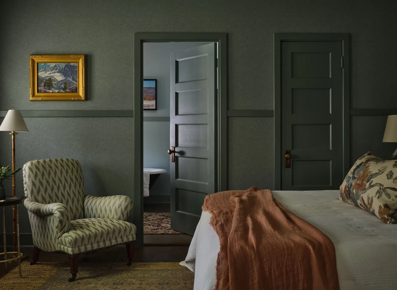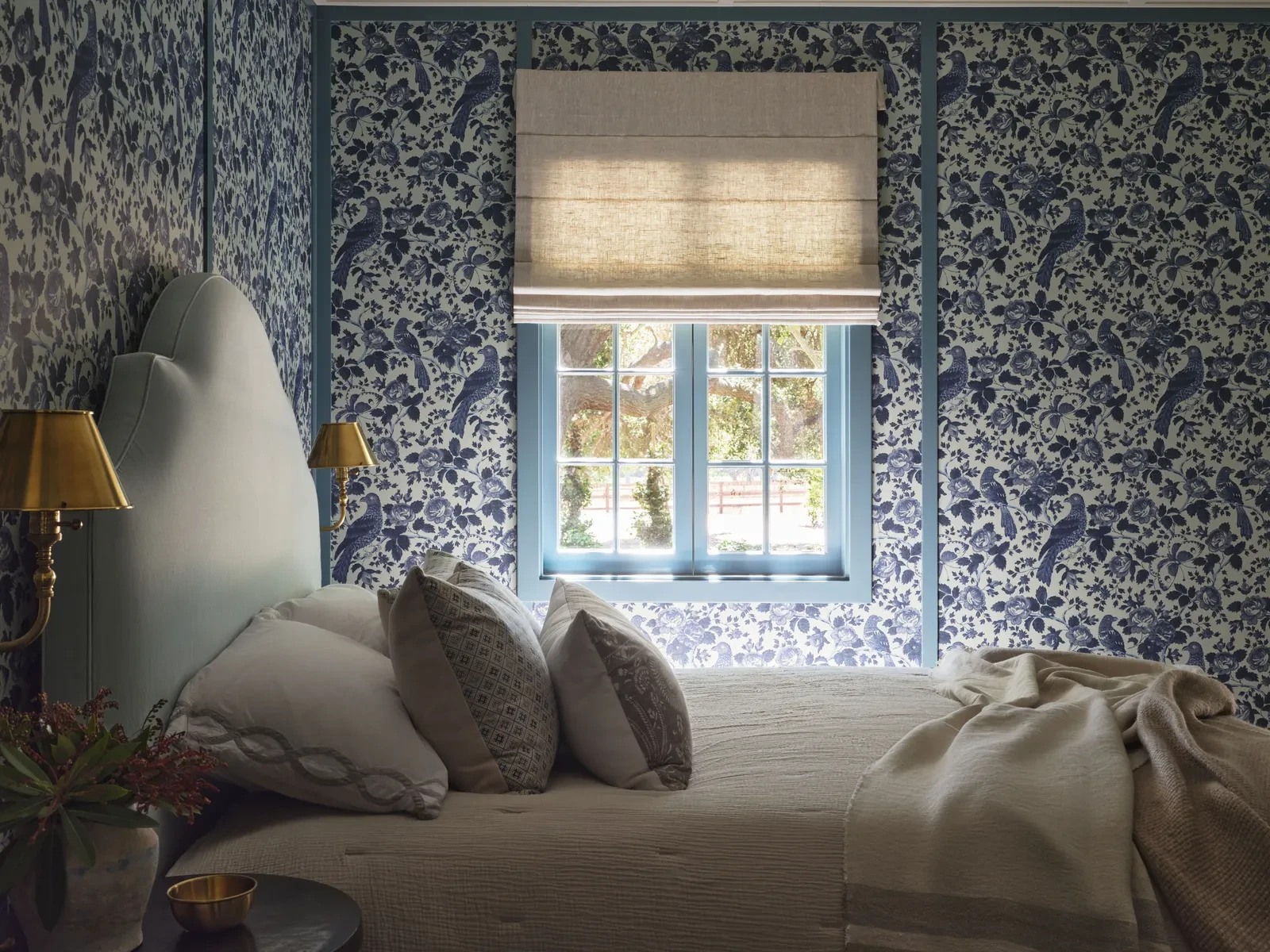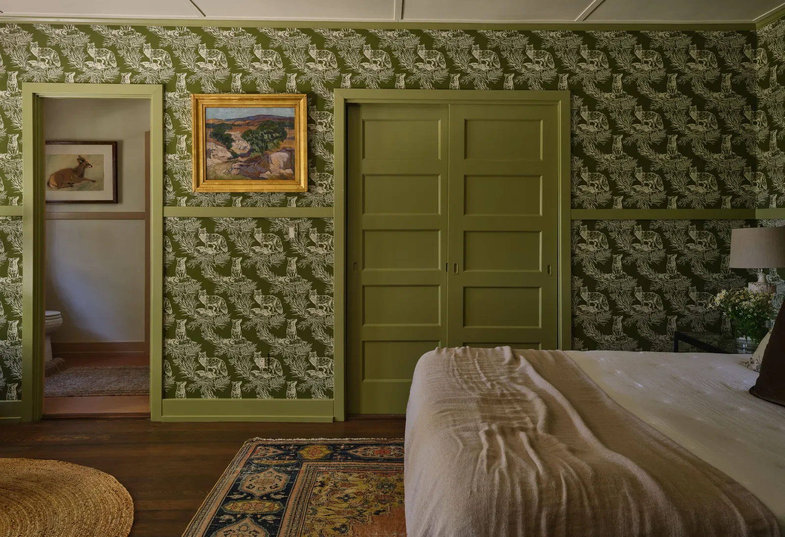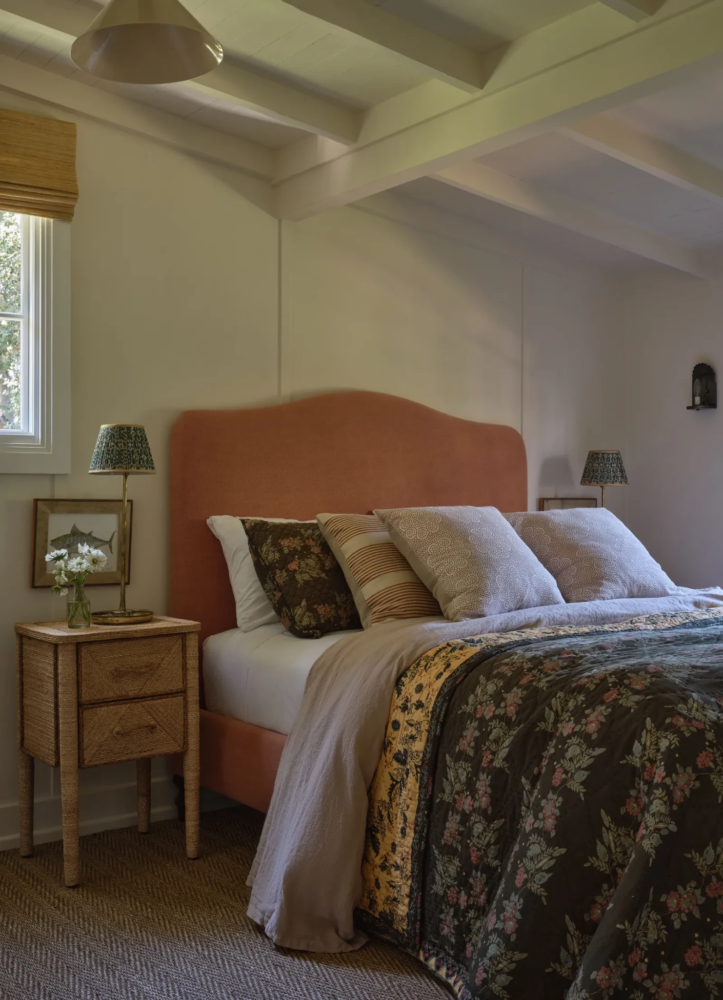 Παρά τη μεγαλοπρέπεια του κυρίως υπνοδωματίου, η Miller κατάφερε να δημιουργήσει μια ζεστή και φιλόξενη ατμόσφαιρα χωρίς τη χρήση σκούρων χρωμάτων. Τρεις ζώνες καθιστικού, πλούσια υφάσματα και επιλεγμένα μικρά καθιστικά γύρω από το τζάκι και τα παράθυρα γεμίζουν τον χώρο και κάνουν την κλίμακα φιλόξενη. Μακρόστενες συρταριέρες λειτουργούν ως κομοδίνα, αγκαλιάζοντας το κρεβάτι με ισορροπημένη συμμετρία, ενώ η αφθονία του φωτός και οι διακριτικές λεπτομέρειες δημιουργούν μια αίσθηση πολυτέλειας χωρίς επιτήδευση.