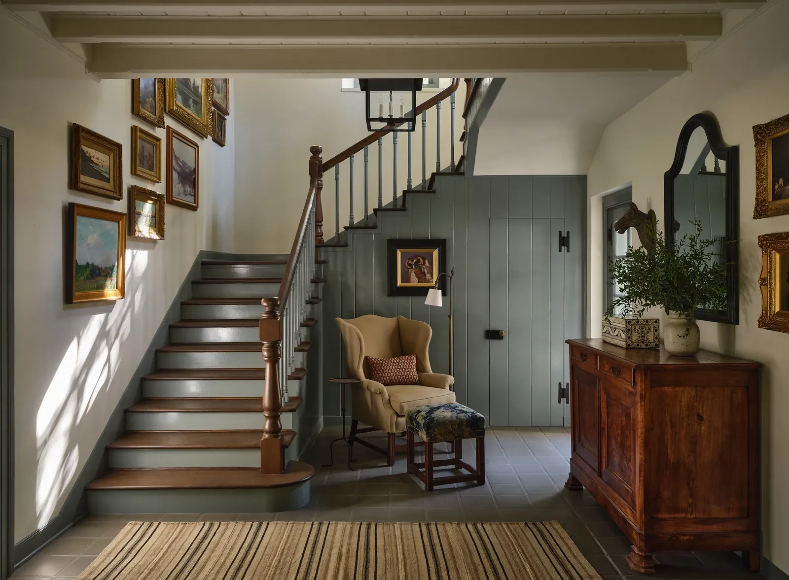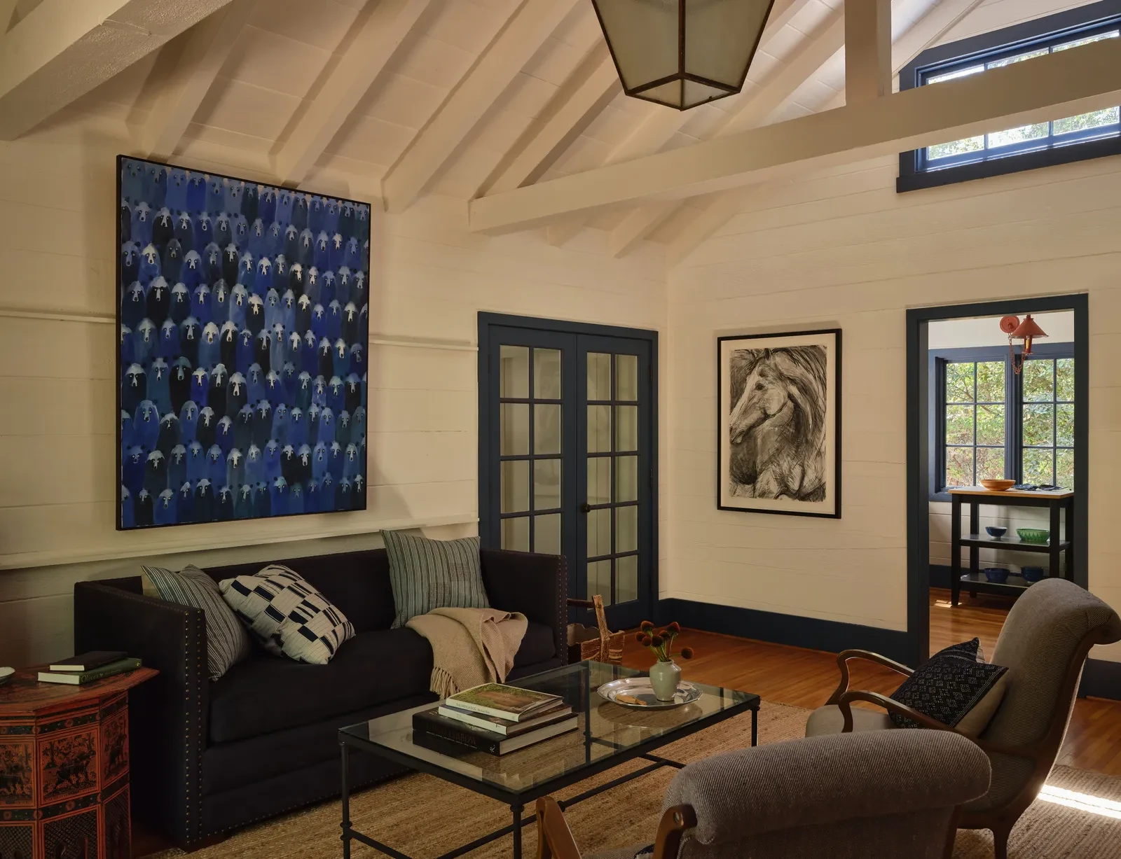 Ένα από τα πιο χαρακτηριστικά στοιχεία του White Owl Ranch είναι η παρουσία ενός συγκεκριμένου μπλε τόνου, αγαπημένου των ιδιοκτητών, που εμφανίζεται σχεδόν σε κάθε χώρο. Το “Stonybrook” της Benjamin Moore, ένας ατμοσφαιρικός γκριζο-μπλε τόνος, κυριαρχεί στις σκάλες και στα πάνελ της εισόδου, δημιουργώντας αντίθεση με τα ζεστά λευκά τοιχώματα και τα σοκολατί ξύλινα στοιχεία.