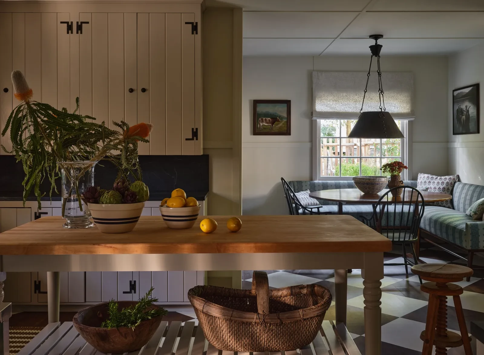 Η ίδια απόχρωση επανεμφανίζεται στην κουζίνα του αγροτικού στιλ, στους πάγκους από σαπούνι, στις ψάθινες λεπτομέρειες και σε κάθε γωνιά που χρειάζεται οπτική συνέπεια, δίνοντας στον χώρο χαρακτήρα και ταυτότητα.