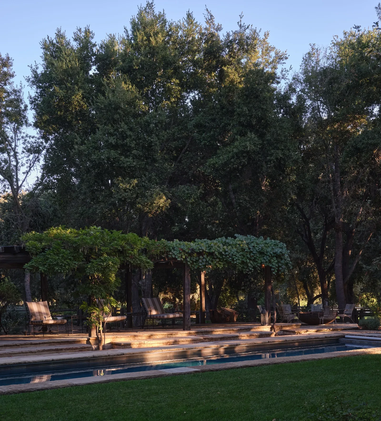 Κάθε γωνιά της αυλής αξιοποιείται με στρατηγικά τοποθετημένες καρέκλες, προσφέροντας ανεμπόδιστη θέα στο καταπράσινο τοπίο και την ηρεμία του ranch.