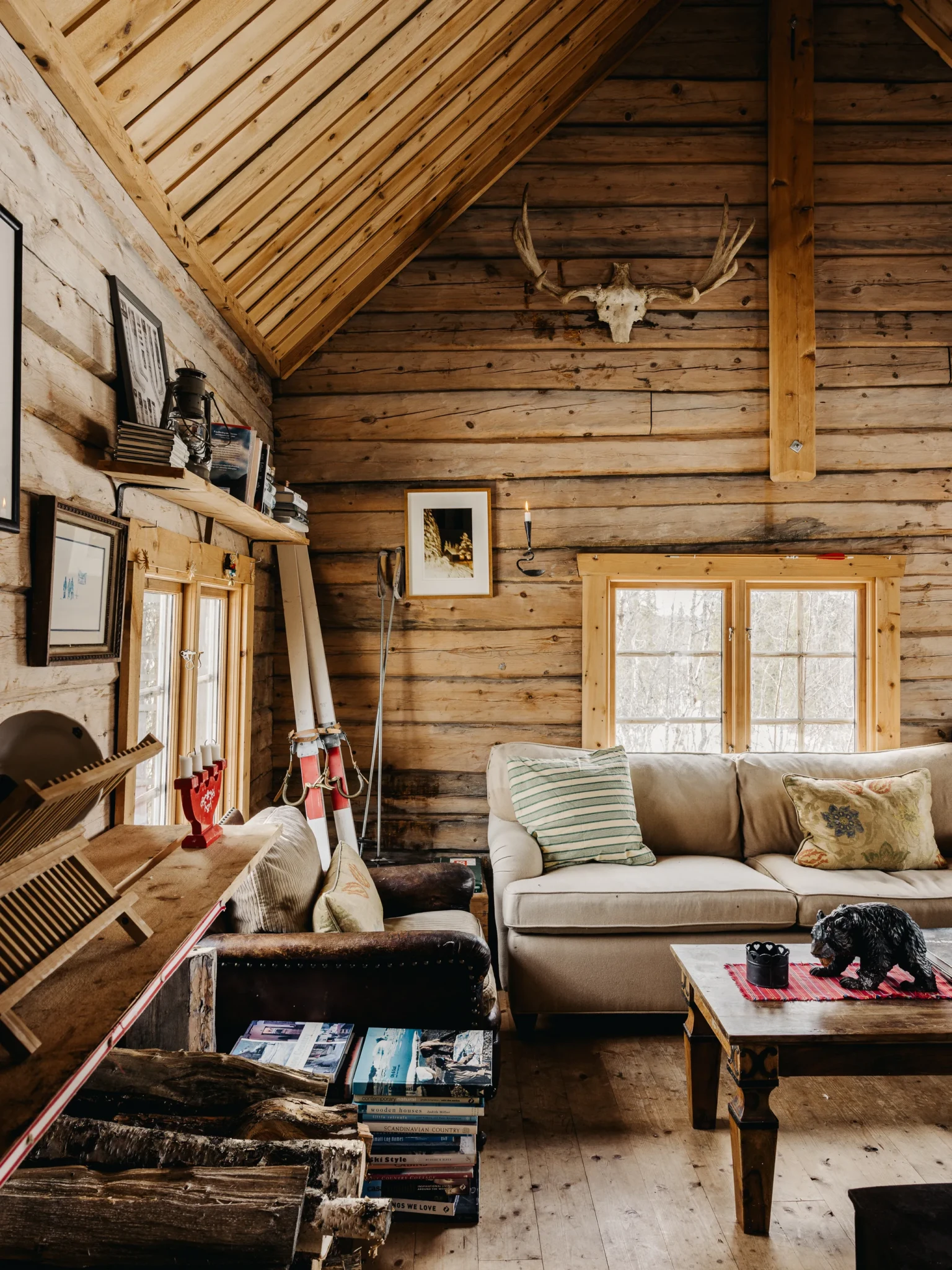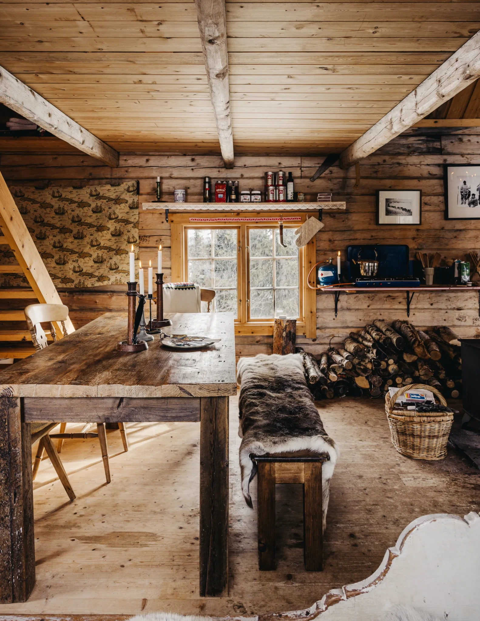 Στην καρδιά του σπιτιού δεσπόζει μια ξυλόσομπα, η πηγή θερμότητας, νερού και φαγητού. Όταν οι θερμοκρασίες πέφτουν κάτω από το μηδέν, στο εσωτερικό επικρατεί μια θαλπωρή που συνοδεύεται μόνο από τον ήχο του ανέμου που στροβιλίζεται απ' έξω. Τα έπιπλα συνδυάζουν διαφορετικές ιστορίες: χειροποίητα σουηδικά κομμάτια, παλιά κρεβάτια-έλκηθρα που «μεγάλωσαν» μαζί με τα παιδιά, και αντικείμενα τέχνης που κουβαλούν μνήμες ταξιδιών. Πολύχρωμες υφαντές κουβέρτες και δέρματα ταράνδου μαλακώνουν το ξύλο και δημιουργούν γωνιές ξεκούρασης στη σοφίτα.