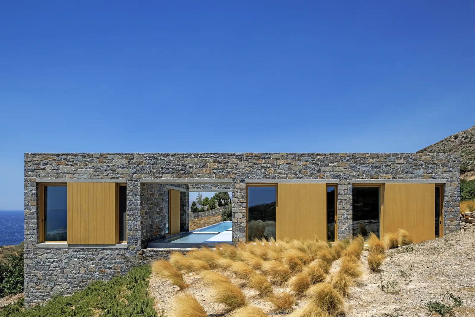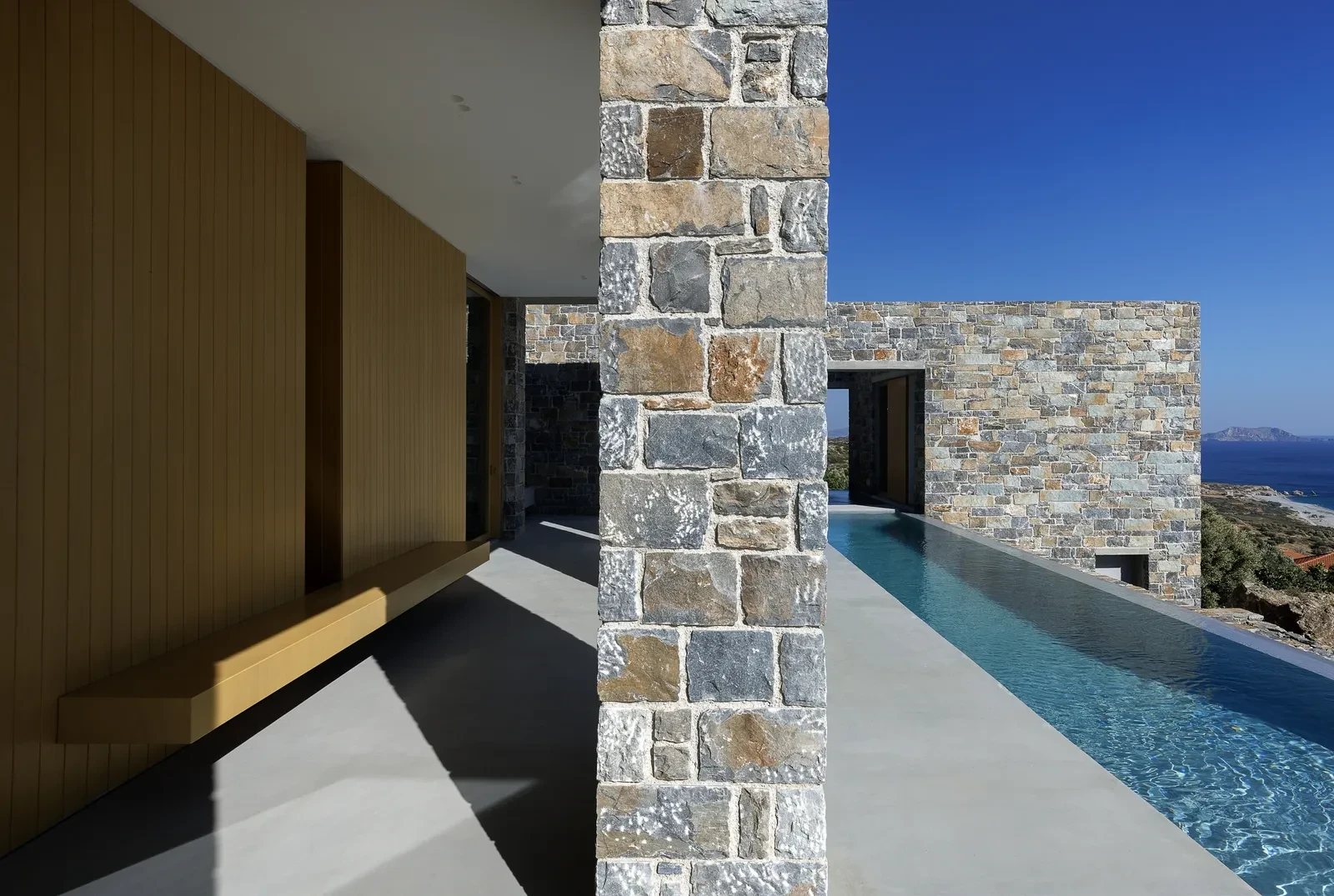 Τα υλικά της κατασκευής δεν επιλέχθηκαν μόνο με γνώμονα την αισθητική, αλλά ως γέφυρες σύνδεσης με το περιβάλλον και την τοπική κληρονομιά. Η πέτρα που επενδύει τις όψεις προέρχεται από την ευρύτερη περιοχή, μεταφέροντας στους τοίχους τη χροιά και την υφή του τόπου. Τα ξύλινα κουφώματα και παντζούρια προσδίδουν ζεστασιά στο σύνολο, ενώ στο εσωτερικό, η ματ φυσική επίστρωση στους τοίχους ενισχύει τη γαλήνη των χώρων. Τα δάπεδα, αλλά και η επιφάνεια της πισίνας, επιστρώθηκαν με τσιμεντοκονία, χαρίζοντας μια ενιαία, minimal αίσθηση.