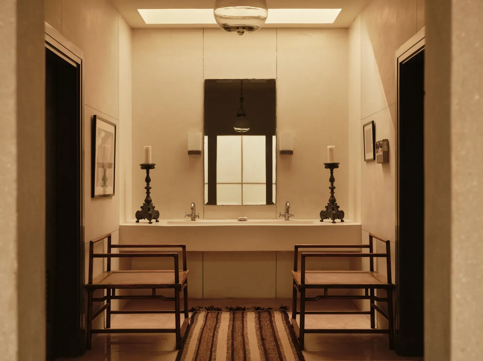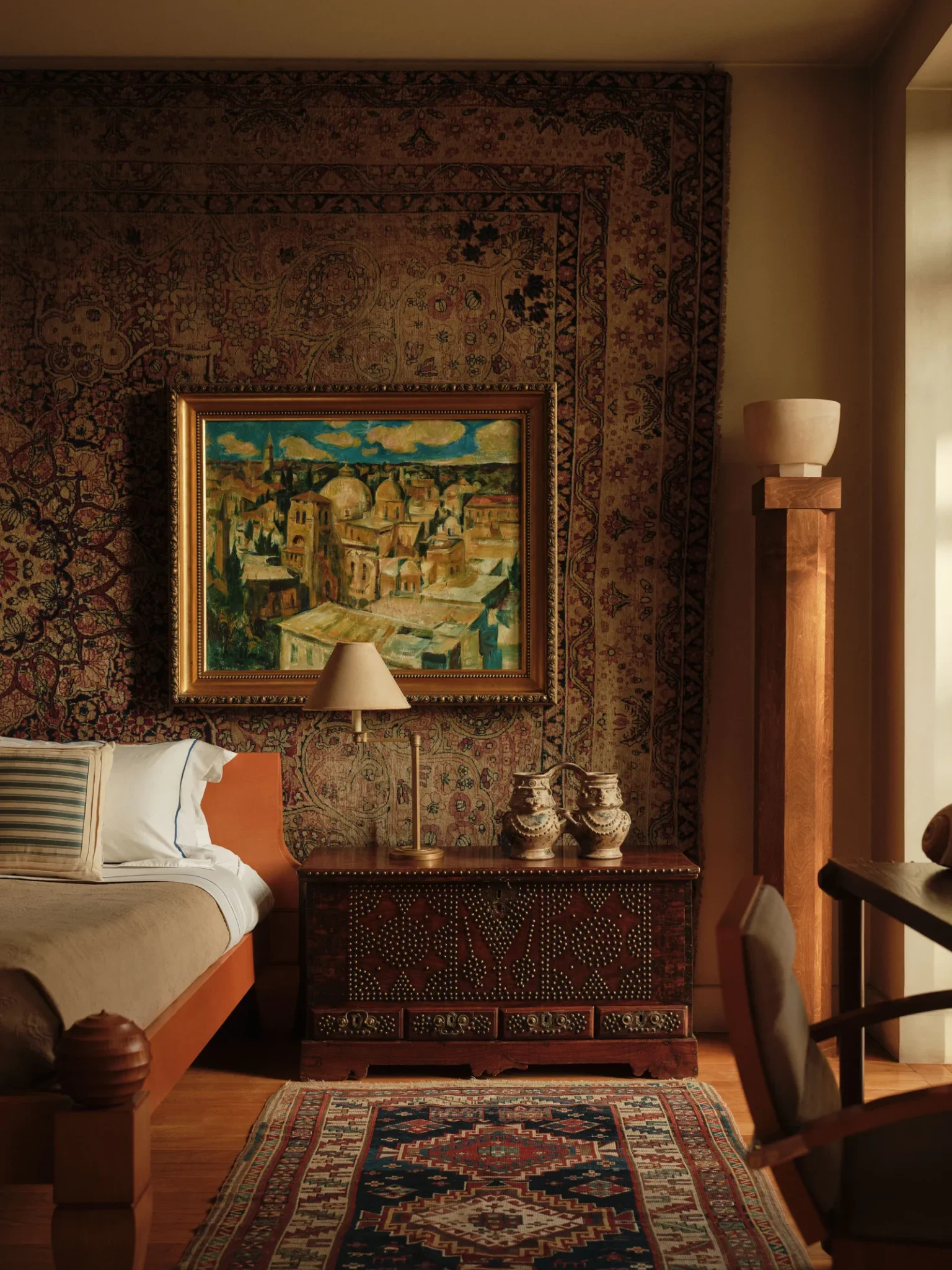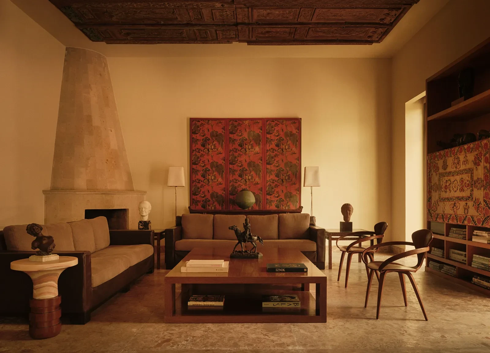 Αν και η αρχιτεκτονική γραφή παραμένει μινιμαλιστική, το εσωτερικό αποπνέει θερμότητα και ποικιλία. Αντικείμενα από διαφορετικές εποχές και τόπους διαμορφώνουν ένα σύνολο που μοιάζει με οικογενειακό χρονικό. Έπιπλα από την Αγγλία και την Κίνα, έργα τέχνης της αραβικής νεωτερικότητας, περίτεχνες ταπετσαρίες, αλλά και απλές καθημερινές λεπτομέρειες συνθέτουν ένα σκηνικό πλούσιο σε χαρακτήρα. Η κατοικία δεν επιδιώκει τον εντυπωσιασμό μέσα από τη συσσώρευση, αλλά τη δημιουργία ενός περιβάλλοντος που μιλά για τις μνήμες και τις διαδρομές των ανθρώπων της.