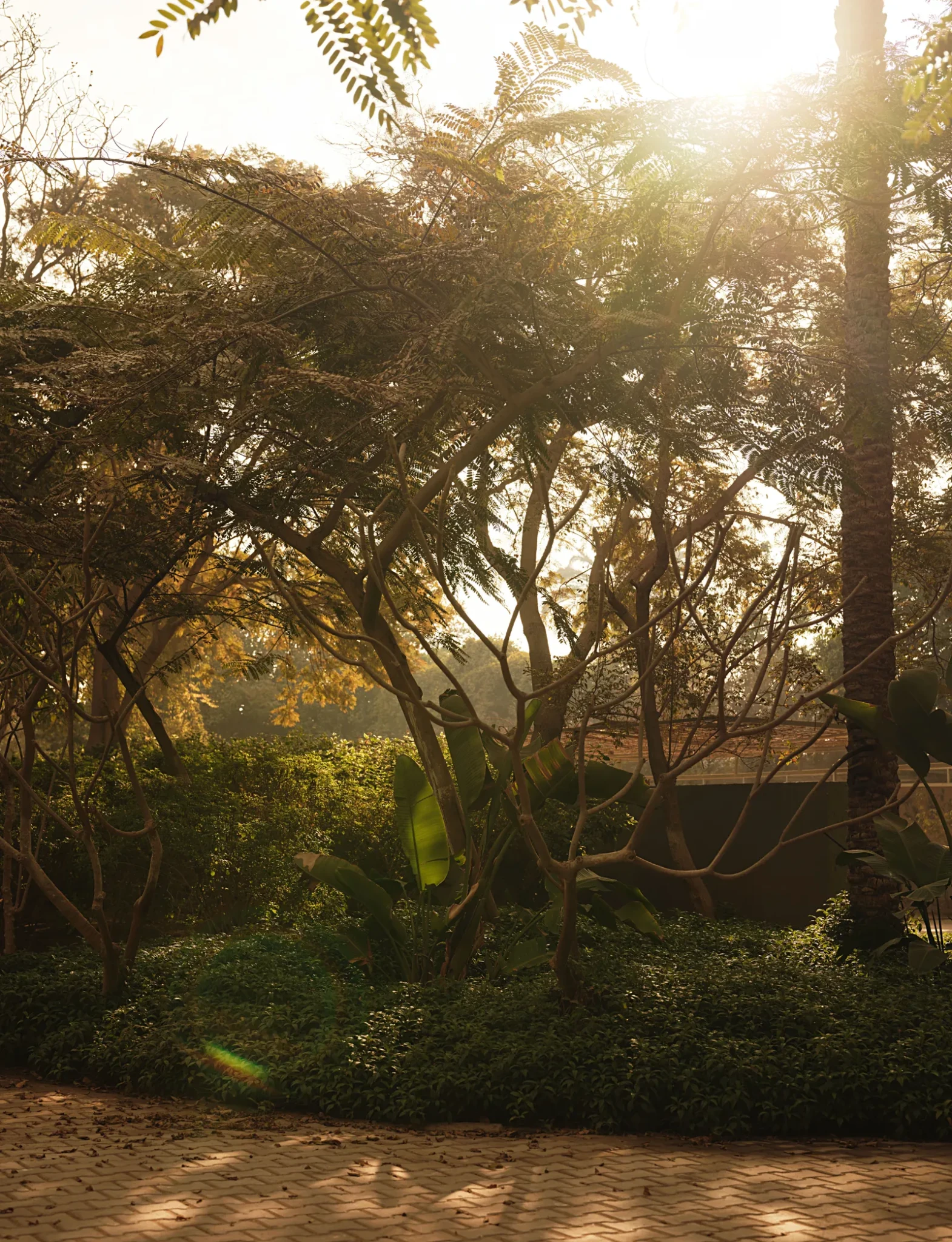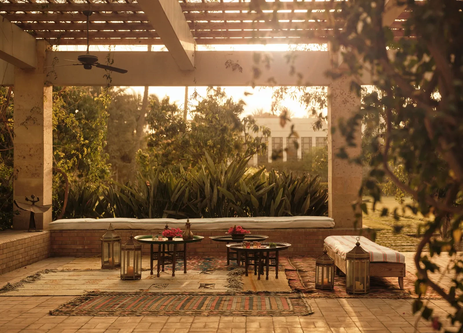 Η κατοικία αγκαλιάζεται από έναν κήπο που θυμίζει οάση. Η οικογένεια επέλεξε να διατηρήσει την παλιά φυτεία μάνγκο σχεδόν ανέπαφη, μετατρέποντάς την σε έναν κήπο-καταφύγιο. Τα δέντρα συνεχίζουν να αποδίδουν πλούσιους καρπούς, ενώ ανάμεσά τους αναπτύσσονται φοίνικες, φραγκοσυκιές, βουκαμβίλιες και φραγκομηλιές, δημιουργώντας ένα περιβάλλον γεμάτο χρώματα και αρώματα. Ο κήπος αποτελεί τόσο σκηνικό φιλοξενίας και γιορτής όσο και χώρο περισυλλογής, όπου η φύση μετατρέπεται σε πηγή έμπνευσης.