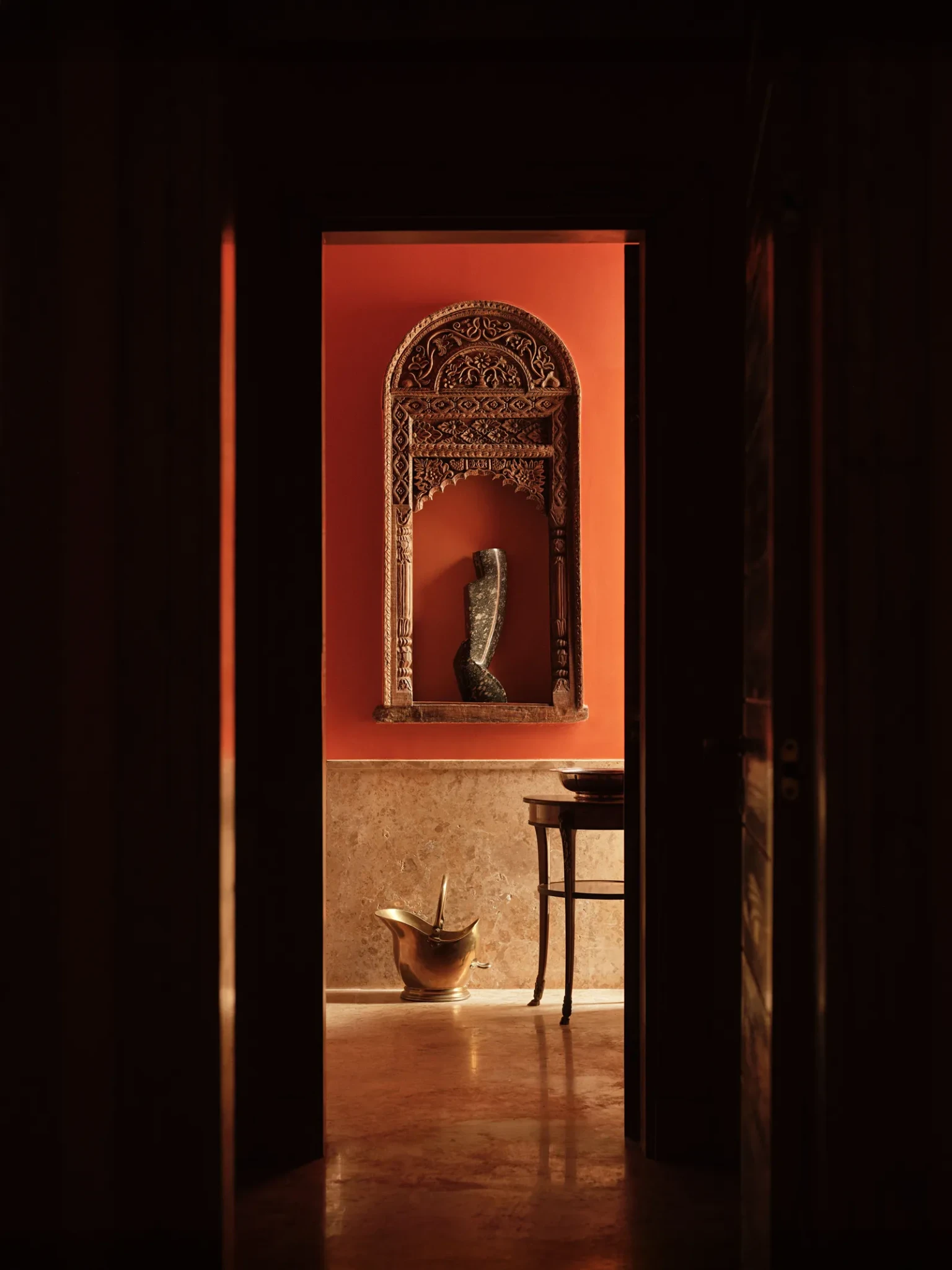 Η είσοδος στην κατοικία αποκαλύπτει αμέσως την κλίμακα της έμπνευσης. Ένα αίθριο διπλού ύψους, πλημμυρισμένο από φυσικό φως, πλαισιώνεται από μαρμάρινα δάπεδα και κοσμείται με πανύψηλους φοινίκες. Η κεντρική αυτή εστία λειτουργεί ως σύνδεσμος ανάμεσα στους υπόλοιπους χώρους. Από εκεί ξεκινά μια ακολουθία αιθουσών που θυμίζει την αρχιτεκτονική των φαραωνικών ναών: από τον ευρύχωρο χώρο της εσωτερικής πισίνας που ανοίγει προς τους κήπους, μέχρι τα καθιστικά, την προσωπική πτέρυγα του αρχιτέκτονα και τα υπνοδωμάτια του ορόφου. Το ταξίδι στο εσωτερικό γίνεται προοδευτικά πιο εσωστρεφές, με τους χώρους να μικραίνουν σε μέγεθος και να γίνονται πιο ιδιωτικοί, σαν μια τελετουργική μετάβαση από το δημόσιο στο προσωπικό.