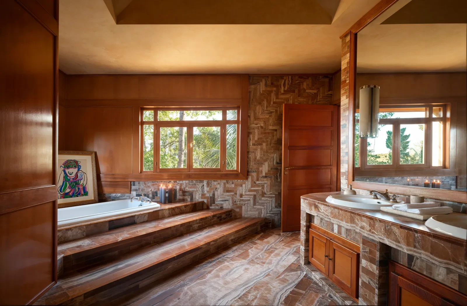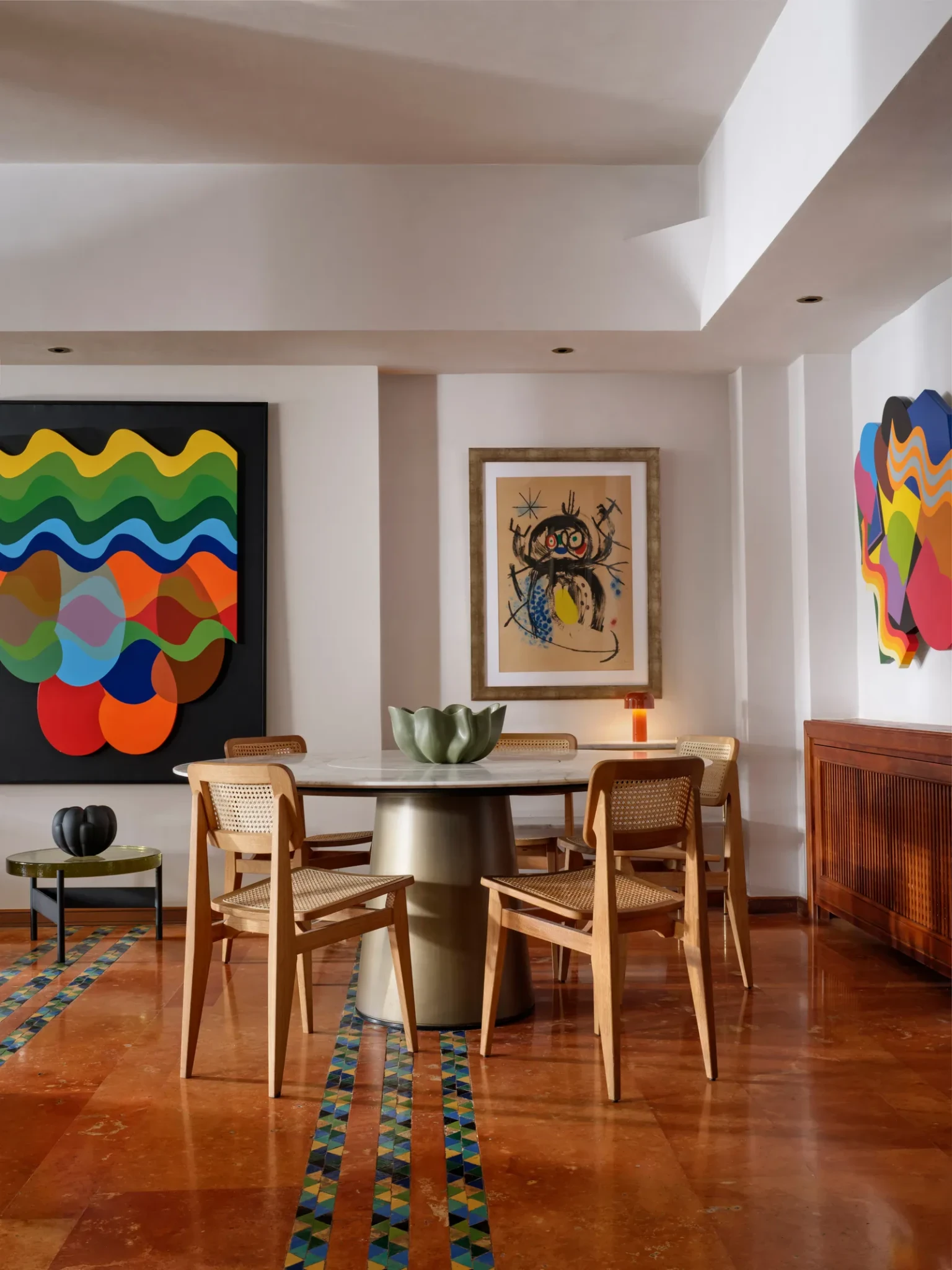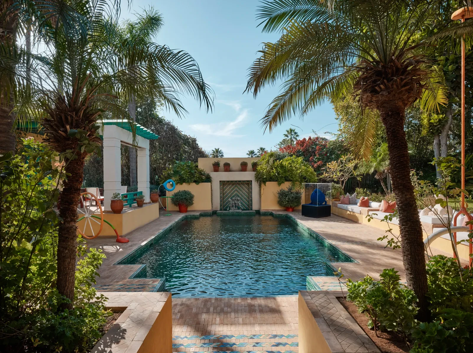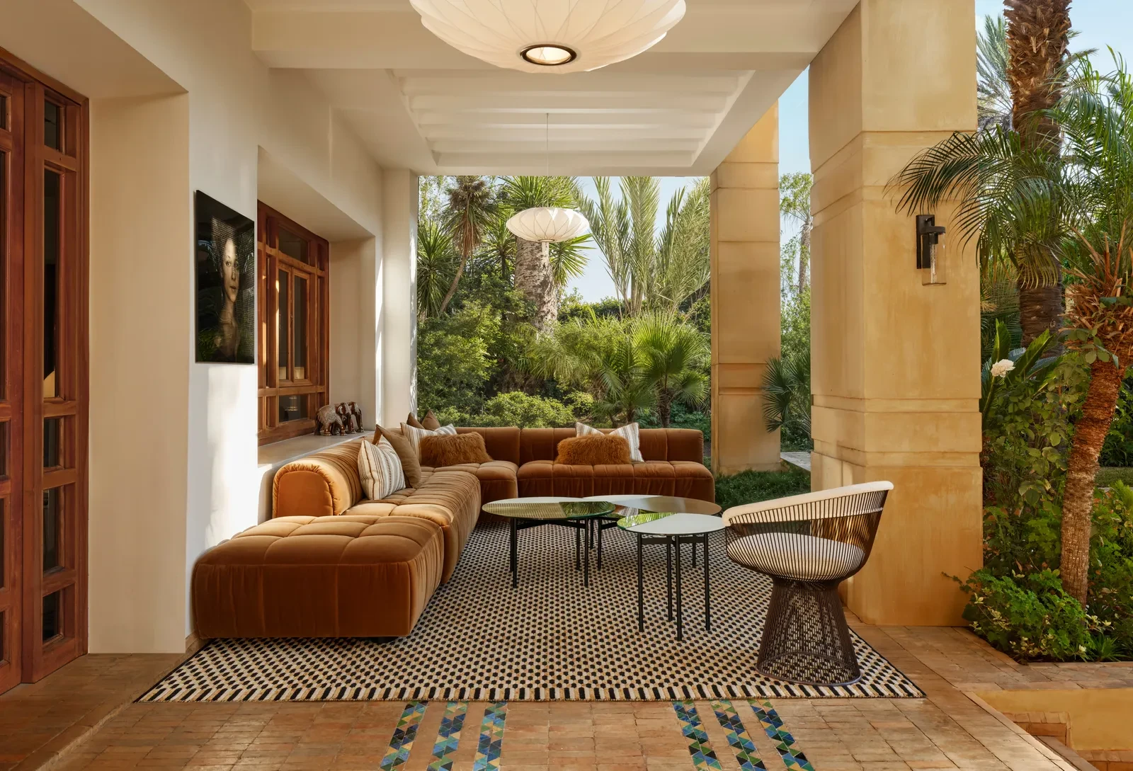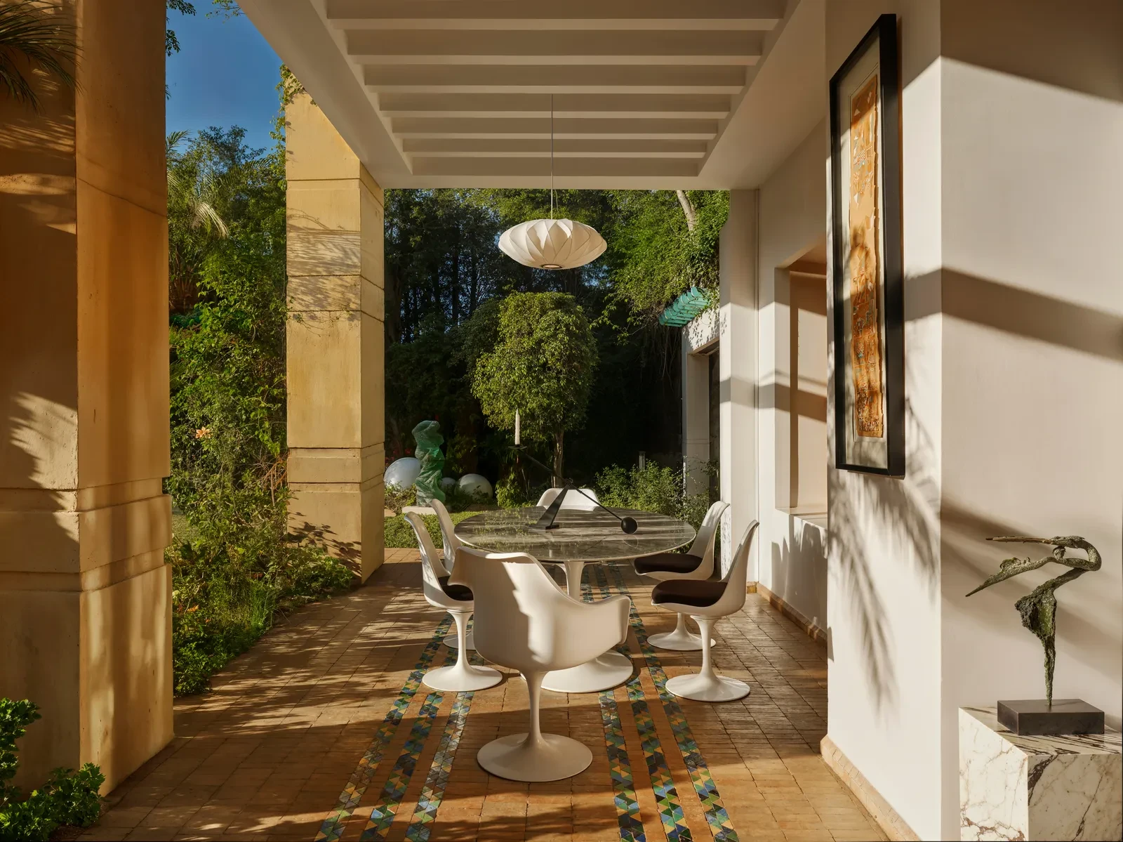 Η πρώτη εντύπωση του σπιτιού είναι η αίσθηση ηρεμίας που εκπέμπει κάθε γωνιά του. Οι ευρύχωροι χώροι του συνδυάζονται αρμονικά με έναν κήπο που πλημμυρίζει από τα κελαηδίσματα των πουλιών, ενώ οι τοίχοι καλύπτονται από έργα τέχνης που χαρίζουν μοναδική οπτική και συναισθηματική ταυτότητα. Η συλλογή περιλαμβάνει έργα κορυφαίων Μαροκινών δημιουργών όπως οι Mohamed Melehi, Chaïbia Talal, Mahi Binebine και Hassan El Glaoui, αλλά και διεθνών δασκάλων, όπως Picasso, Miró και Buffet. Κάθε κομμάτι τέχνης γίνεται πυρήνας της διακόσμησης, προσδίδοντας βάθος και προσωπικότητα στους χώρους.