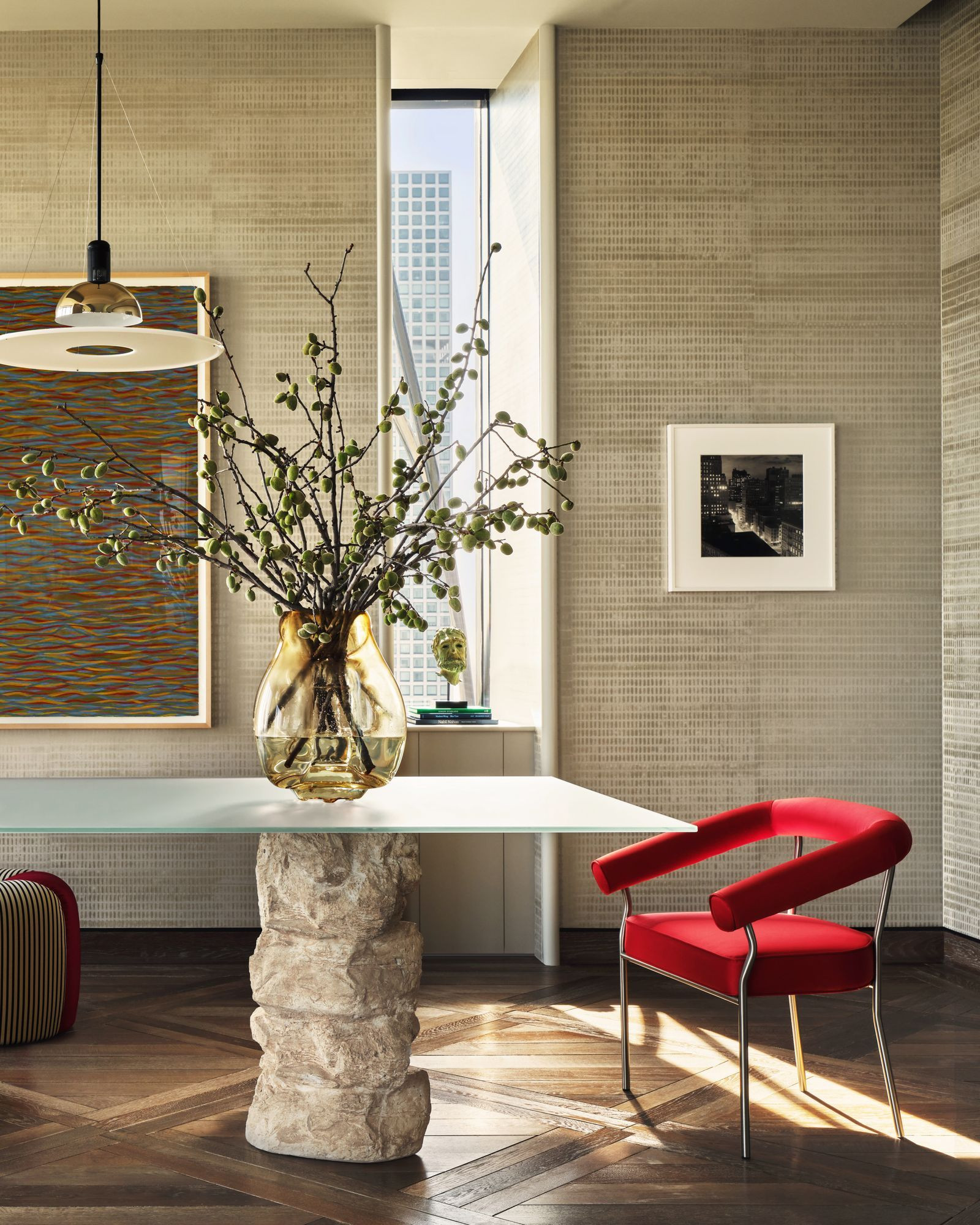 Στον 66ο όροφο του εμβληματικού ουρανοξύστη 111 W57th Street, ένα διαμέρισμα 360 τ.μ. εκτείνεται πάνω από τον ουρανό της Νέας Υόρκης, αποκαλύπτοντας έναν χώρο όπου η υψηλή αισθητική των 80s συναντά τη σύγχρονη κομψότητα. Σχεδιασμένο από τον Rafael de Cárdenas, το διαμέρισμα συνδυάζει αιχμηρές γραμμές, γυαλιστερές επιφάνειες και καλλιτεχνικά φινιρίσματα, δημιουργώντας μια ατμόσφαιρα δυναμική, μοντέρνα και ταυτόχρονα ζεστή και προσωπική.