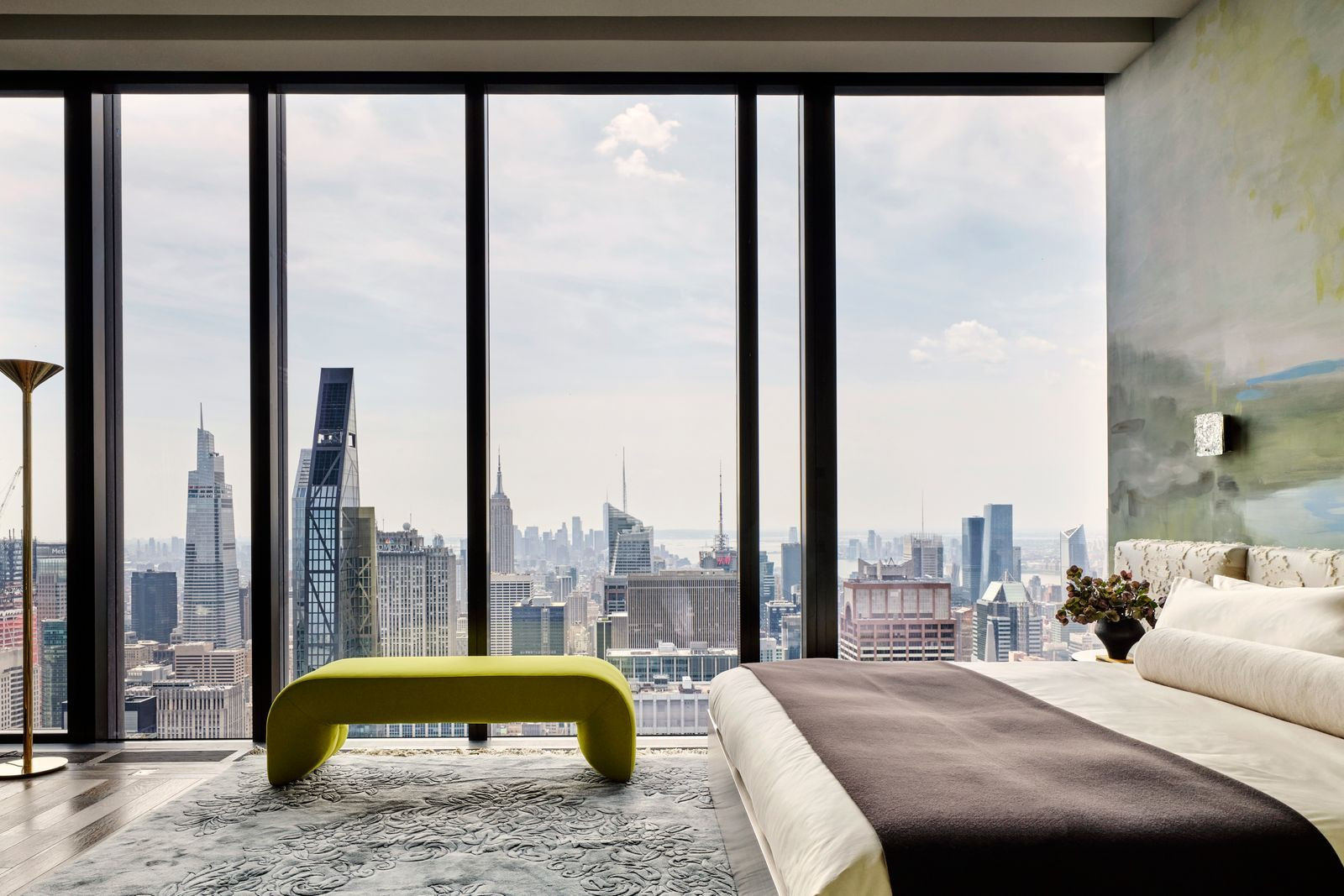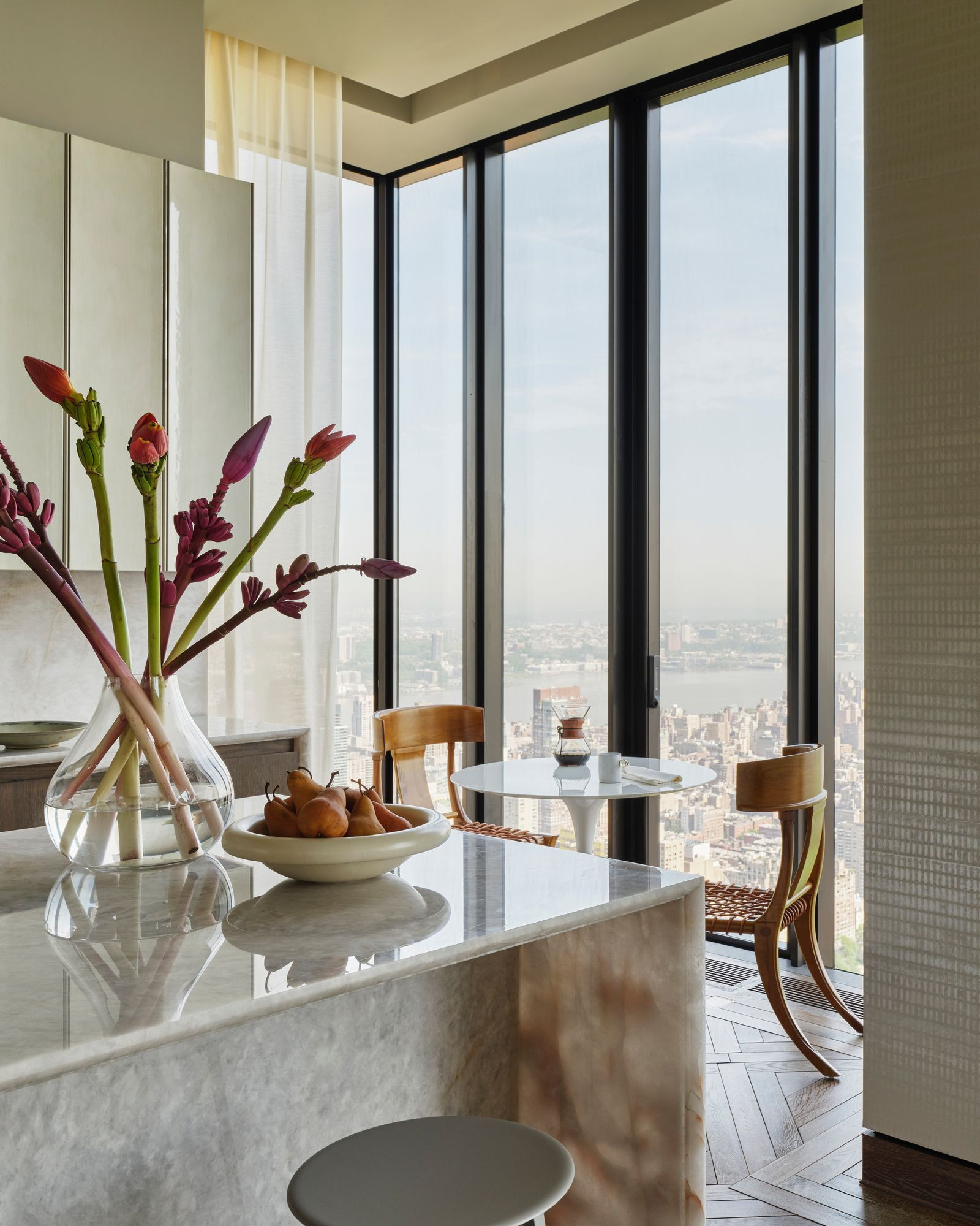 Η κατοικία καταλαμβάνει ολόκληρο τον όροφο και η αρχιτεκτονική του 111 W57th Street στενεύει προς τα πάνω, δίνοντας την αίσθηση ότι το διαμέρισμα αιωρείται πάνω από τη Νέα Υόρκη. Από τα παράθυρα διακρίνεται η μαγευτική θέα στο Central Park και την καρδιά του Midtown, ενώ οι γυάλινες επιφάνειες και τα τραπέζια-καθρέφτες αντανακλούν το εξωτερικό τοπίο, ενσωματώνοντας την πόλη μέσα στο σπίτι. Η διακόσμηση παραμένει λιτή και απέριττη, ώστε η θέα να παραμένει ο αδιαμφισβήτητος πρωταγωνιστής, προσφέροντας μια αίσθηση υπερυψωμένης μοναδικότητας και απομόνωσης από την καθημερινή φασαρία.