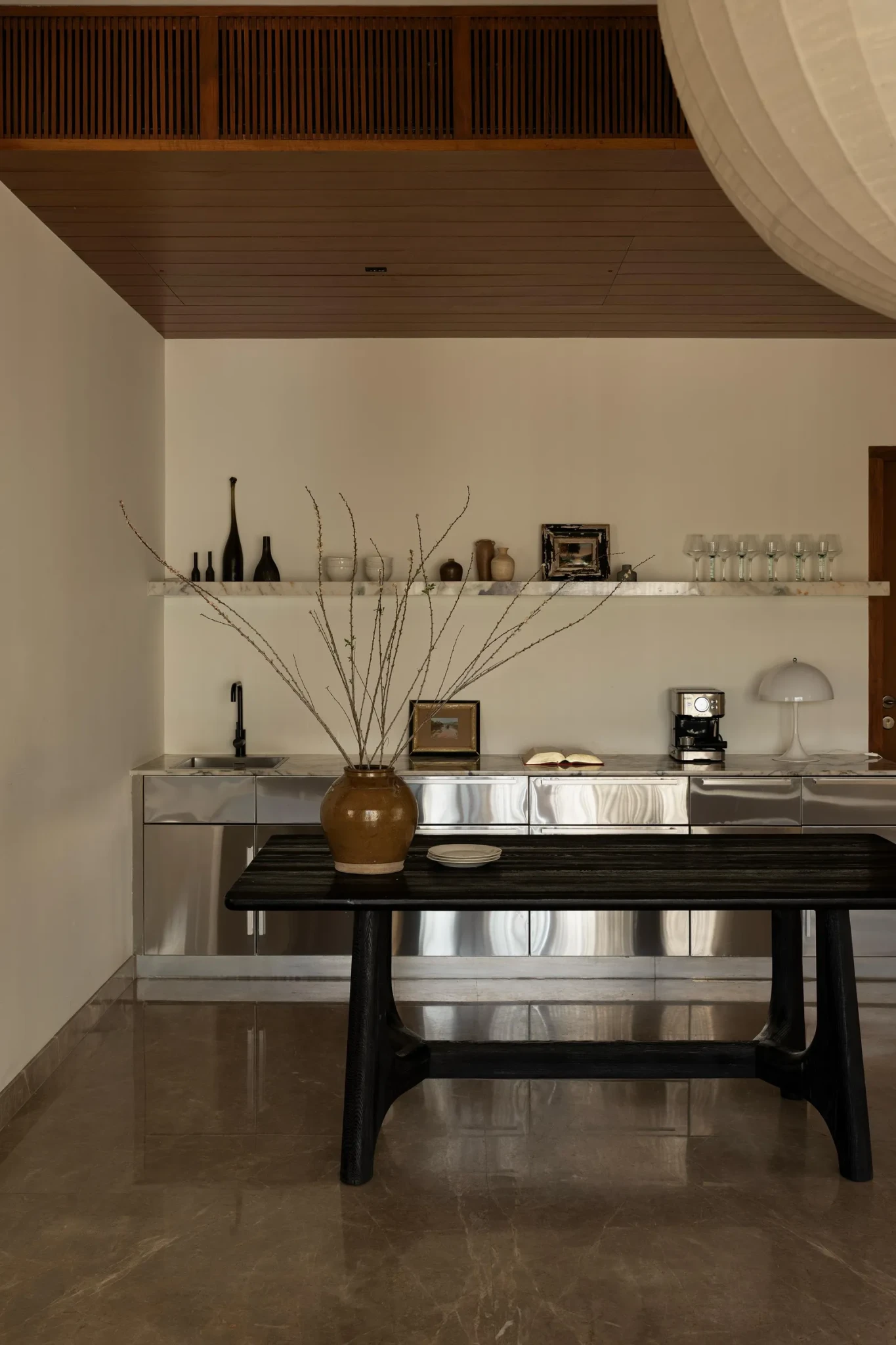 Η Adappa αντλεί έμπνευση από τις καθαρές γραμμές του mid-century: χαμηλές φόρμες, στιβαρά ξύλινα πλαίσια, γλυπτικές σιλουέτες. Η κατοικία αυτή δεν αναπαράγει μία εποχή, αλλά συνδυάζει διαφορετικούς χρόνους σε έναν συνεκτικό διάλογο. Vintage κομμάτια, custom ξυλουργικές κατασκευές και χειροποίητα έπιπλα συνθέτουν μια ασυμμετρία που λειτουργεί εκπληκτικά.