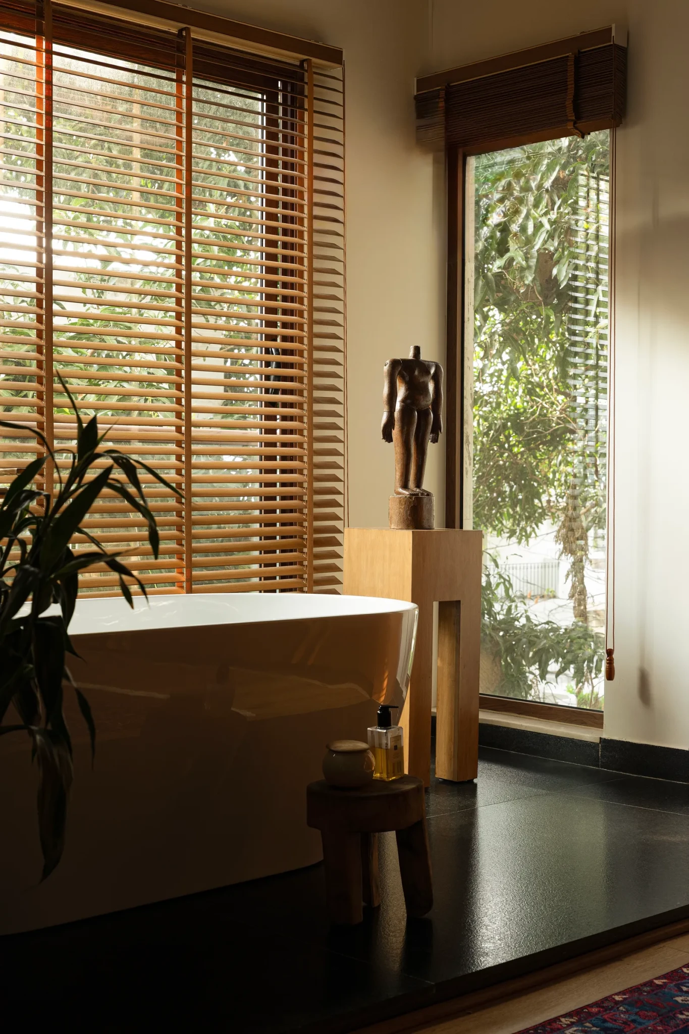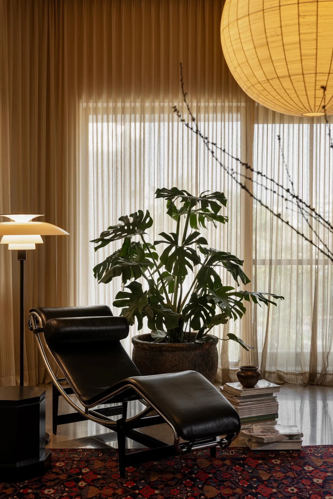 Τα χαλιά αποκτούν ιδιαίτερη σημασία στο design του σπιτιού. Flatweaves και χαμηλότριχες υφές, πολλά από αυτά από την Jaipur Rugs, προσθέτουν βάθος στους χώρους. Στο cocktail room ξεχωρίζει ένα περσικό χαλί εκατονταετίας, βαμμένο με φυσικές χρωστικές, που ισορροπεί μοναδικά με τη χαλύβδινη και δερμάτινη πολυθρόνα του Le Corbusier.