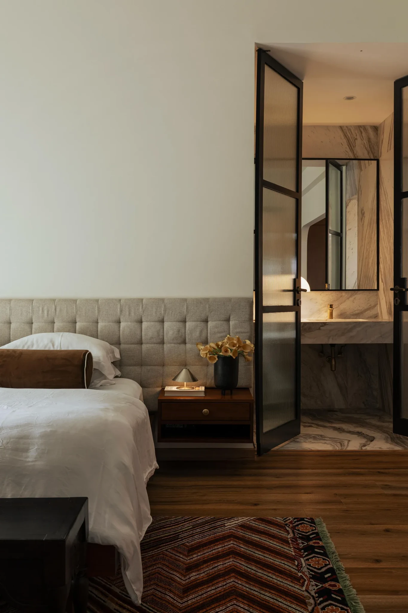 Απέναντι, η walk-in ντουλάπα, ενώ διπλές γυάλινες πόρτες οδηγούν σε ένα ensuite που θυμίζει spa. Μικρές γλυπτικές λεπτομέρειες, πράσινα στοιχεία και ξύλινα στόρια ενισχύουν τη φυσική άυρα του χώρου, προσθέτοντας διάσταση χωρίς υπερβολές.
