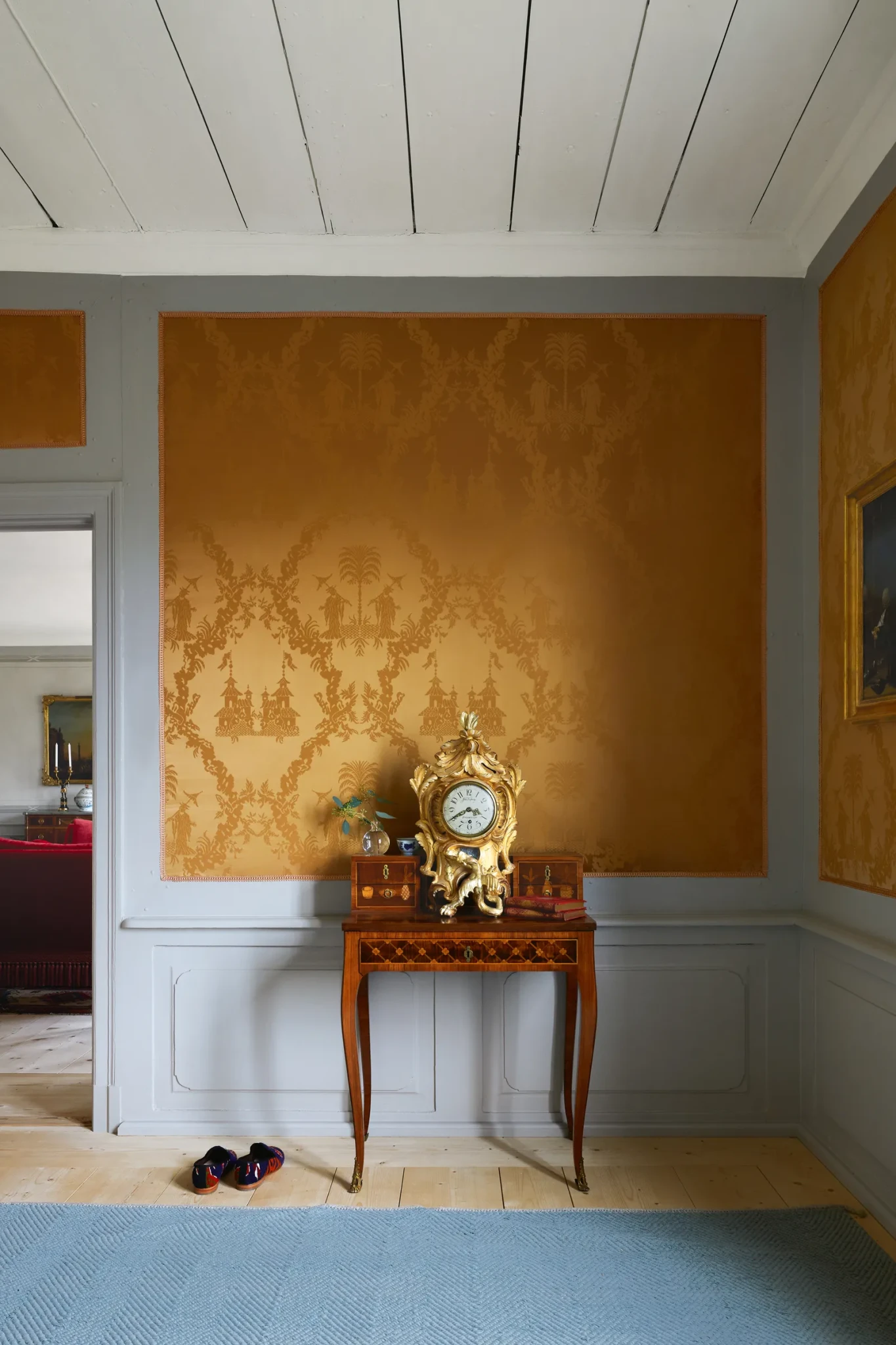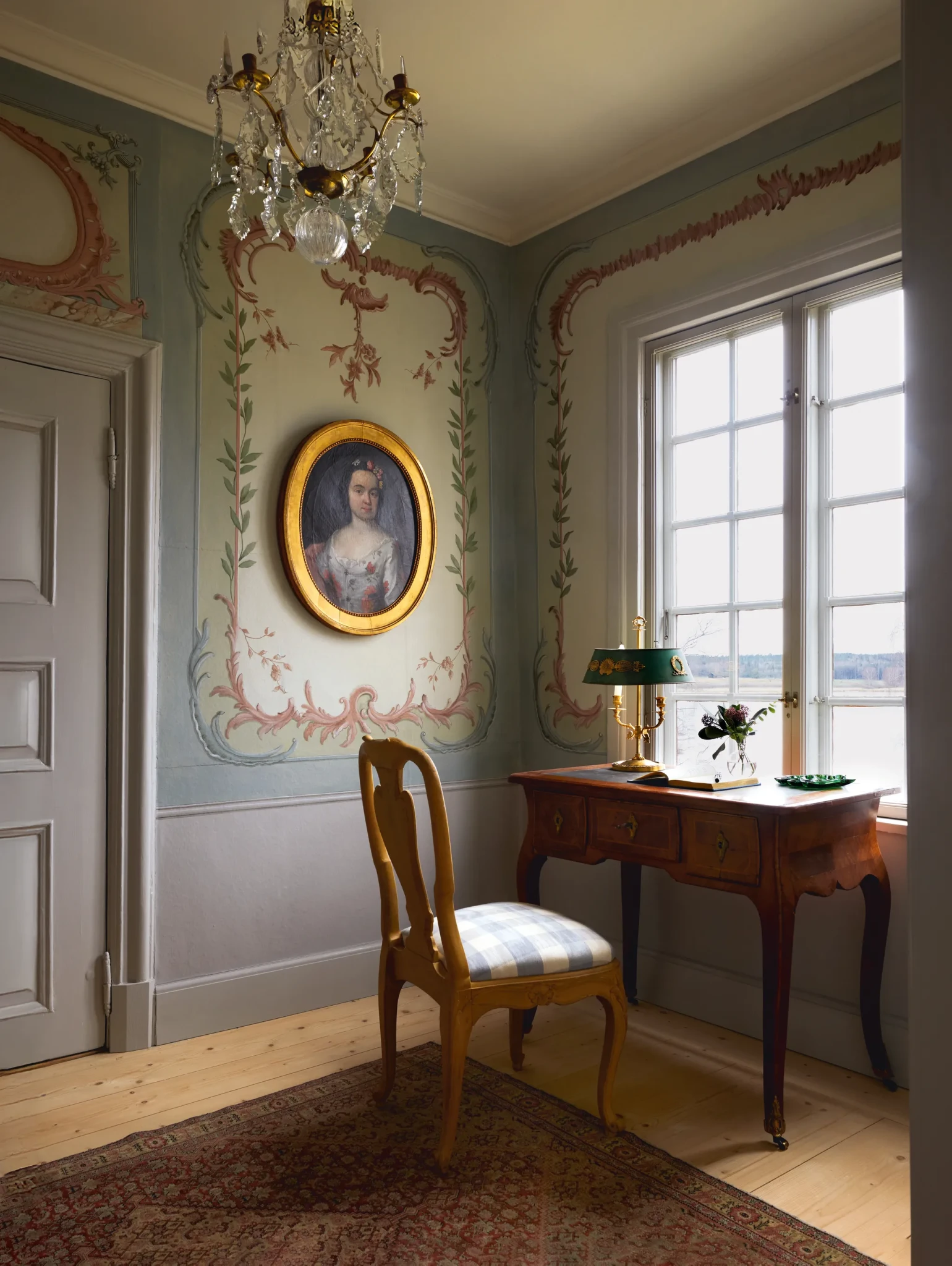 Το γραφείο του εξοχικού ντύθηκε από ένα τραπέζι και μια βαμμένη καρέκλα επίσης σε στιλ ροκοκό ροκοκό, η οποία επενδύθηκε με λινό ύφασμα "Broad Stripe" από τη συλλογή "Carskiey" της Fermoie. Τα έπιπλα τοποθετήθηκαν με τέτοιο τρόπο ώστε να αντικρίζουν τη θέα της λίμνης. Για άλλη μια φορά σχέδια ζωγραφισμένα από τους Abovo Antik & Ateljé παρουσιάζουν ένα πορτρέτο του 18ου αιώνα.