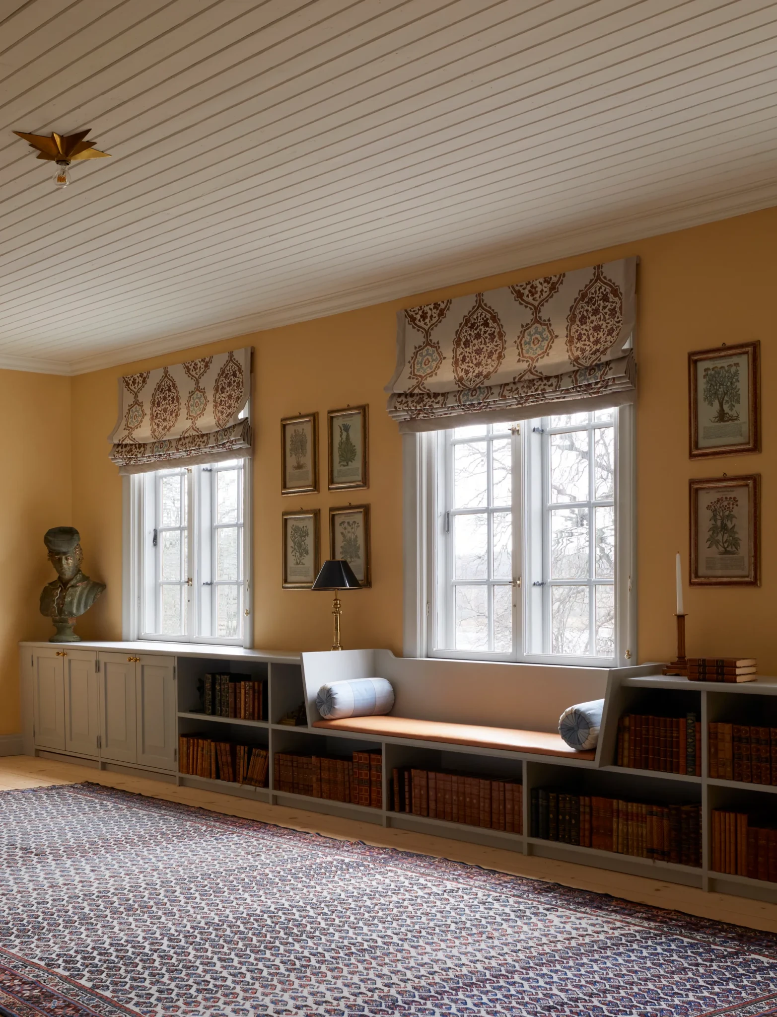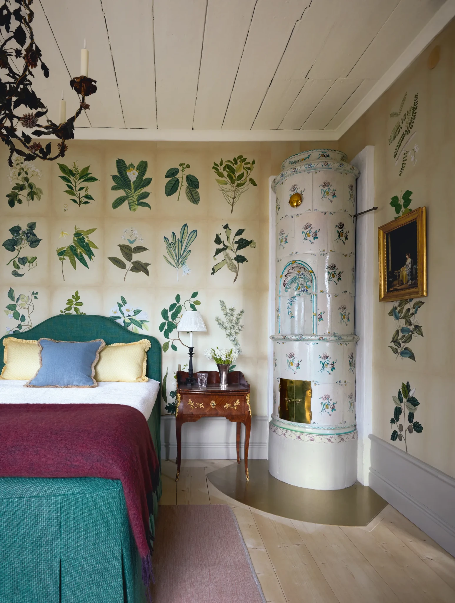 Το υπνοδωμάτιο του κάτω ορόφου έχει μία παραμυθένια νότα καθώς αντλεί έμπνευση από το Σουηδό βοτανολόγο Carl Linnaeus κι έτσι οι τοίχοι επενδύθηκαν από το έργο «Βοτανικές Σπουδές» του de Gournay. Το κρεβάτι είναι επενδυμένο με λινό ύφασμα «Mia» του Manuel Canovas και το ριχτάρι μοχέρ είναι από την Stackelbergs.
