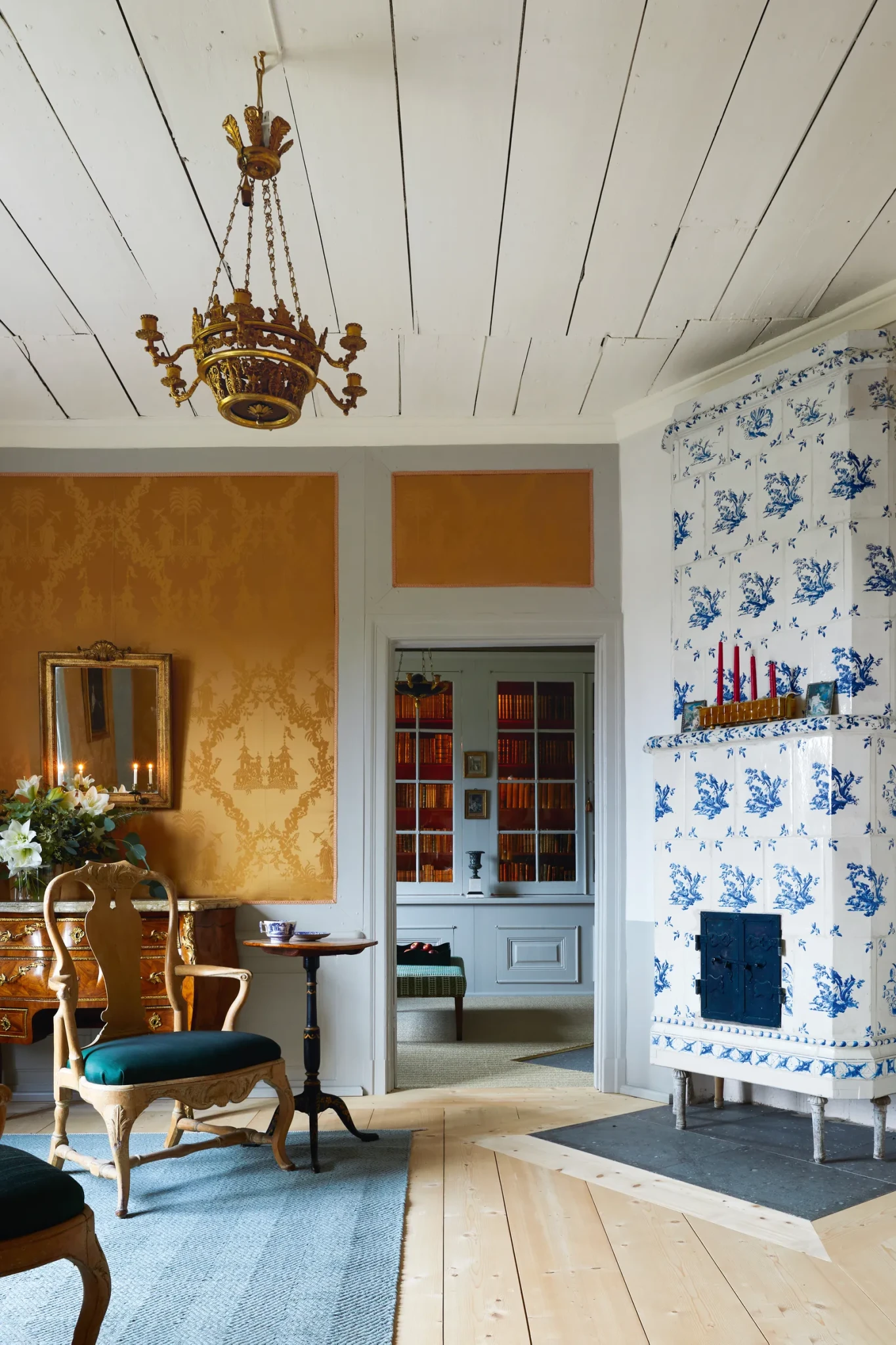 Στην κουζίνα τα πλακάκια του τοίχου είναι χειροποίητα Delft από την εταιρεία “Douglas Watson Studio”, στα οποία αποτυπώνονται τοπικές σκηνές από το γύρο περιβάλλον όπως ζώα και φυτά, ενώ οι ζωγράφοι από το στούντιο Abovo Antik & Ateljé ανέλαβαν να προσθέσουν μοτίβα και σκηνές πάνω από τις εσωτερικές πόρτες του σπιτιού.