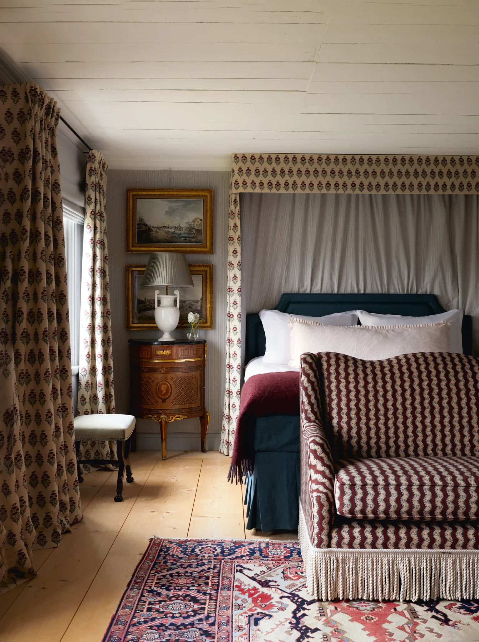 Από την άλλη, η master κρεβατοκάμαρα έχει τοίχους επενδυμένους με μαύρο βαμβάκι «Lining Stripe» από τον Ian Mankin, που αναδεικνύει το έντονο μοτίβο και τα πλούσια χρώματα του λινού «Field Poppy» που χρησιμοποιήθηκαν για το κουφώμα του κρεβατιού και τις κουρτίνες. και μείγμα βαμβακιού «Manousk» στον καναπέ με κρόσσια, και τα δύο από τον Robert Kime, και ένα αντίκα χαλί.