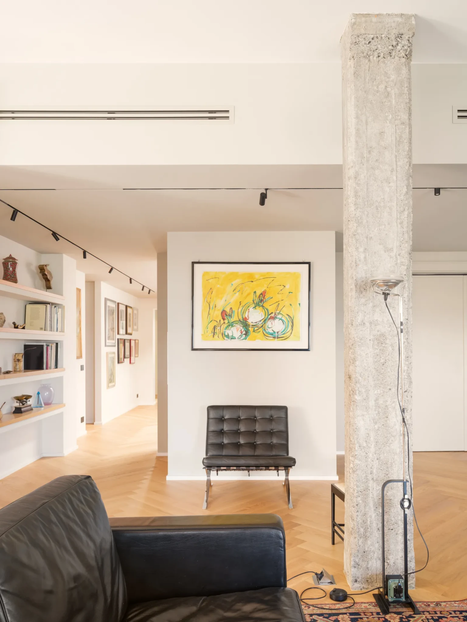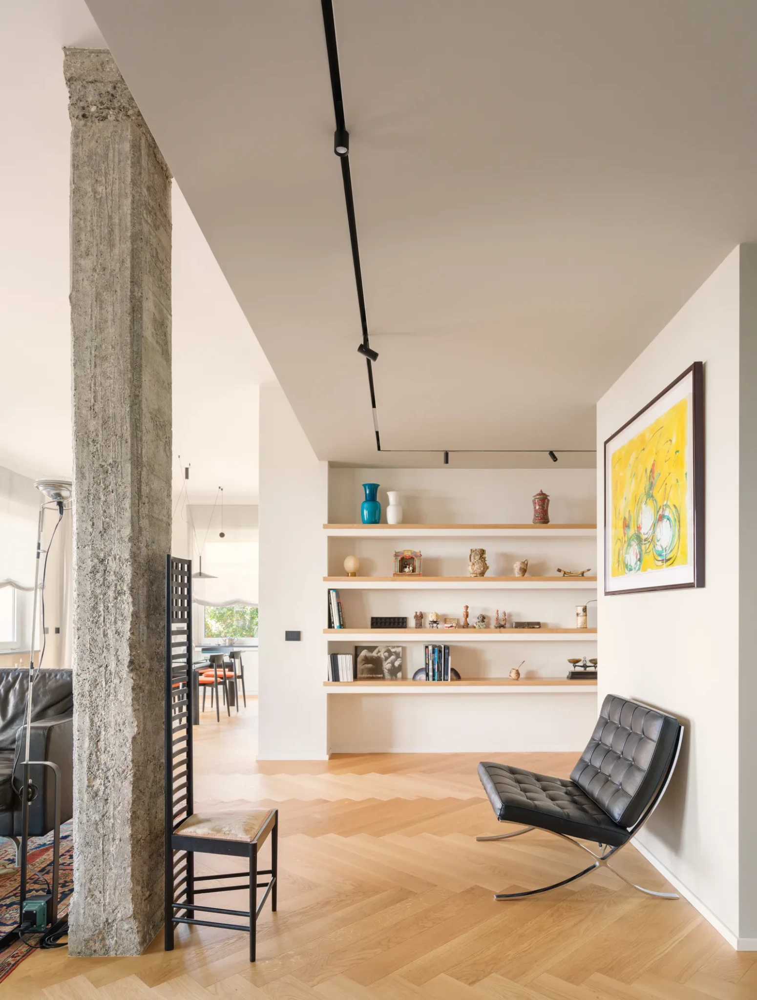 Η επίπλωση συνδυάζει σύγχρονα στοιχεία με εμβληματικά κομμάτια design. Καρέκλες όπως η Hill House και η Barcelona chair, μαζί με statement φωτιστικά και custom made βιβλιοθήκες από ξύλο δρυός, δημιουργούν ένα περιβάλλον που ισορροπεί ανάμεσα στην κομψότητα και την άνεση. Στο καθιστικό, οι καθαρές γραμμές των επίπλων αφήνουν χώρο στην τέχνη να πρωταγωνιστήσει, με έργα που λειτουργούν ως σημεία ενδιαφέροντος, χωρίς να βαραίνουν τον χώρο. Η συνολική σύνθεση παραμένει ανάλαφρη, επιτρέποντας στο φως να είναι ο βασικός «διακοσμητής».