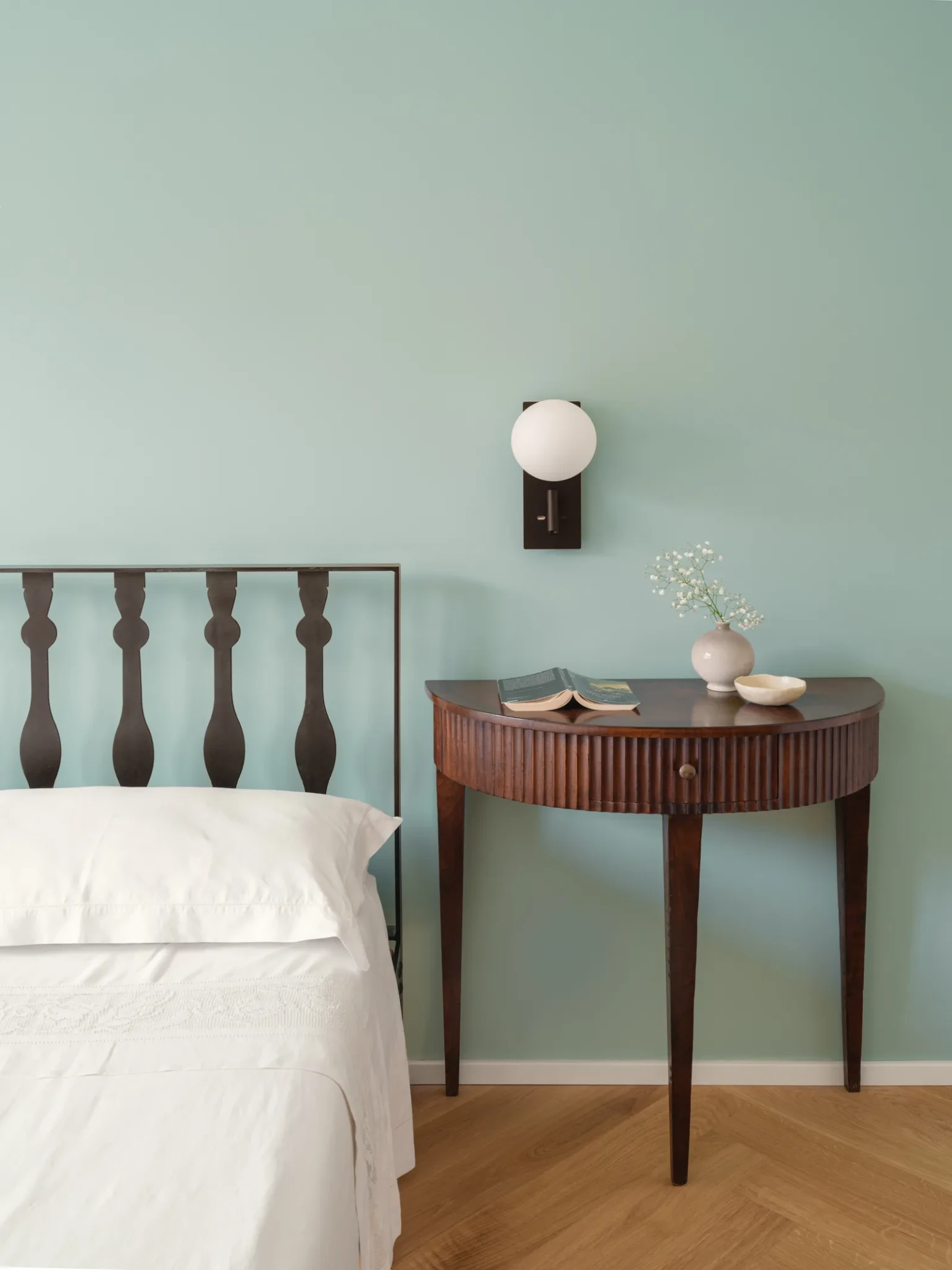 Σε αντίθεση με την αναμενόμενη κυριαρχία του μπλε, η χρωματική ταυτότητα του σπιτιού κινείται σε πιο σύνθετες αποχρώσεις. Το απαλό, «σκονισμένο» πράσινο στους τοίχους λειτουργεί ως φίλτρο που εξισορροπεί την ένταση της θάλασσας, ενώ οι θερμοί τόνοι του ξύλου προσθέτουν βάθος και οικειότητα στον χώρο.Το χρώμα δεν χρησιμοποιείται ως διακόσμηση, αλλά ως εργαλείο που δημιουργεί συναισθήματα και συνδέσεις. Κάθε απόχρωση επιλέχθηκε με βάση τον τρόπο που αντιδρά στο φυσικό φως, δημιουργώντας μια διαρκή αλληλεπίδραση ανάμεσα στο σπίτι και το περιβάλλον.