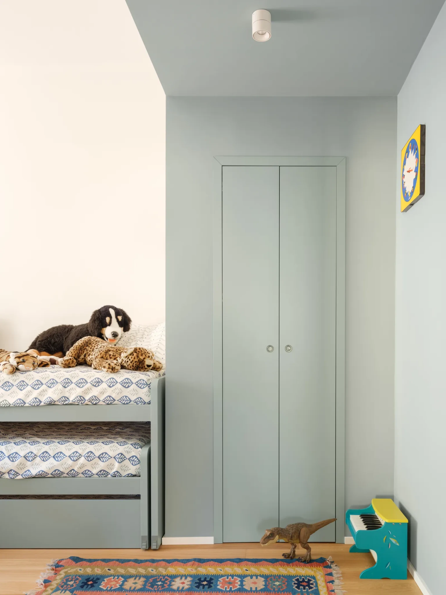Στην αντίθετη πλευρά του σπιτιού, τα υπνοδωμάτια υιοθετούν μια πιο ήπια αισθητική. Οι παστέλ αποχρώσεις, τα φυσικά υλικά και το παρκέ σε σχέδιο ψαροκόκαλο δημιουργούν ένα περιβάλλον που ευνοεί την ηρεμία. Η μετάβαση από τους ανοιχτούς, κοινωνικούς χώρους στους πιο ιδιωτικούς γίνεται σχεδόν ανεπαίσθητα, διατηρώντας τη συνοχή της κατοικίας.