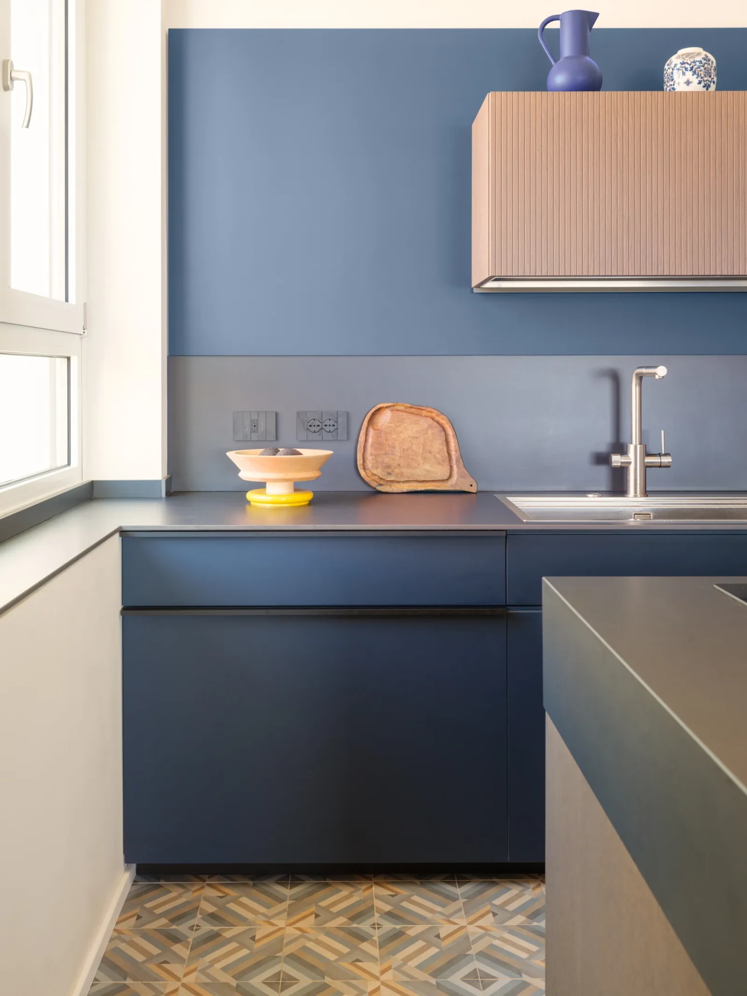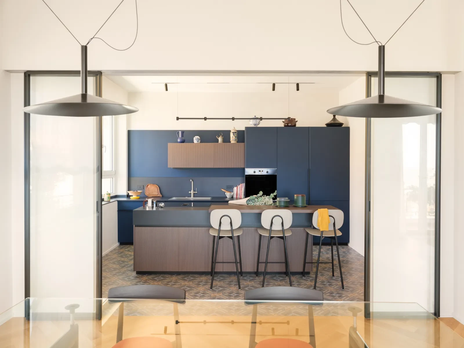 Η κουζίνα ενσωματώνεται οργανικά στον χώρο, χωρισμένη από το καθιστικό μέσω μιας γυάλινης συρόμενης επιφάνειας με μεταλλικό πλαίσιο. Η επιλογή αυτή δεν περιορίζει, αλλά ενισχύει τη φυσική ροή, επιτρέποντας στον χώρο να μετασχηματίζεται ανάλογα με τη χρήση. Τα υλικά όπως τα κεραμικά πλακάκια, οι μεταλλικές λεπτομέρειες και τα σύγχρονα φωτιστικά, δημιουργούν μια ισορροπία ανάμεσα στη λειτουργικότητα και την αισθητική καθαρότητα.