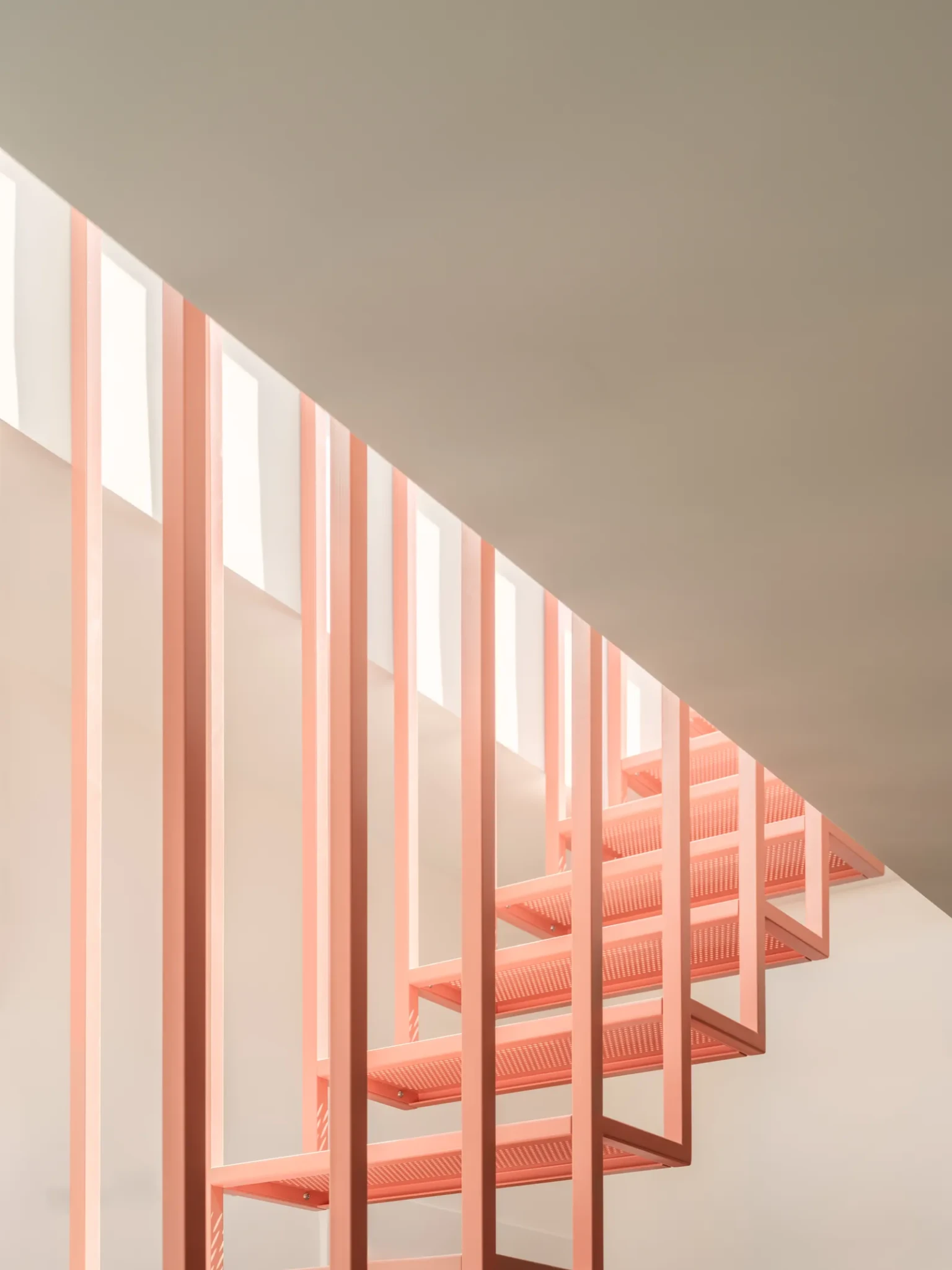 Ανάμεσα σε όλες τις λεπτομέρειες, η σκάλα ξεχωρίζει ως το πιο τολμηρό στοιχείο. Κατασκευασμένη από μέταλλο και βαμμένη σε ροζ κοραλλί απόχρωση, λειτουργεί ως ένα απροσδόκητο σημείο έντασης μέσα στον χώρο. Σε αντίθεση με τον πράσινο σχιστόλιθο που τη συνοδεύει, δημιουργεί μια δυναμική αντίθεση που δεν διασπά την υπάρχουσα αρμονία, αλλά την ενισχύει. Περισσότερο από ένα λειτουργικό στοιχείο, γίνεται μια εμπειρία μετάβασης από το εσωτερικό προς την κορυφαία στιγμή του σπιτιού, τη βεράντα.