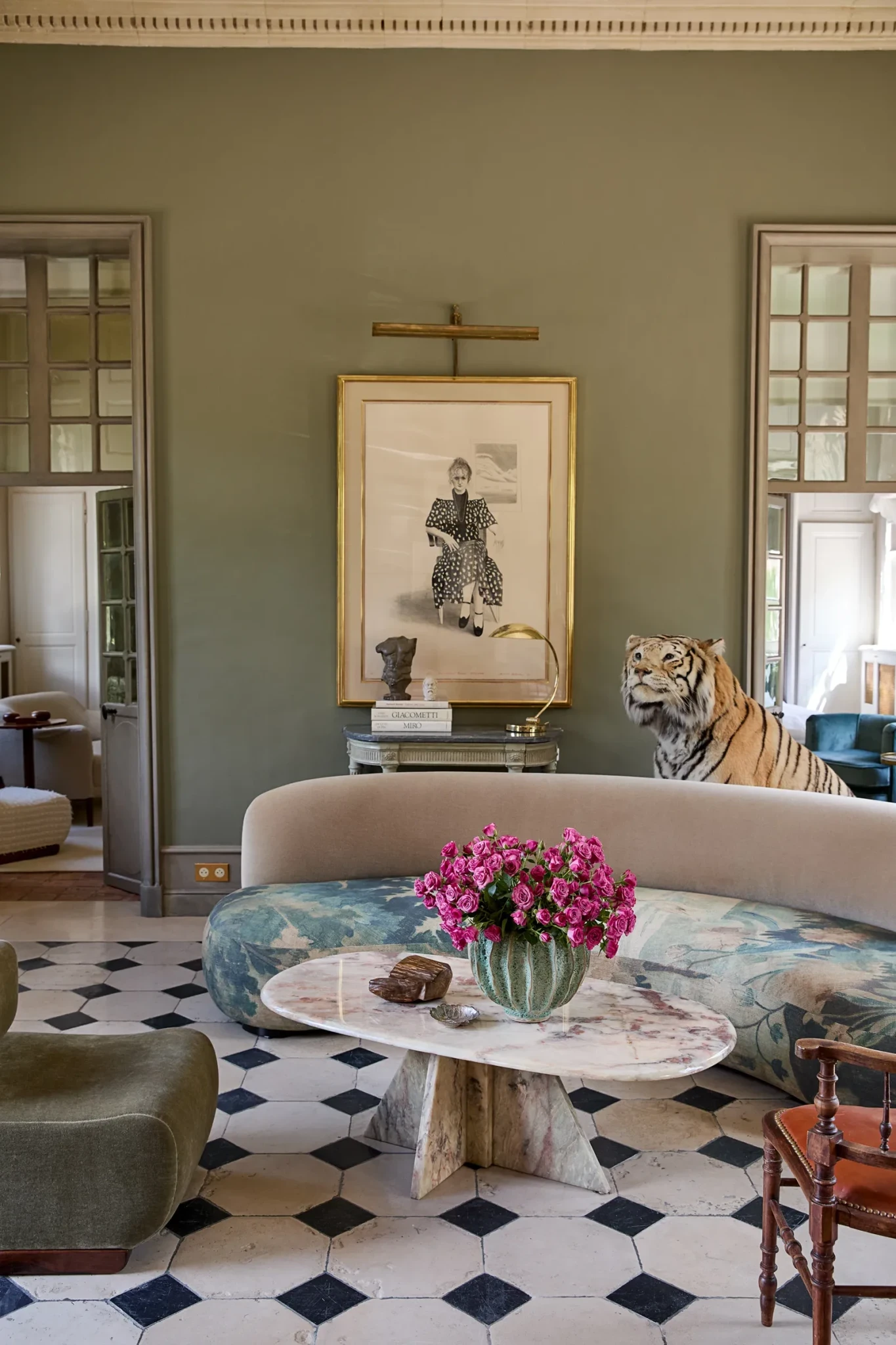 Το εσωτερικό του château ξεχωρίζει για τον τρόπο με τον οποίο συνδυάζονται διαφορετικές εποχές του design. Κομμάτια του 20ού αιώνα τοποθετούνται δίπλα σε παραδοσιακά έπιπλα, δημιουργώντας έναν ενδιαφέροντα διάλογο ανάμεσα στο παλιό και το νέο.