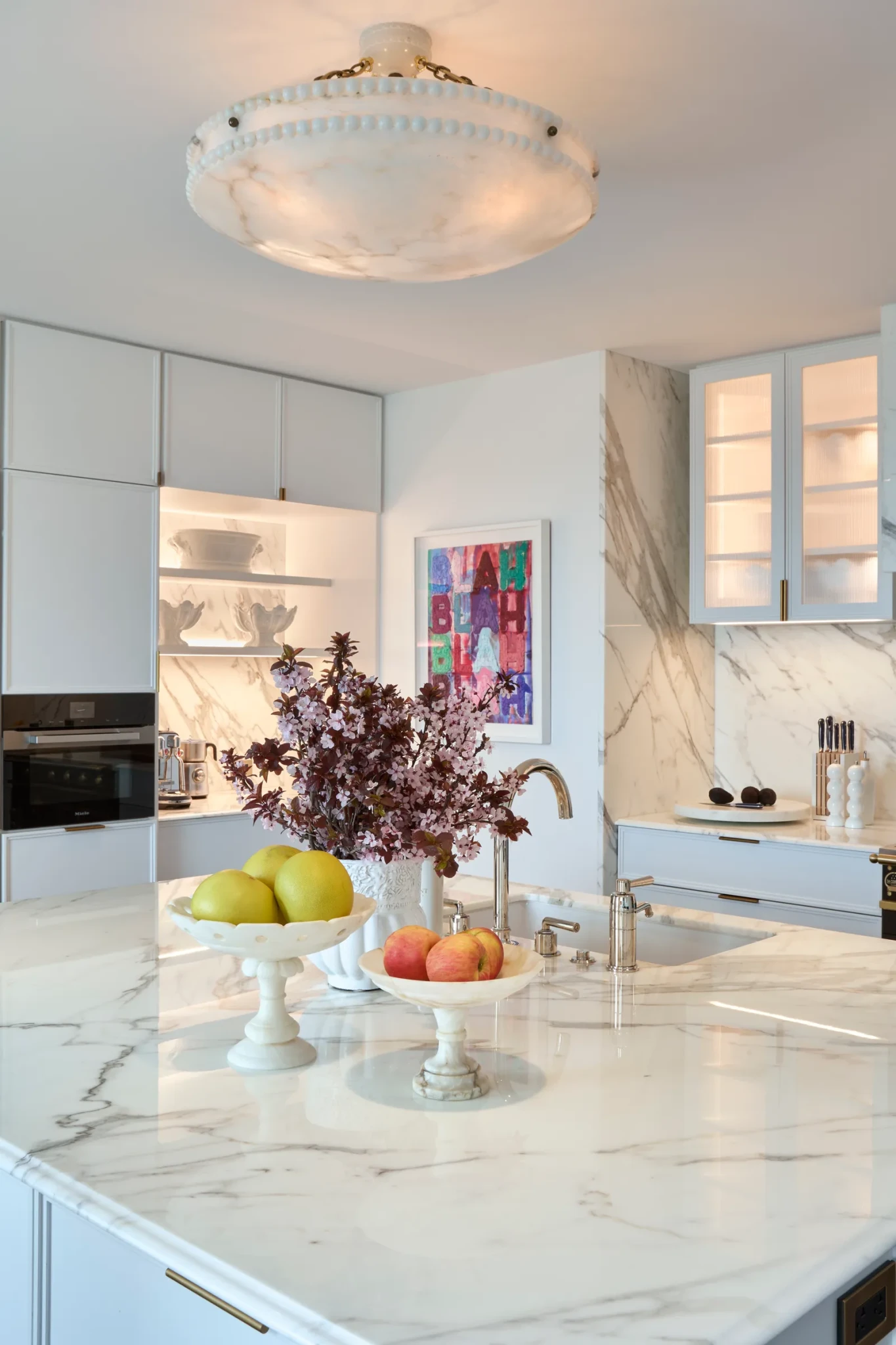 Τα ντουλάπια και τα ράφια της κουζίνας είναι γυάλινα και διακρίνονται από κρυφό φωτισμό, ενώ συμπληρώνονται με στοιχεία από λευκό μάρμαρο και ορείχαλκο.