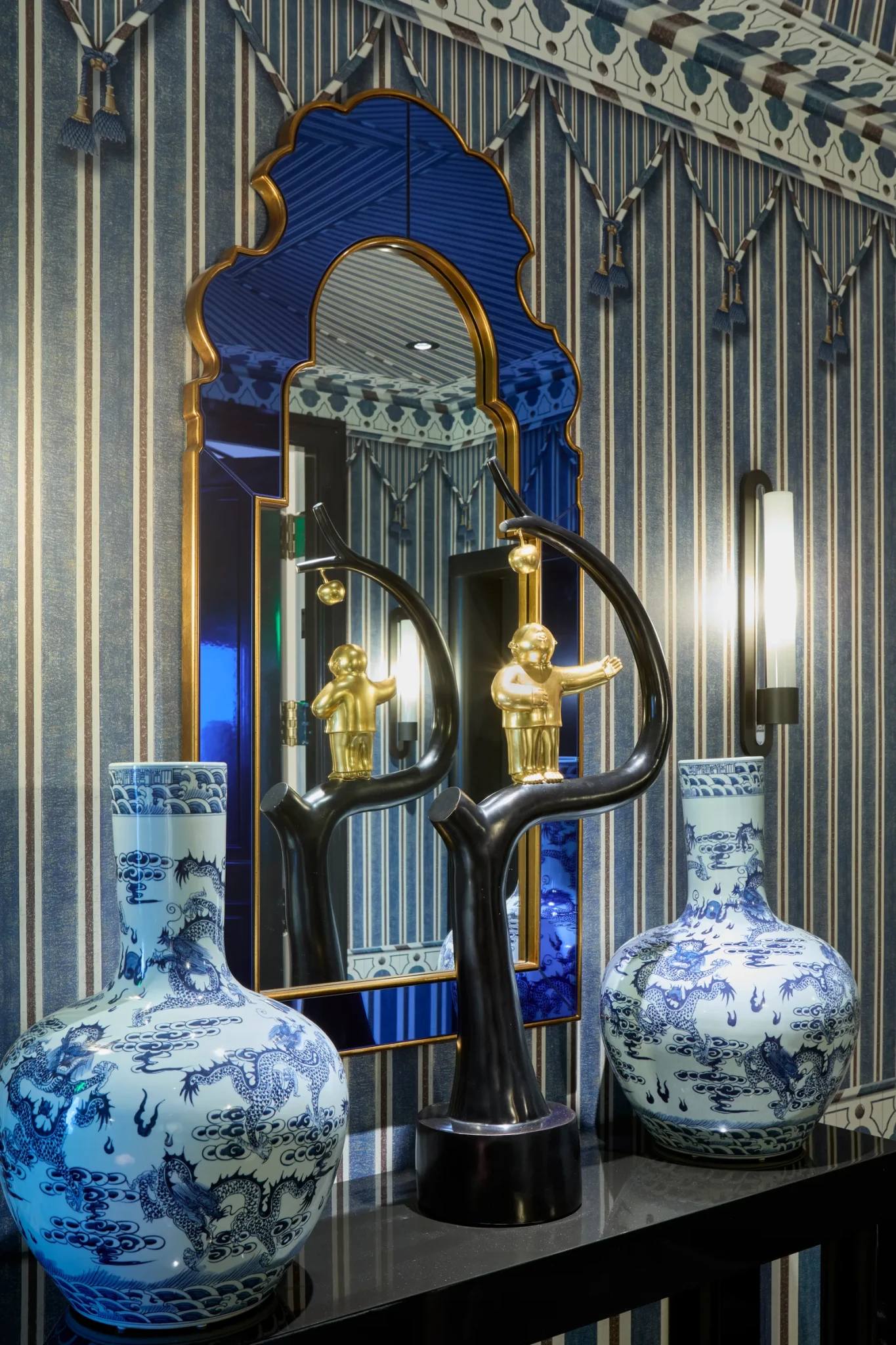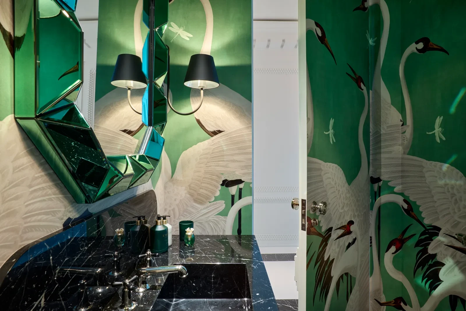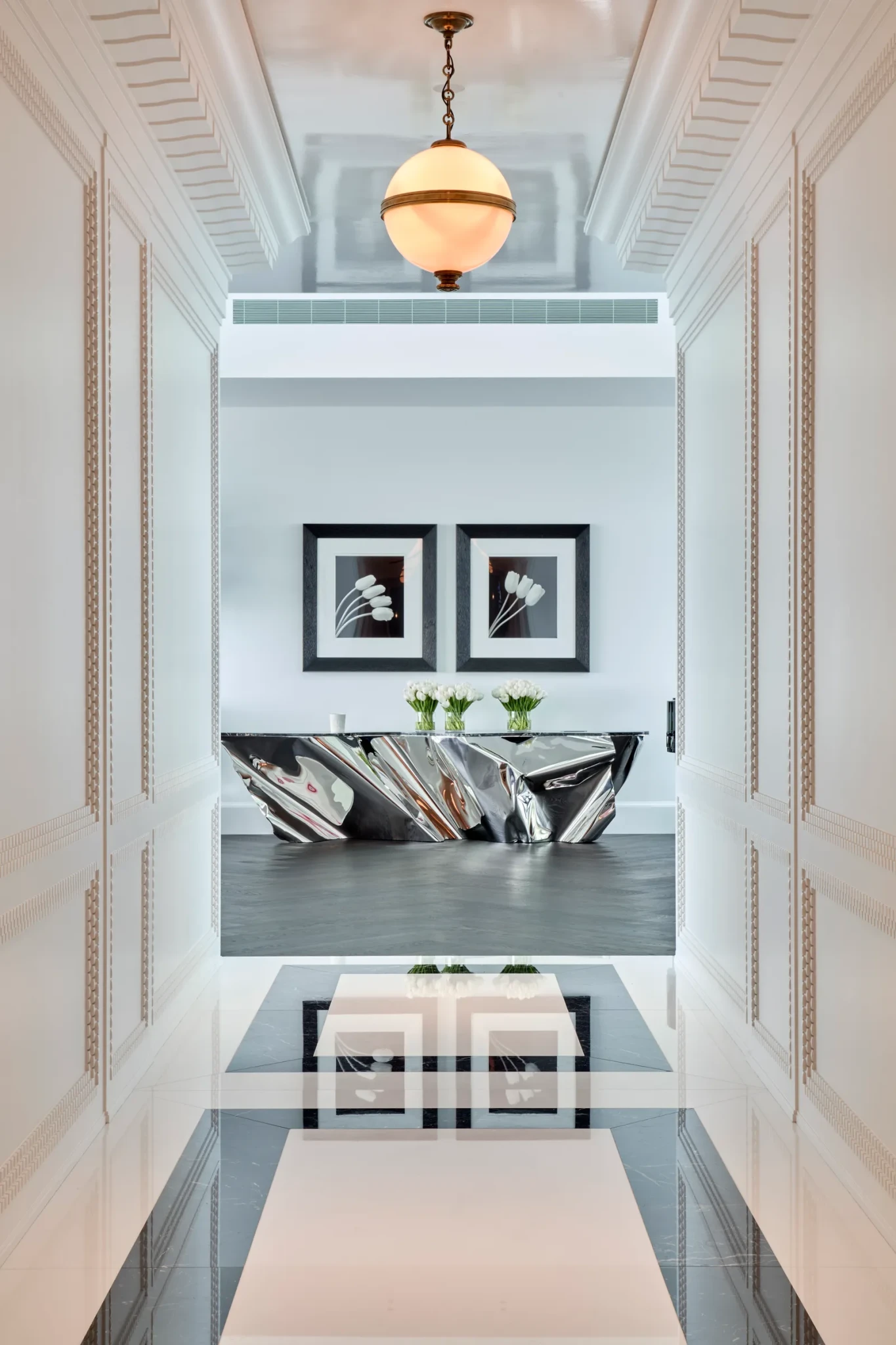 Ξεκινώντας από την είσοδο που δημιουργήθηκε με σκοπό την αίσθηση της δραματικότητας: ένας διάδρομος επενδυμένος με κομψά πάνελ από την Féau Boiseries στο Παρίσι, όπου κρύβεται μια πόρτα που οδηγεί στην τουαλέτα, της οποίας οι τοίχοι είναι επενδυμένοι με ταπετσαρία Gucci. Κρεμαστά φανάρια Jamb, ένα γραφικό ασπρόμαυρο μαρμάρινο δάπεδο και μια ριγέ ταπετσαρία από την Iksel οδηγούν στο υπόλοιπο σπίτι.
